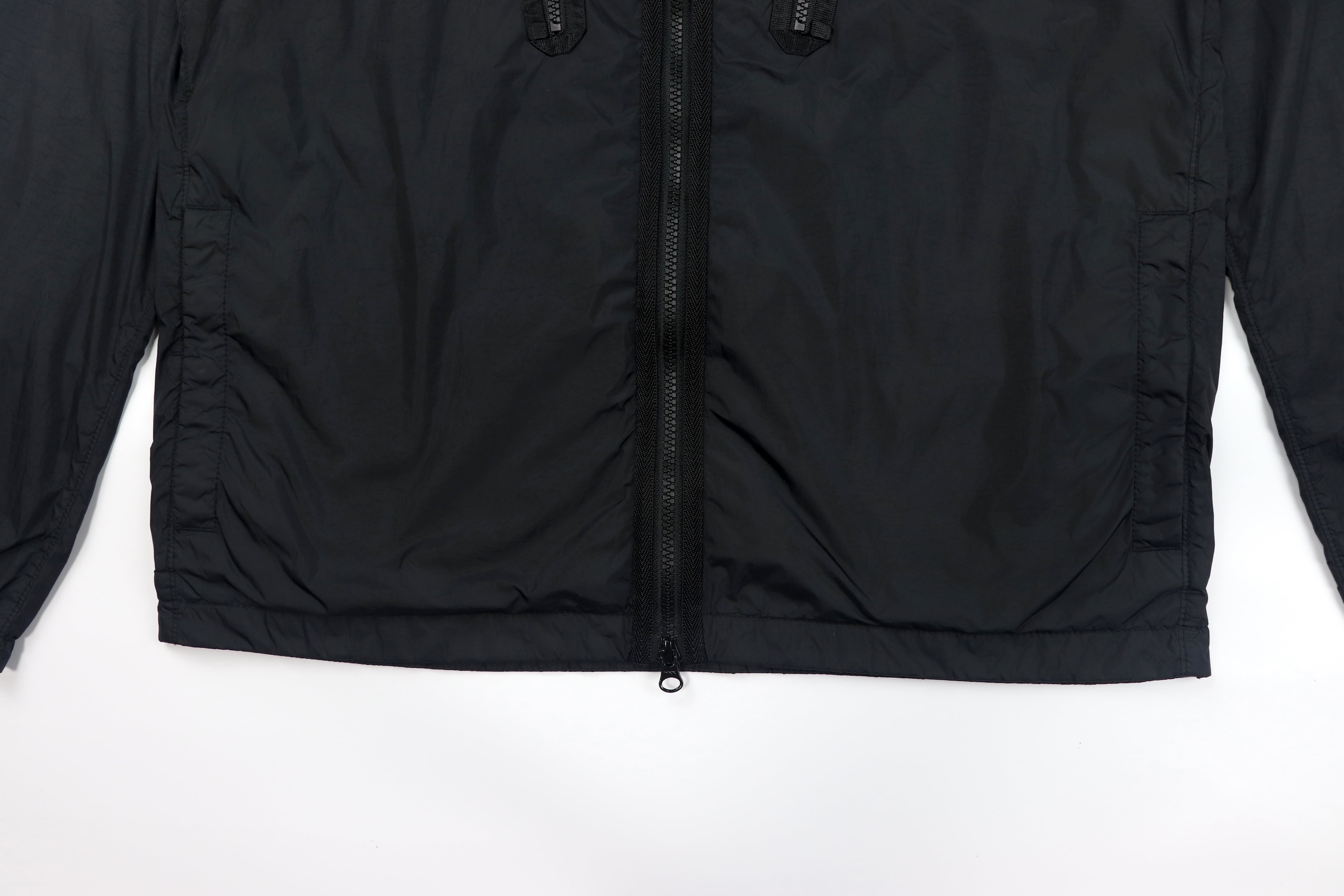 ナイロン素材のライトアウター。サイドポケットに加え、胸元にジップポケットを搭載。インナーには薄手の目の細かいフリースのような生地があり、ナイロンだけでは補えない防寒性もございます。