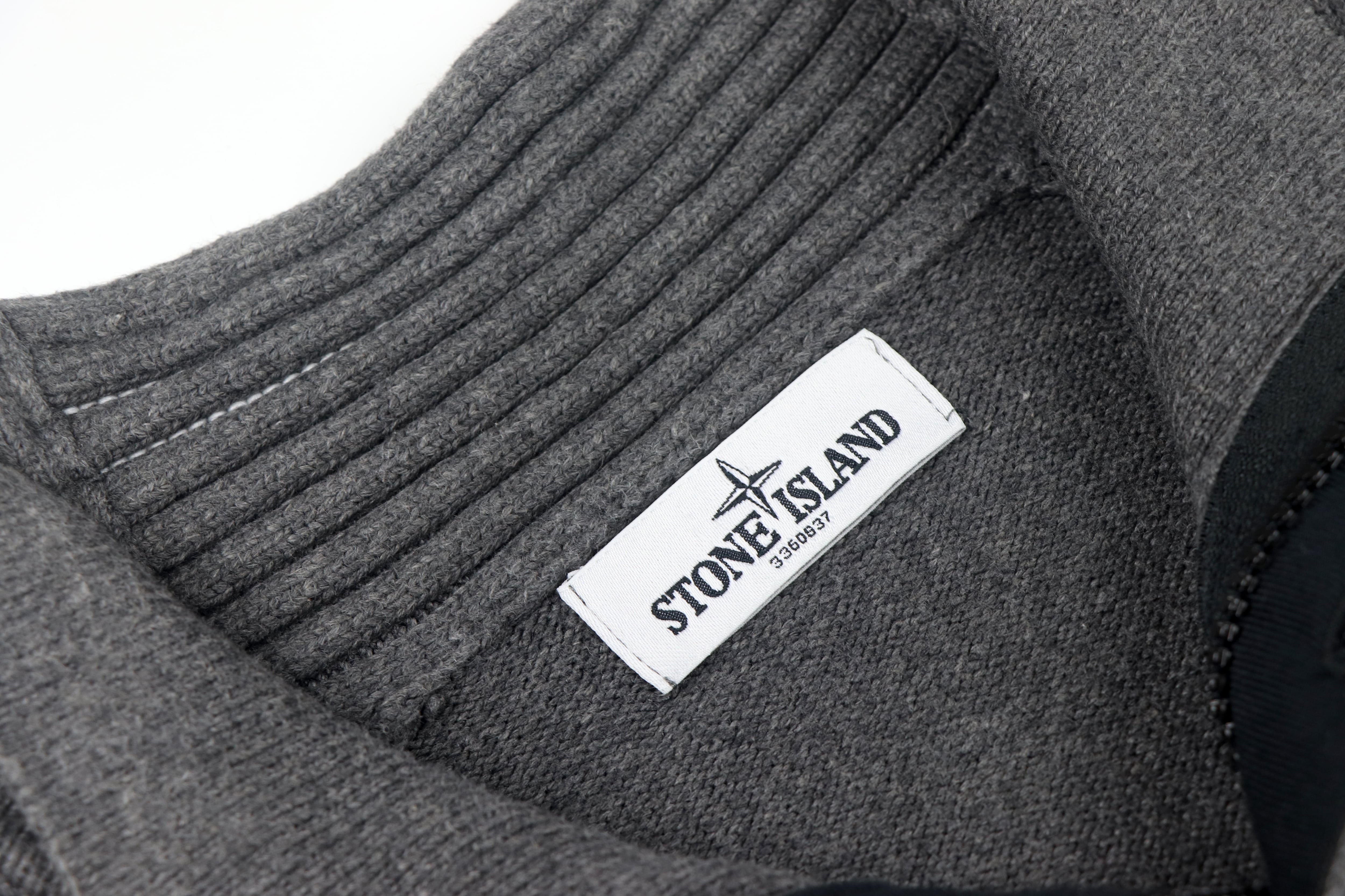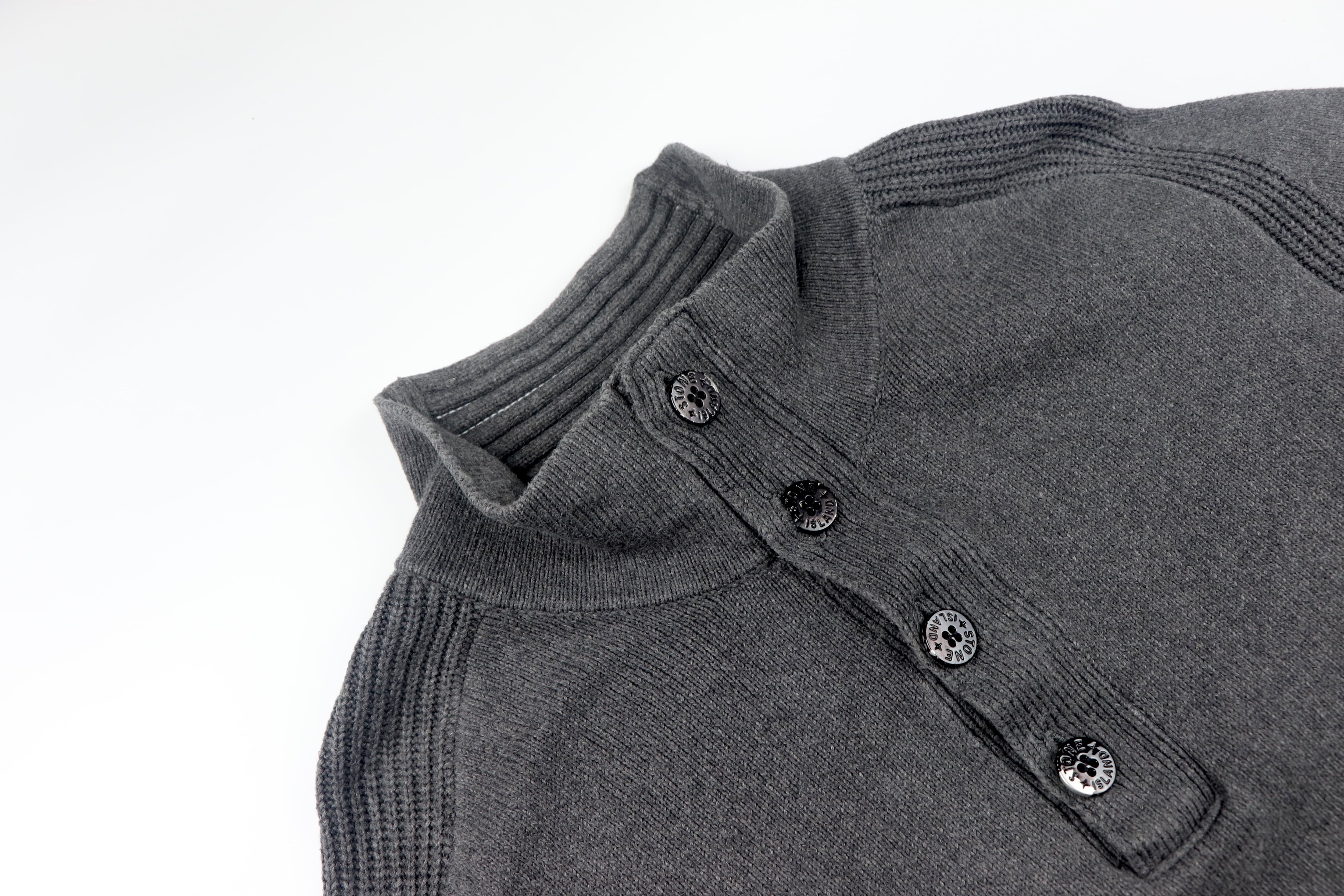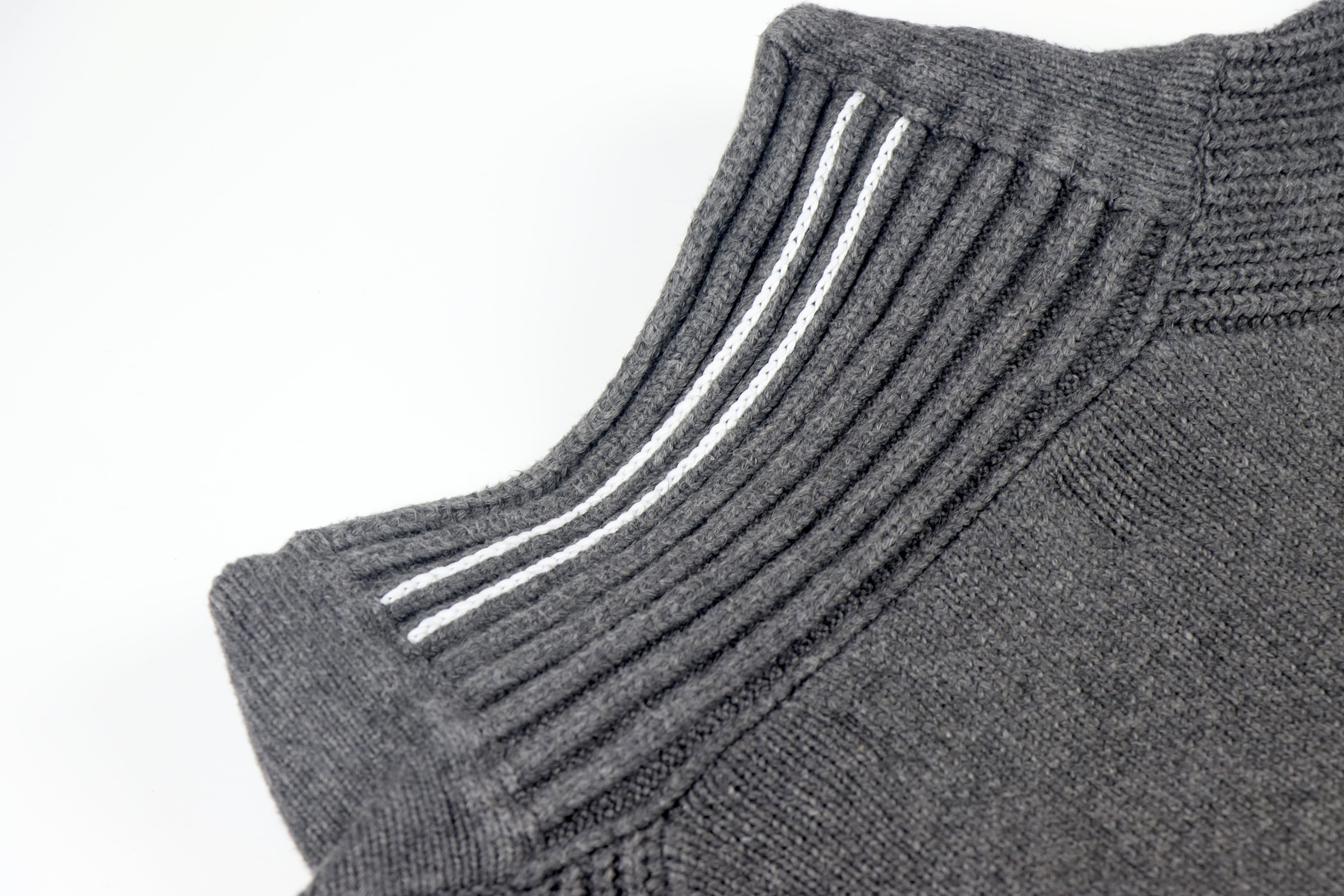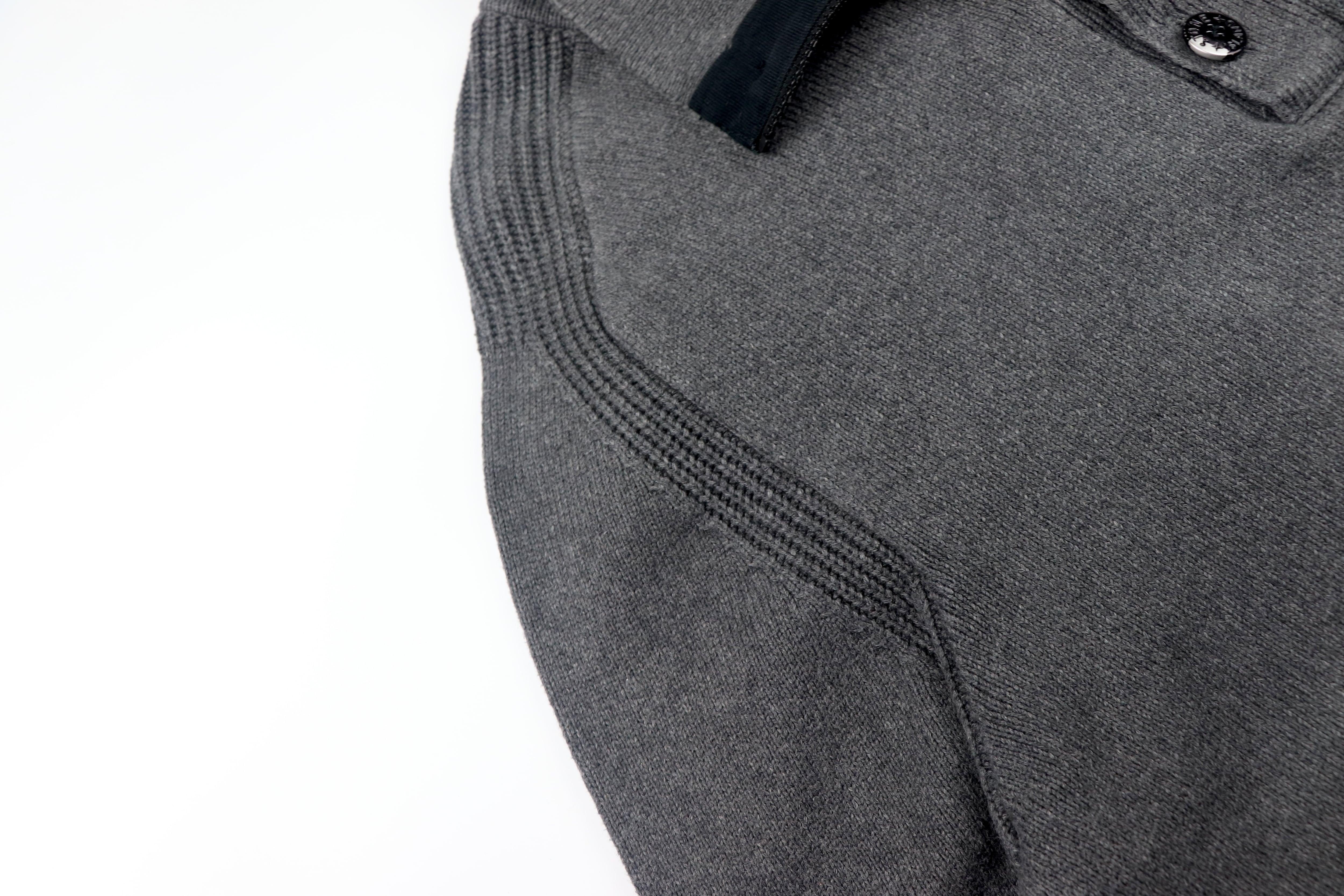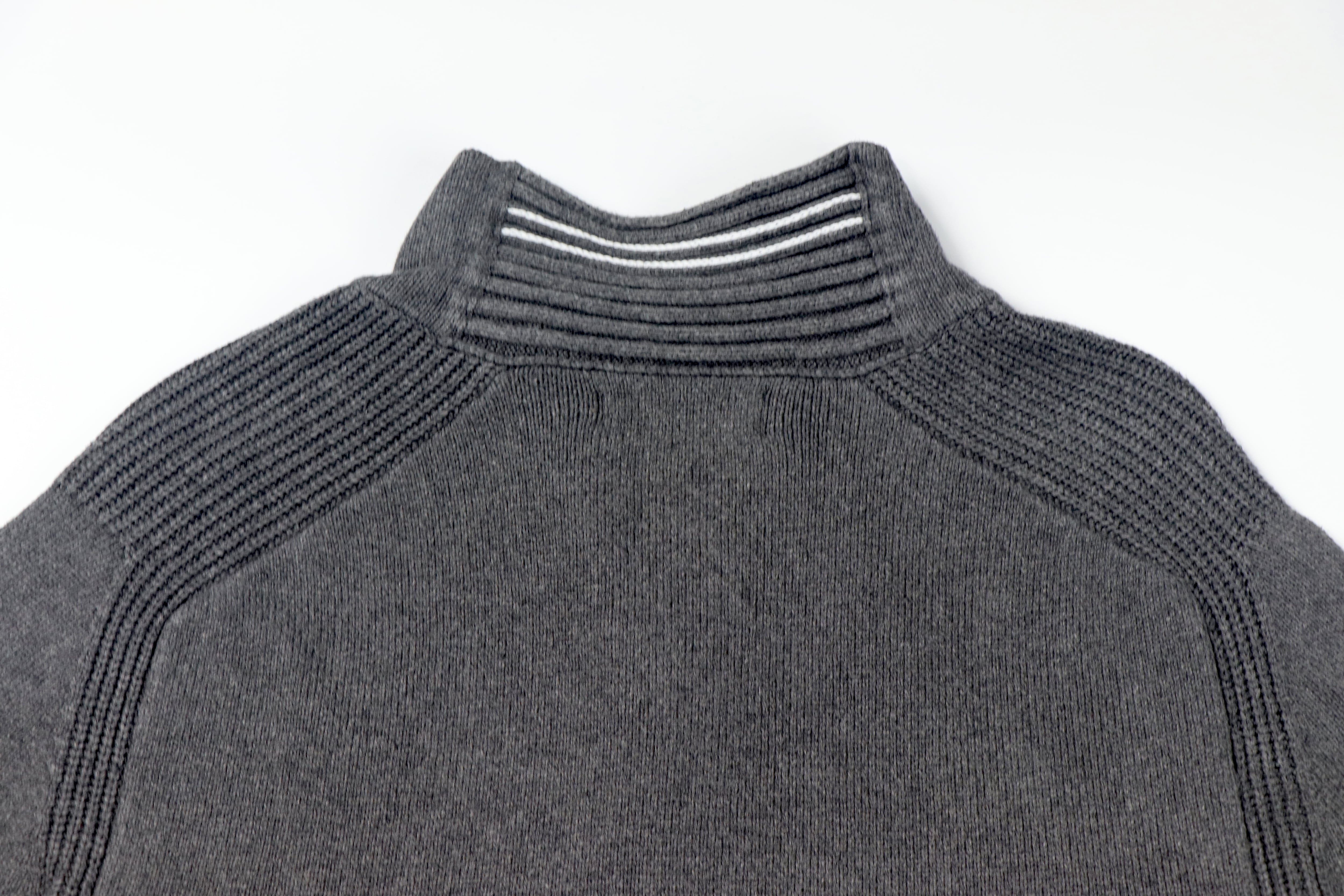 厚すぎず、薄すぎないちょうど良いボリュームのジップニット。首元には象徴のセカンドラインを採用。胸元の開き具合でも印象変わります。