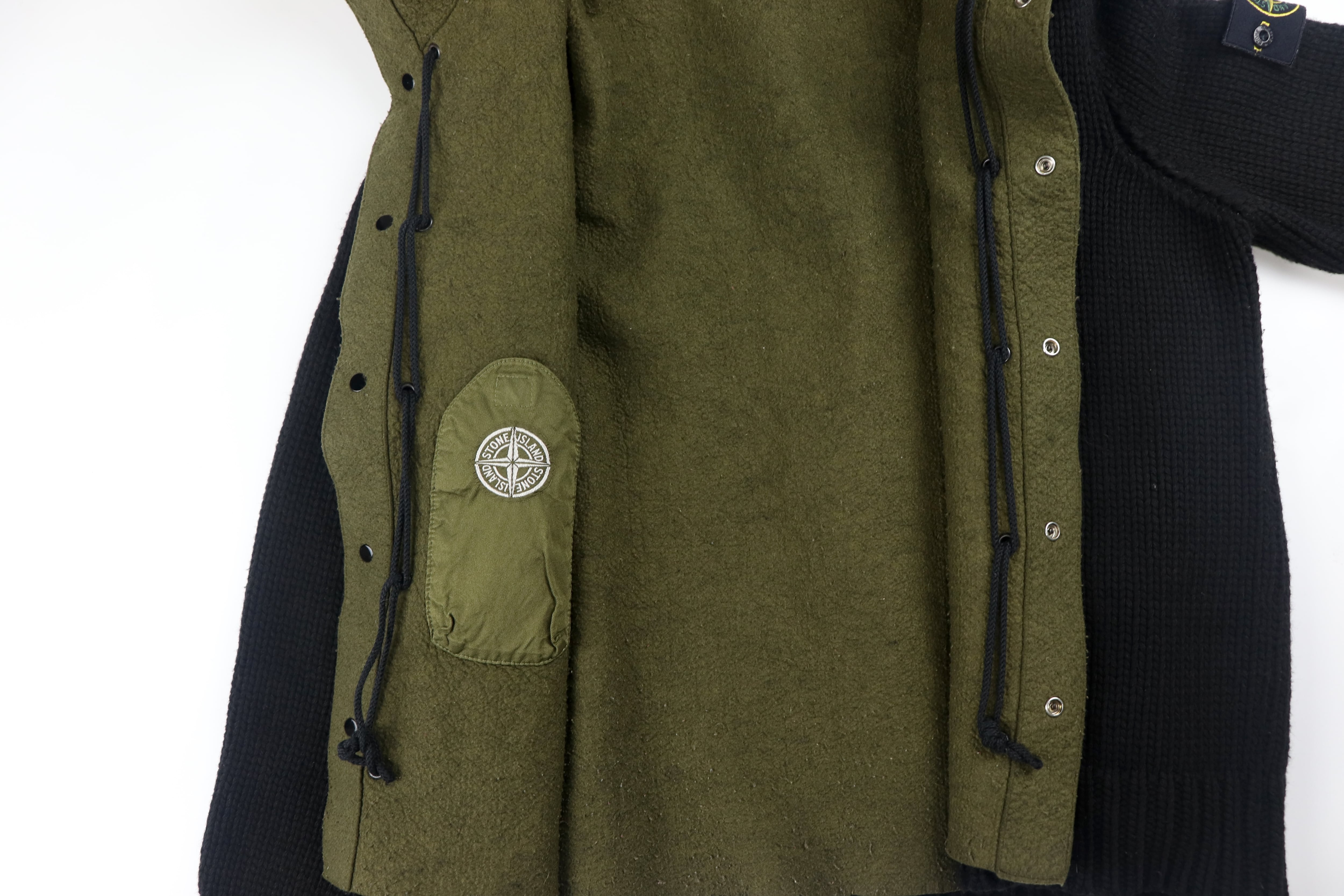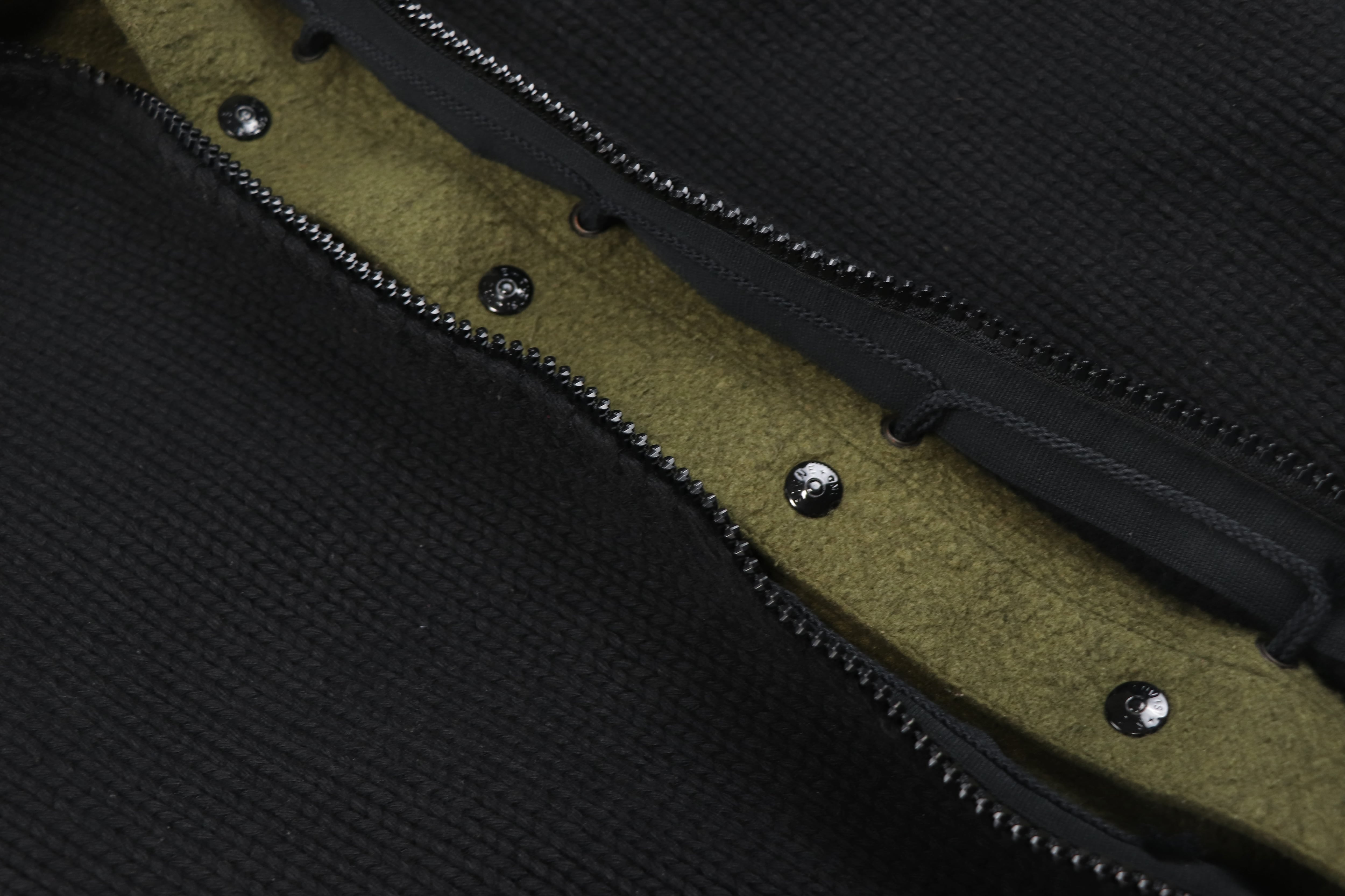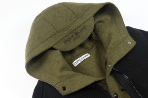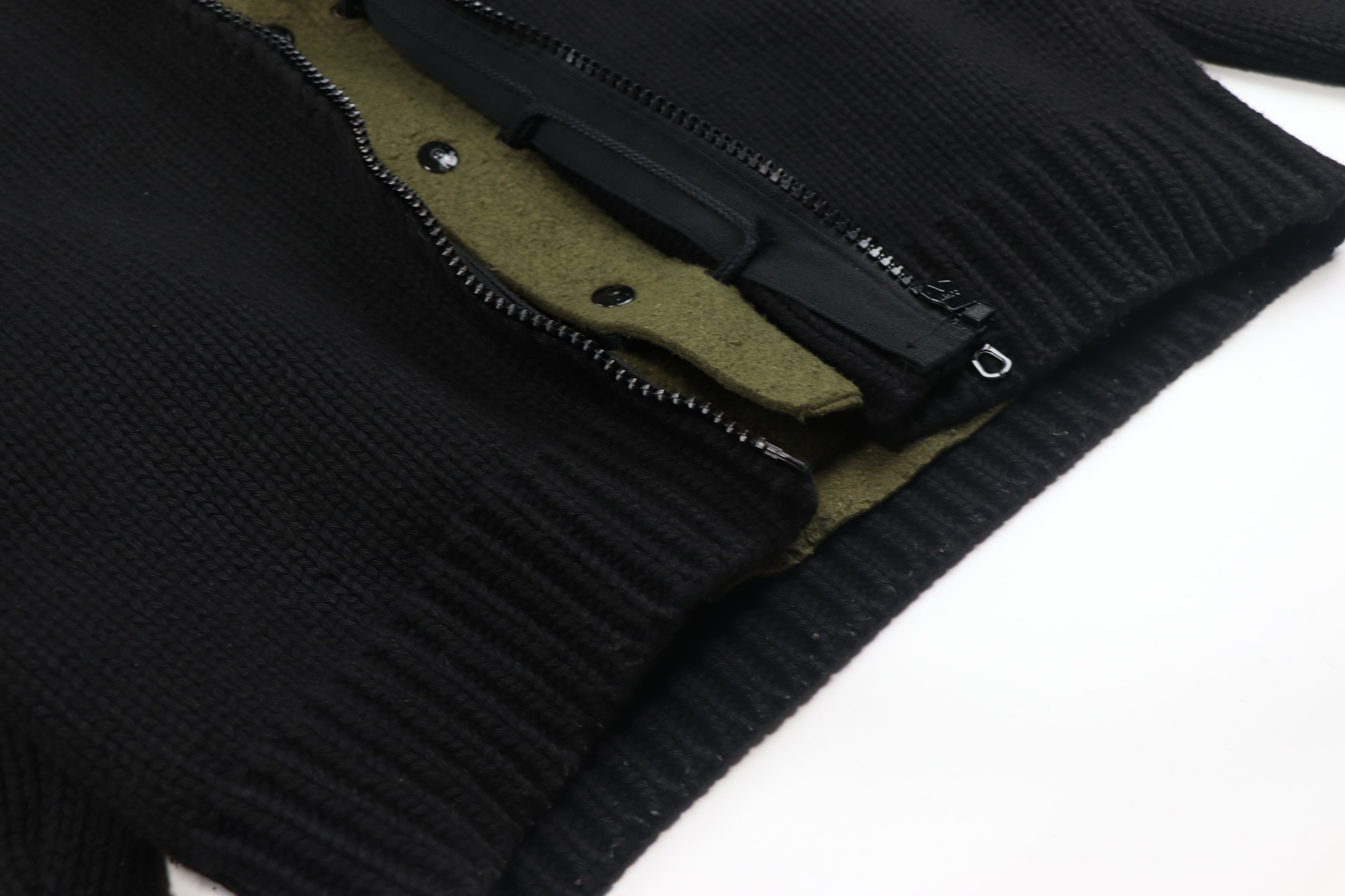 取り外し可能なフェルト素材のインナーを重量感のある厚手のニットで包み込んだ至高の1着は寒い冬に最適です。インナーには便利なポケット付き。フードにはブランドネームなど贅沢な1品です。