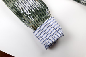 袖先をドッキングしたらしさ溢れるシャツ。織り方次第で何パターンか楽しめます。ストライプにカモパターンのプリントもいけてます。