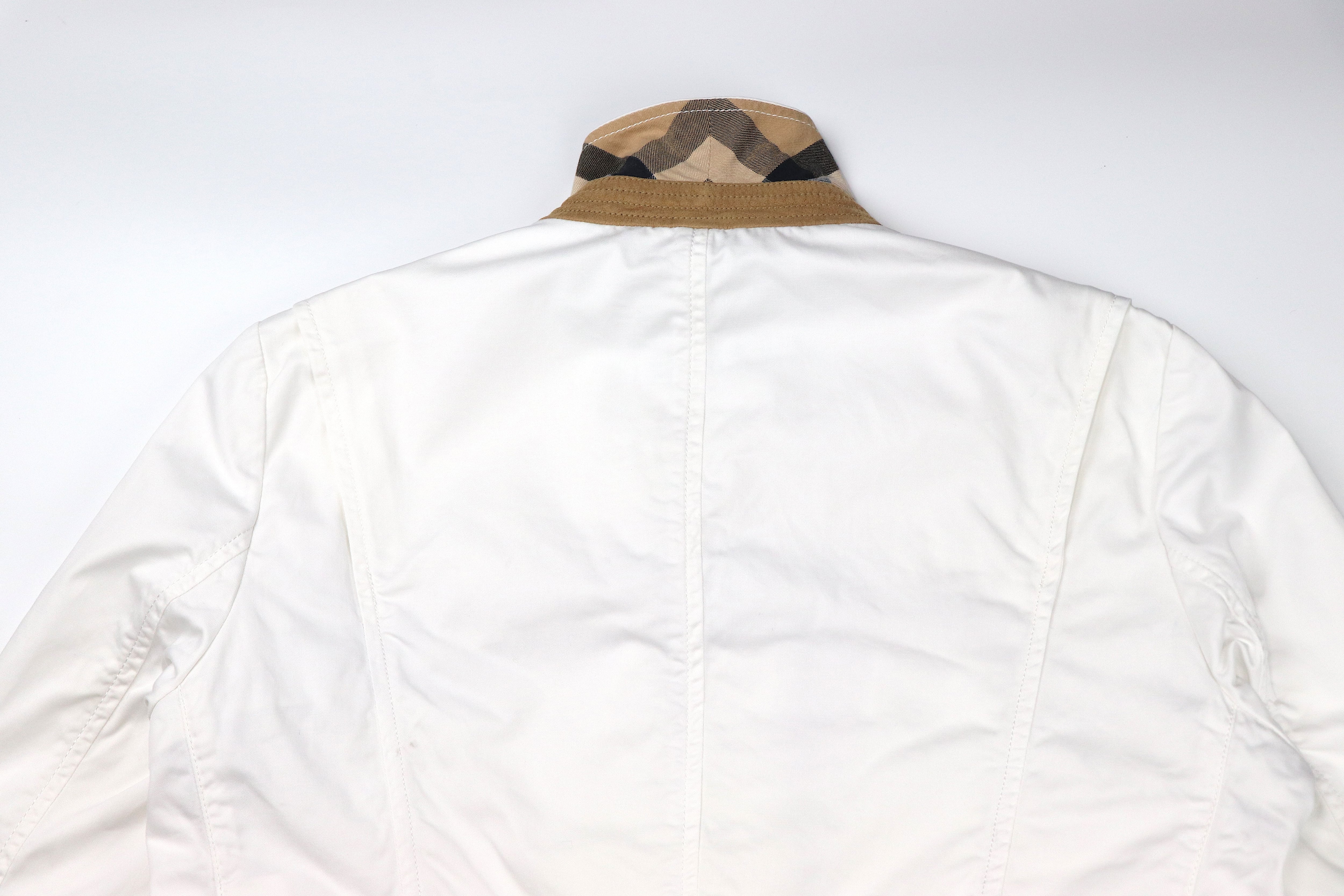 非常にエレガンスなホワイトキャンバス地に首元のノバチェックにブランドカラーのボタンとバーバリーらしさ溢れる1着です。