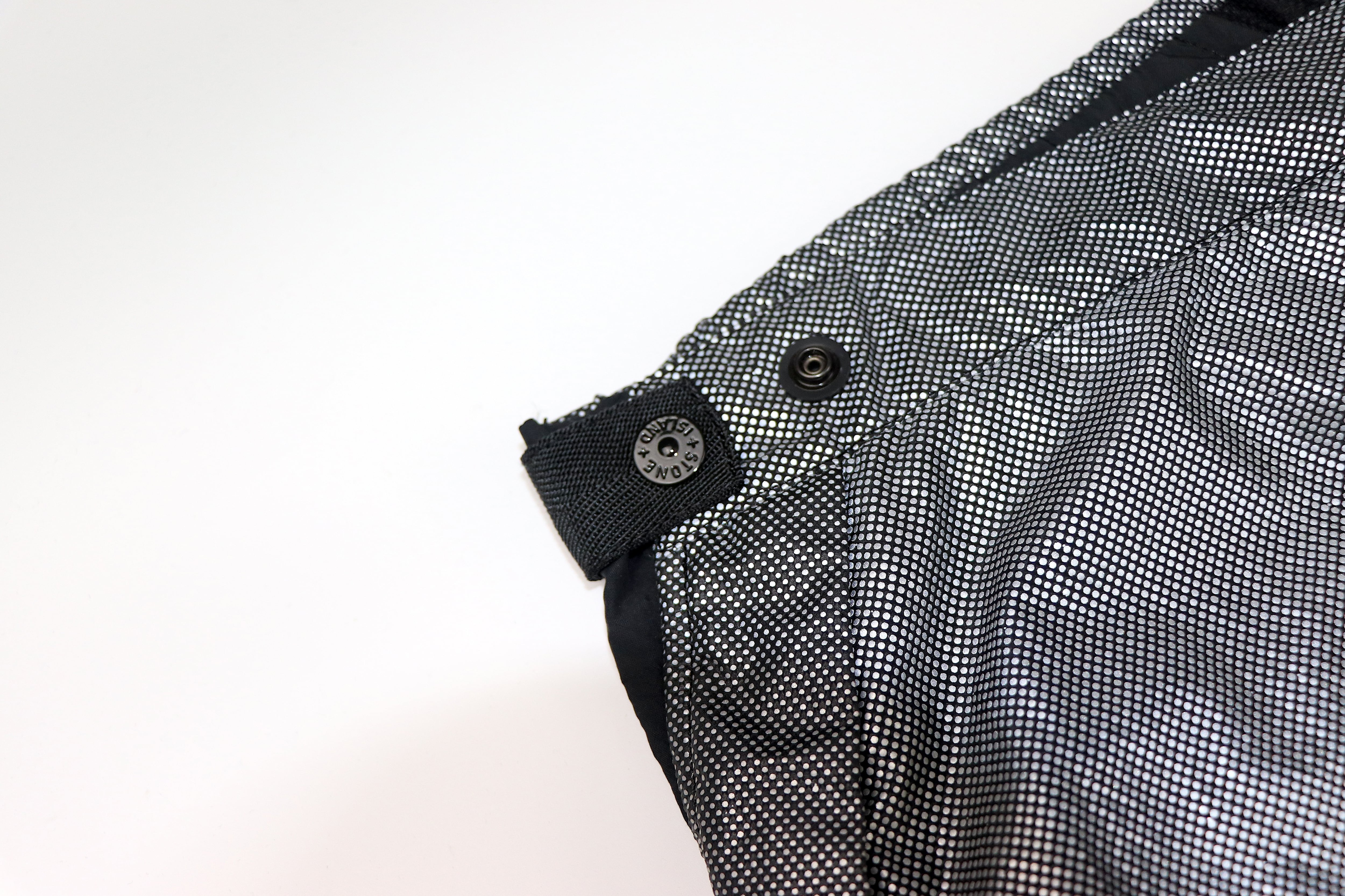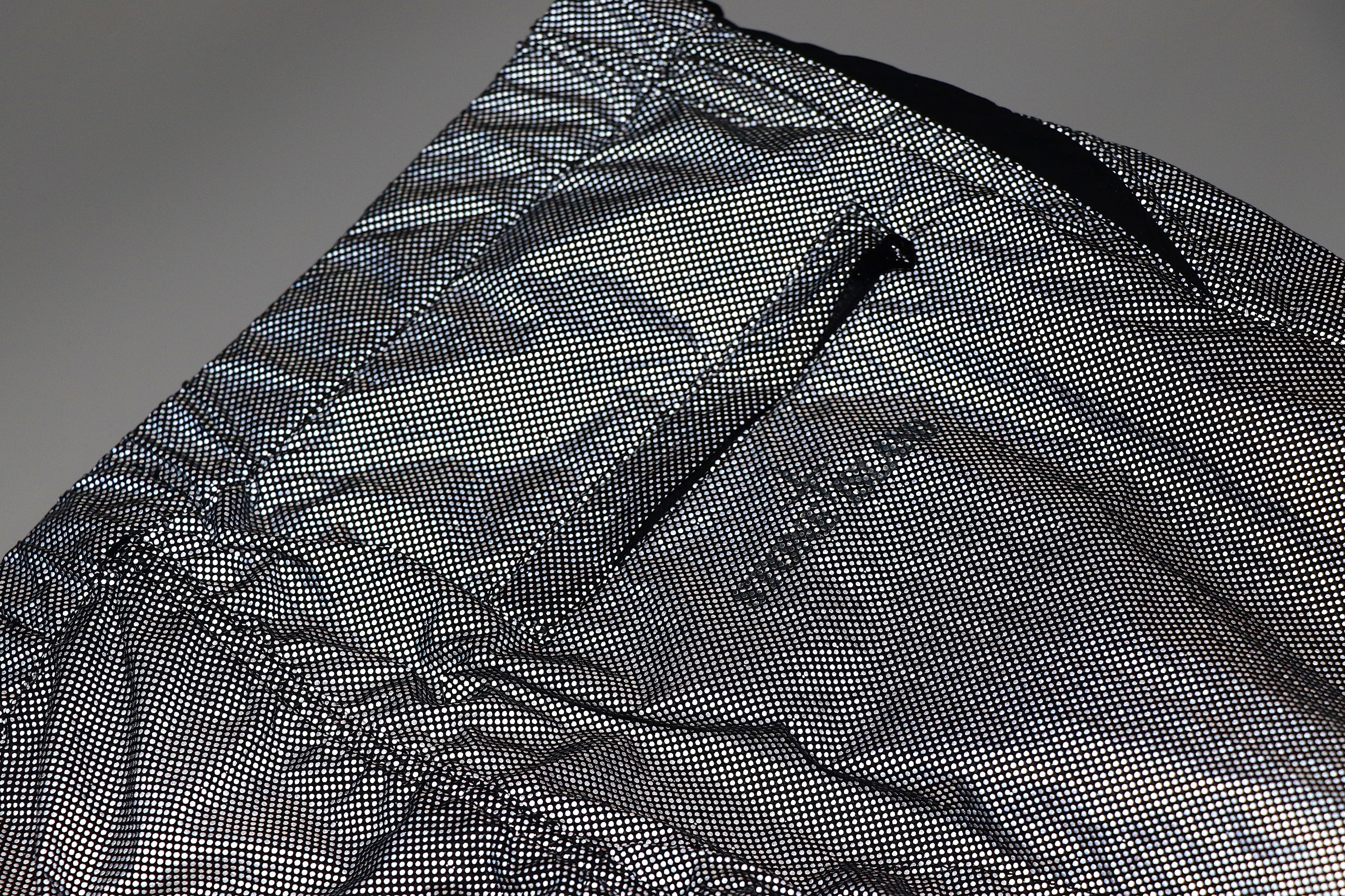 一見すると落ち着いた表情のテックファブリックですが、光を受けた瞬間、無数のピクセル状の反射が浮かび上がる唯一無二の素材です。