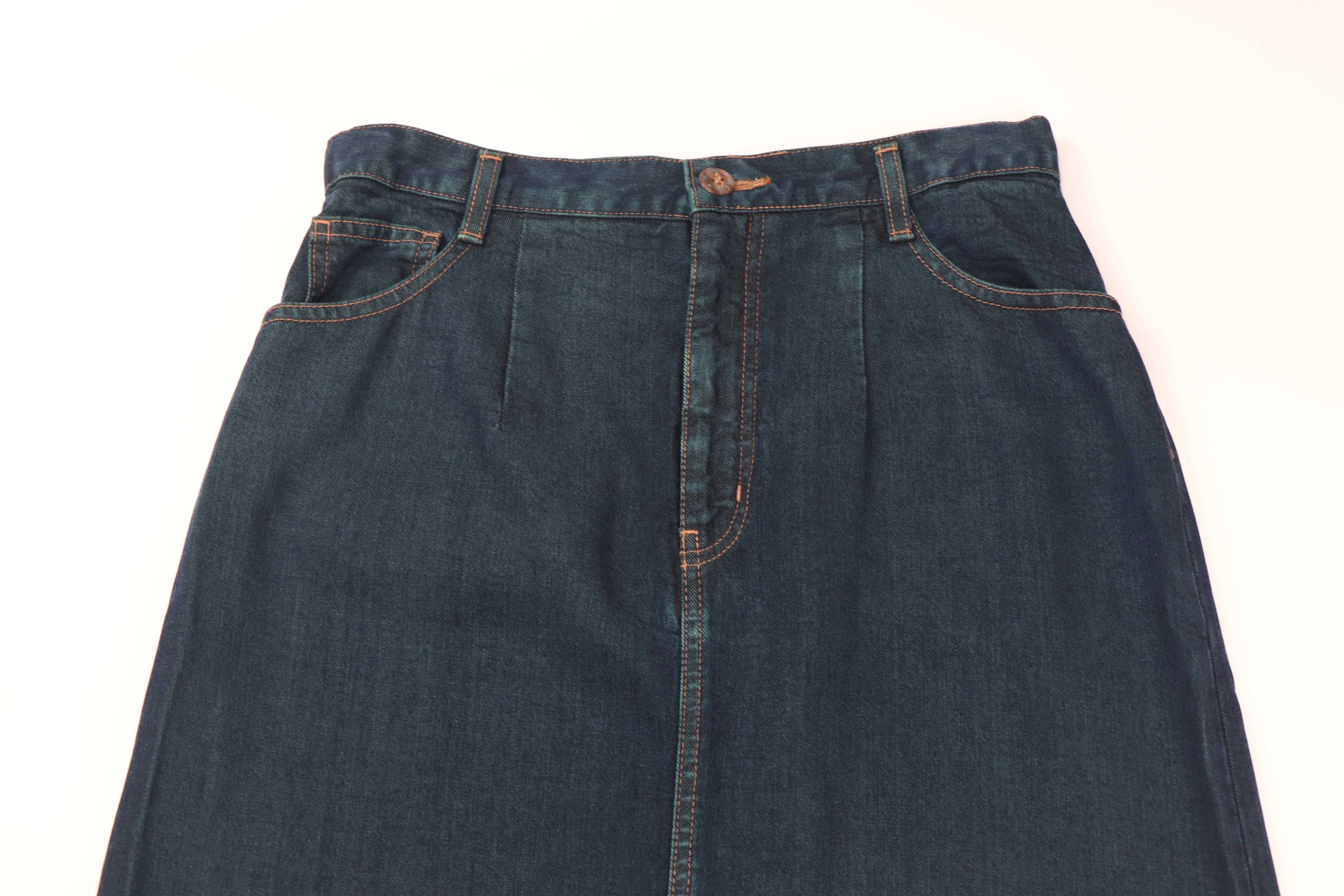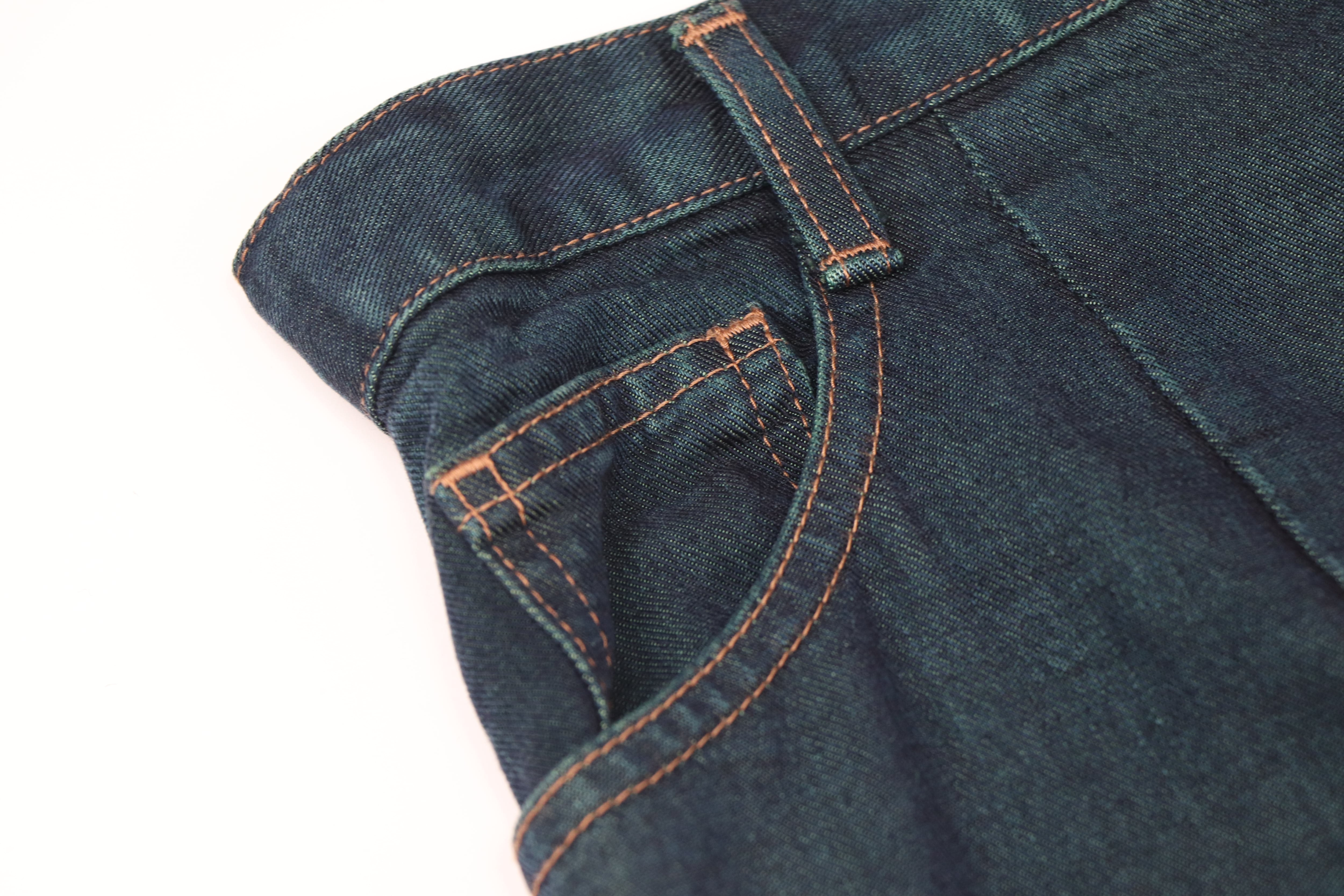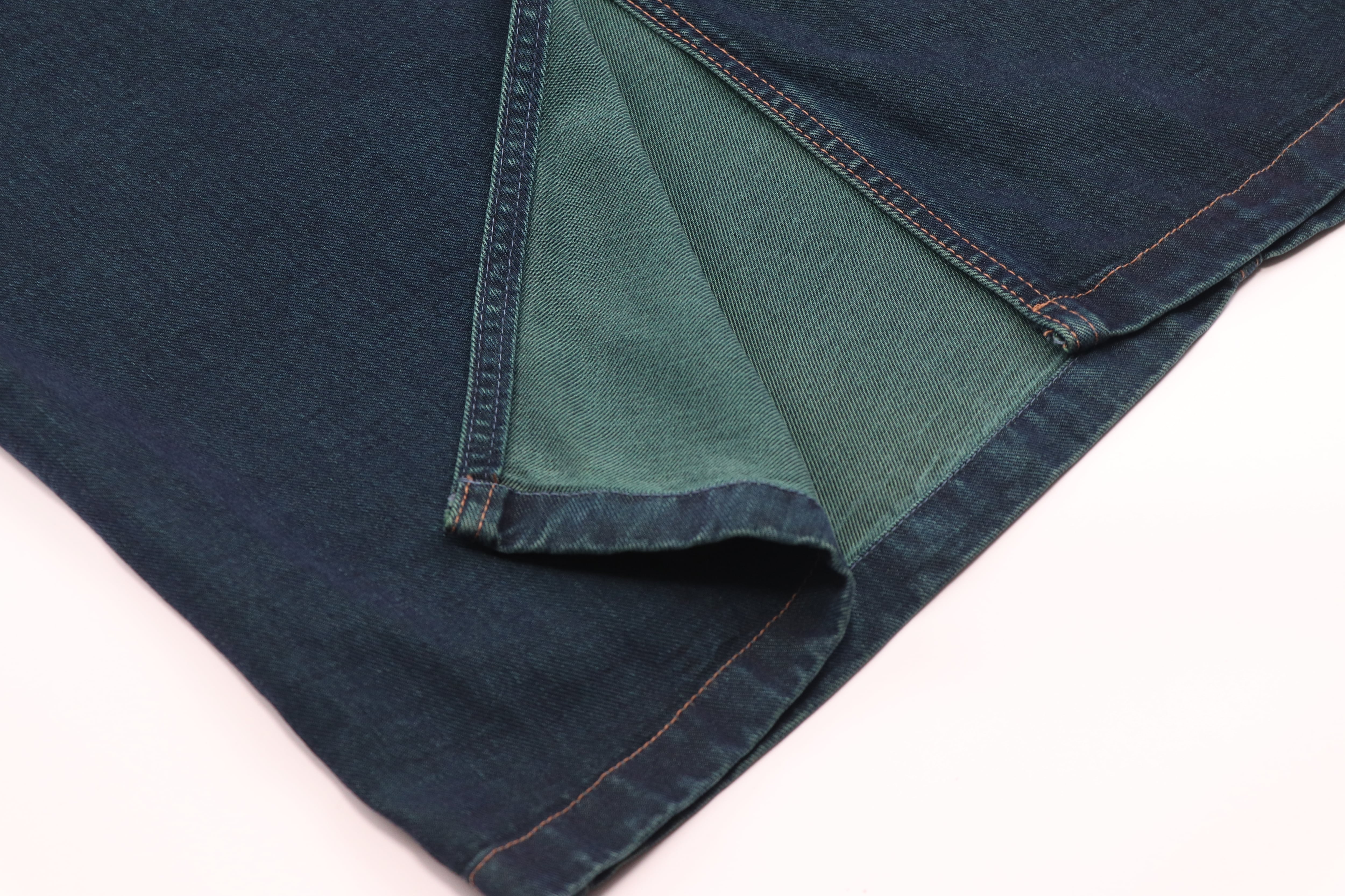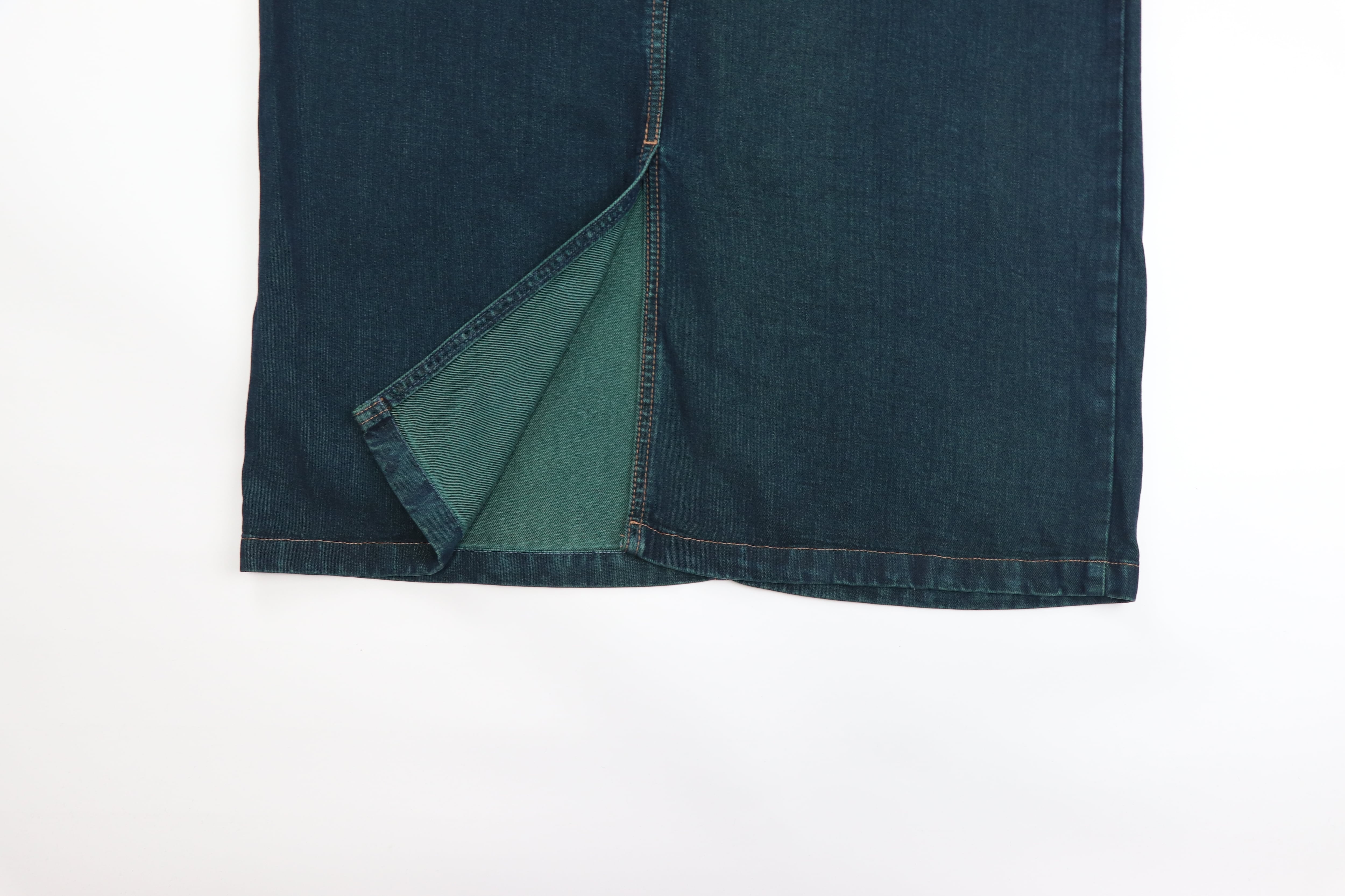 キュプラデニムは光沢感とドレープ感、柔らかく着心地の良い生地感です。ブルーとグリーンを混ぜたような色味でシンプルなアイテムでありながら素材と色味でインパクトのある1着です。