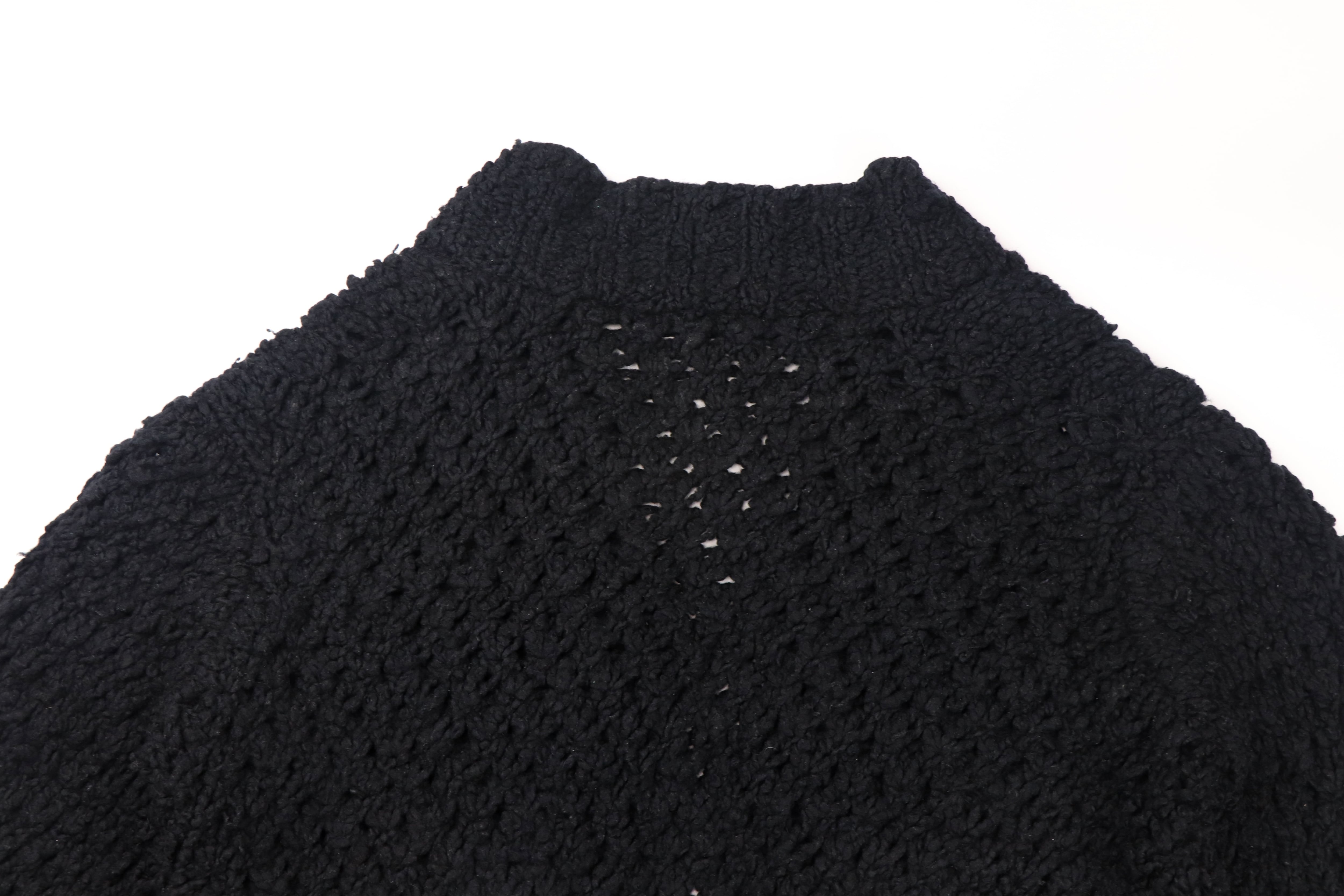 立体的なローゲージニットと前開きのデザインとラウンドカットされたフロントが特徴的な一着です。