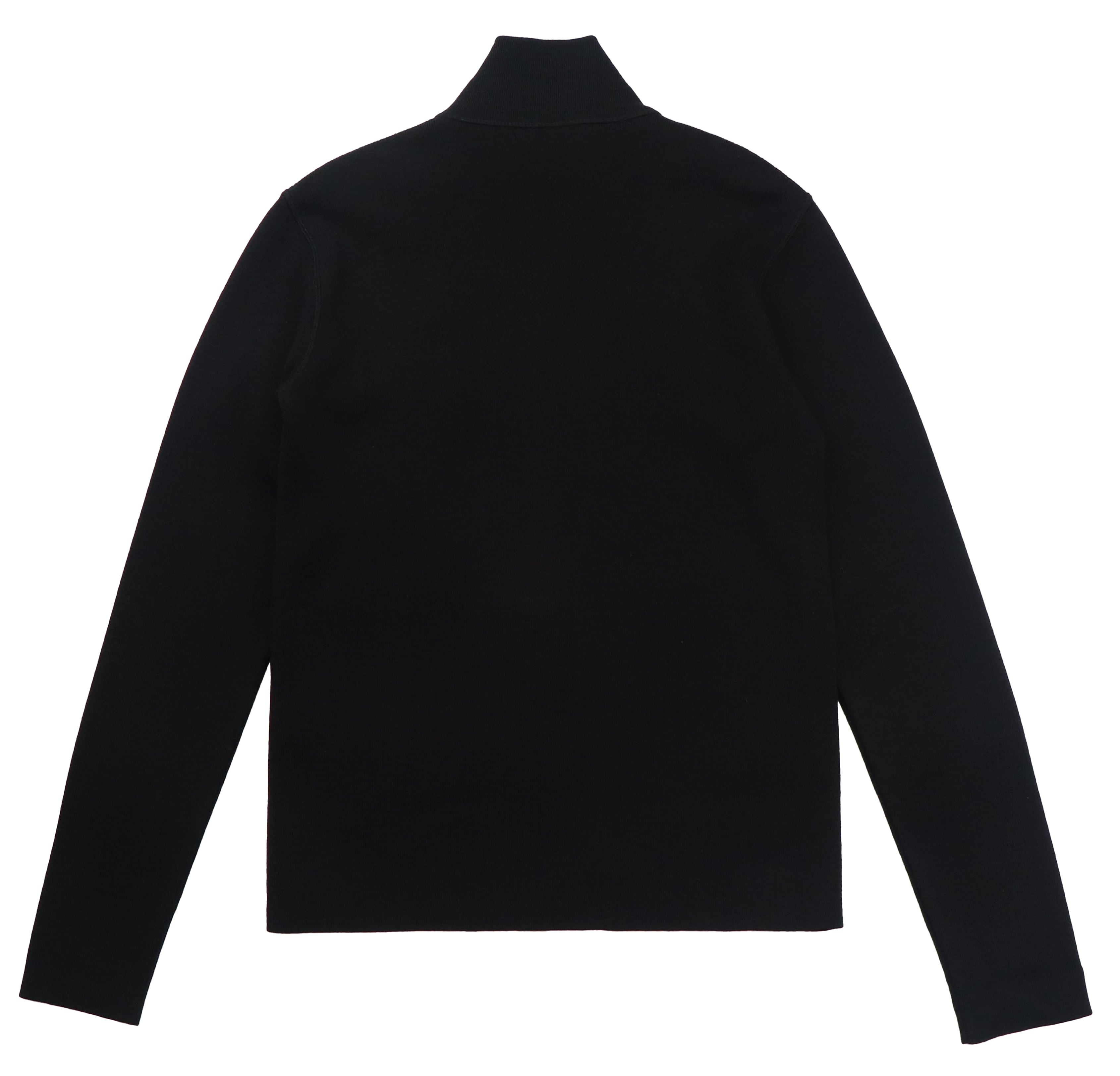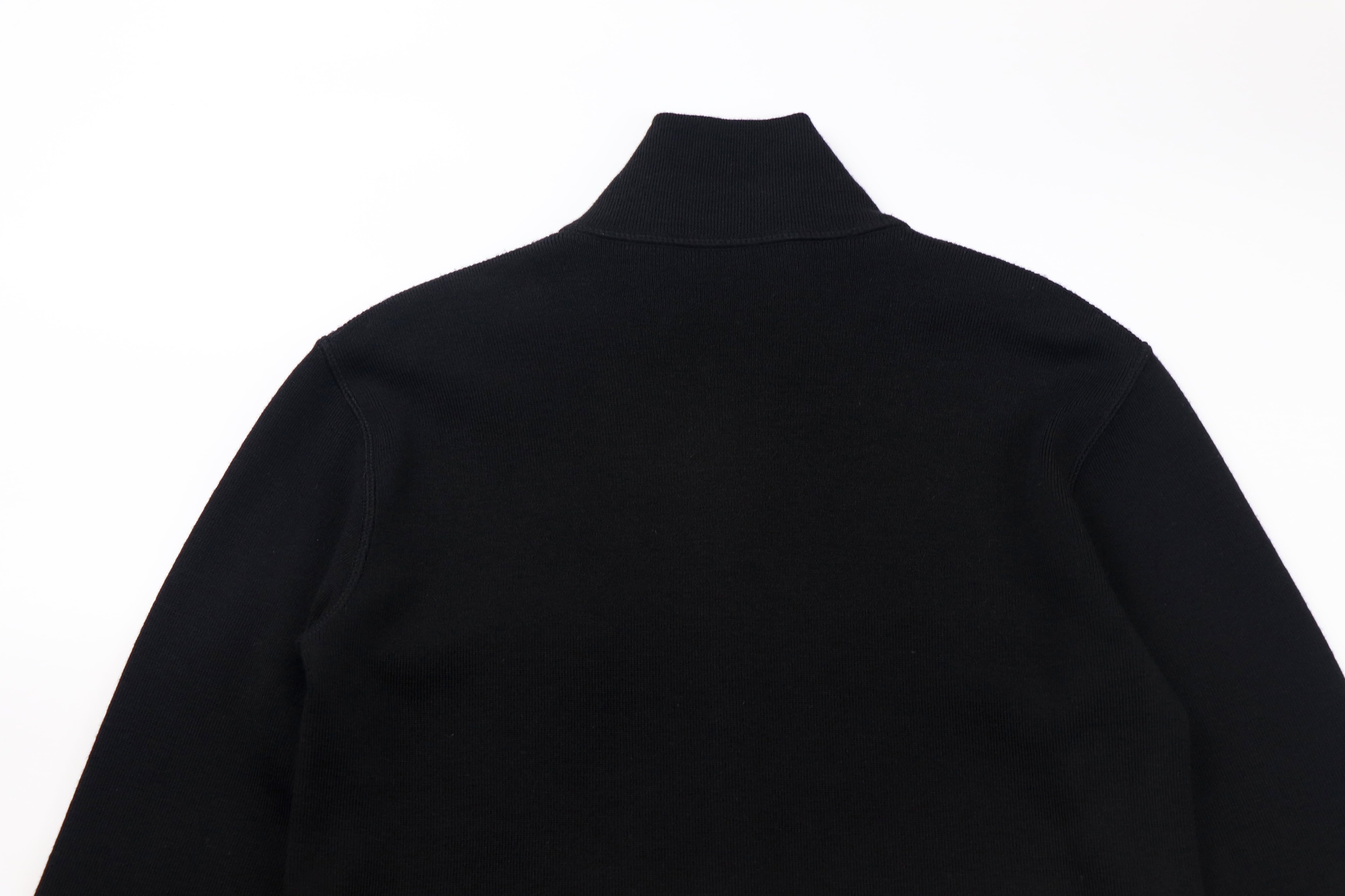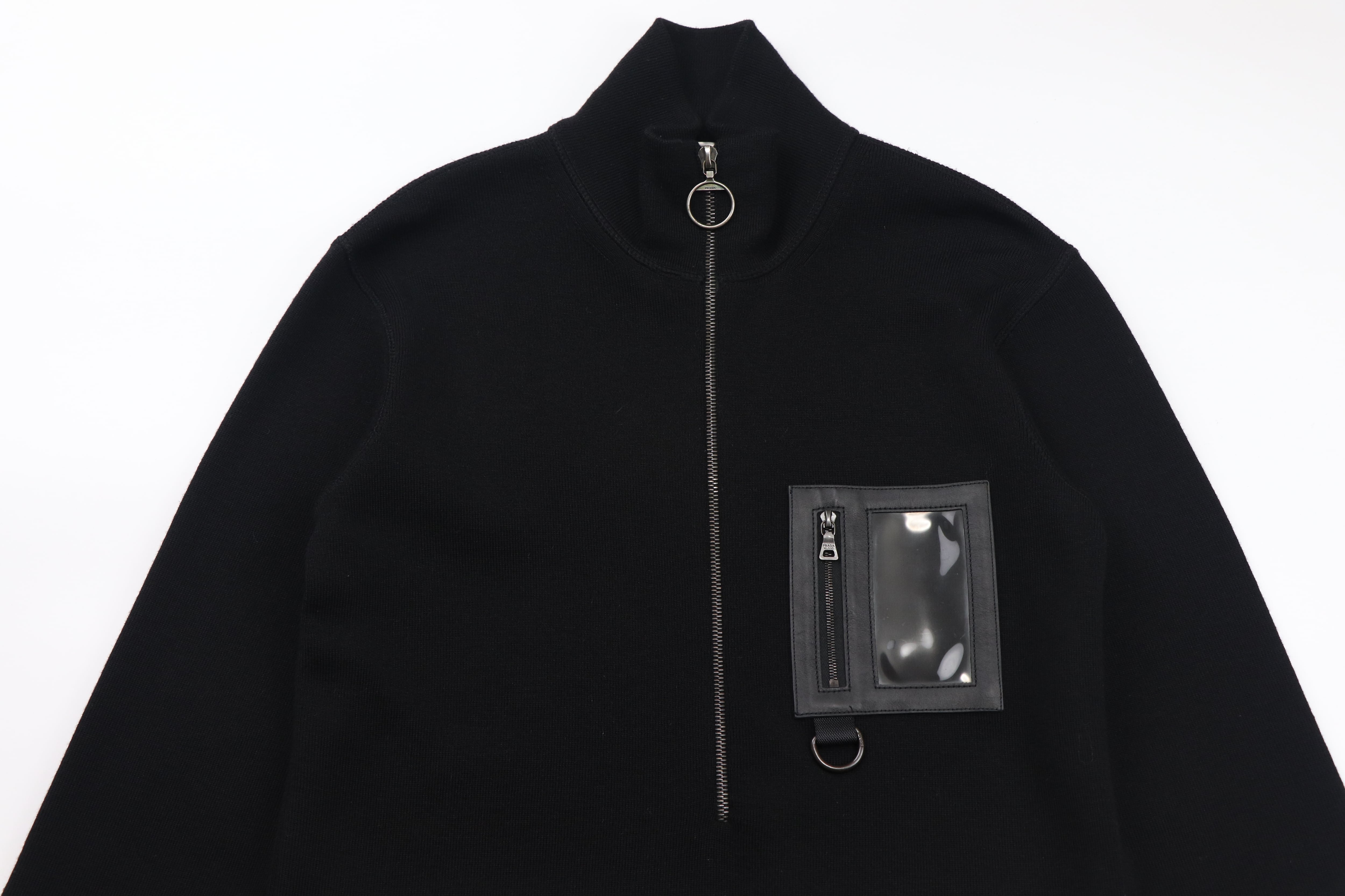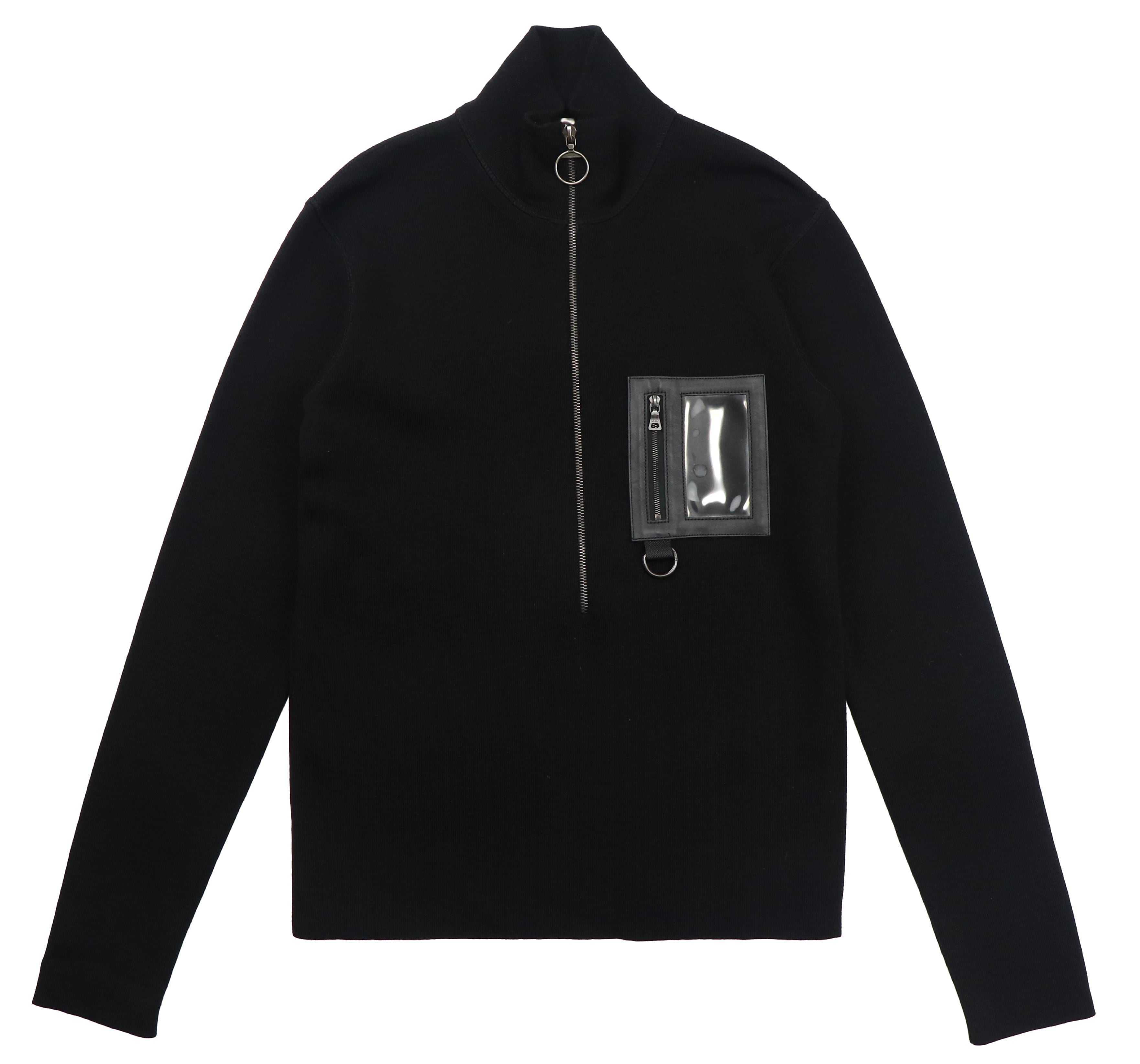 上質なハーフジップニットにレザーとビニールのアンバランスなポケットが遊び心のある雰囲気を醸し出します。