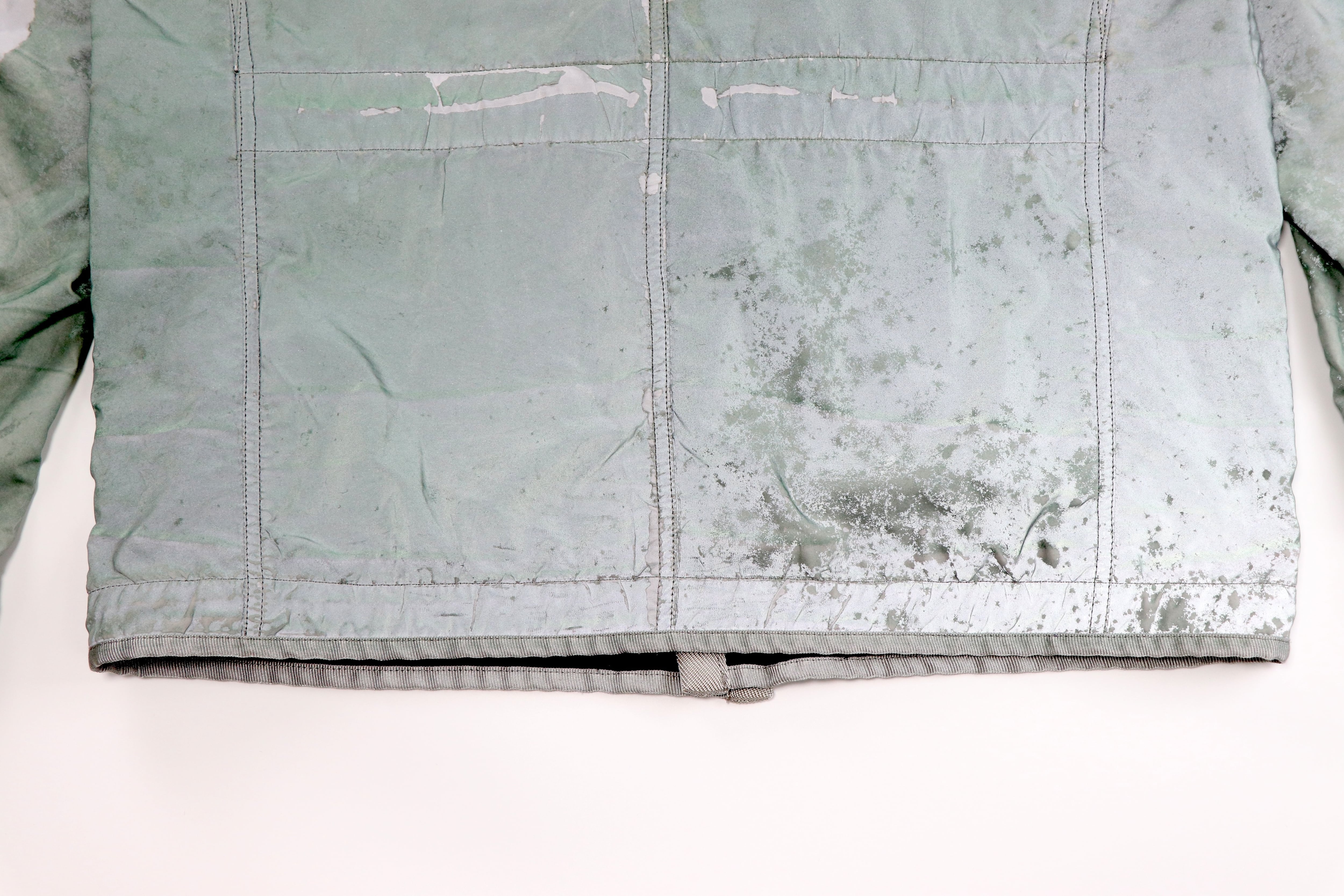 本作は、ナイロン生地の表面に微小ガラス粒子を含む特殊なリキッド状コーティングを施した、非常に実験的なファブリックを使用。光を受けることで強く反射し、見る角度や光源によって表情が大きく変化します。