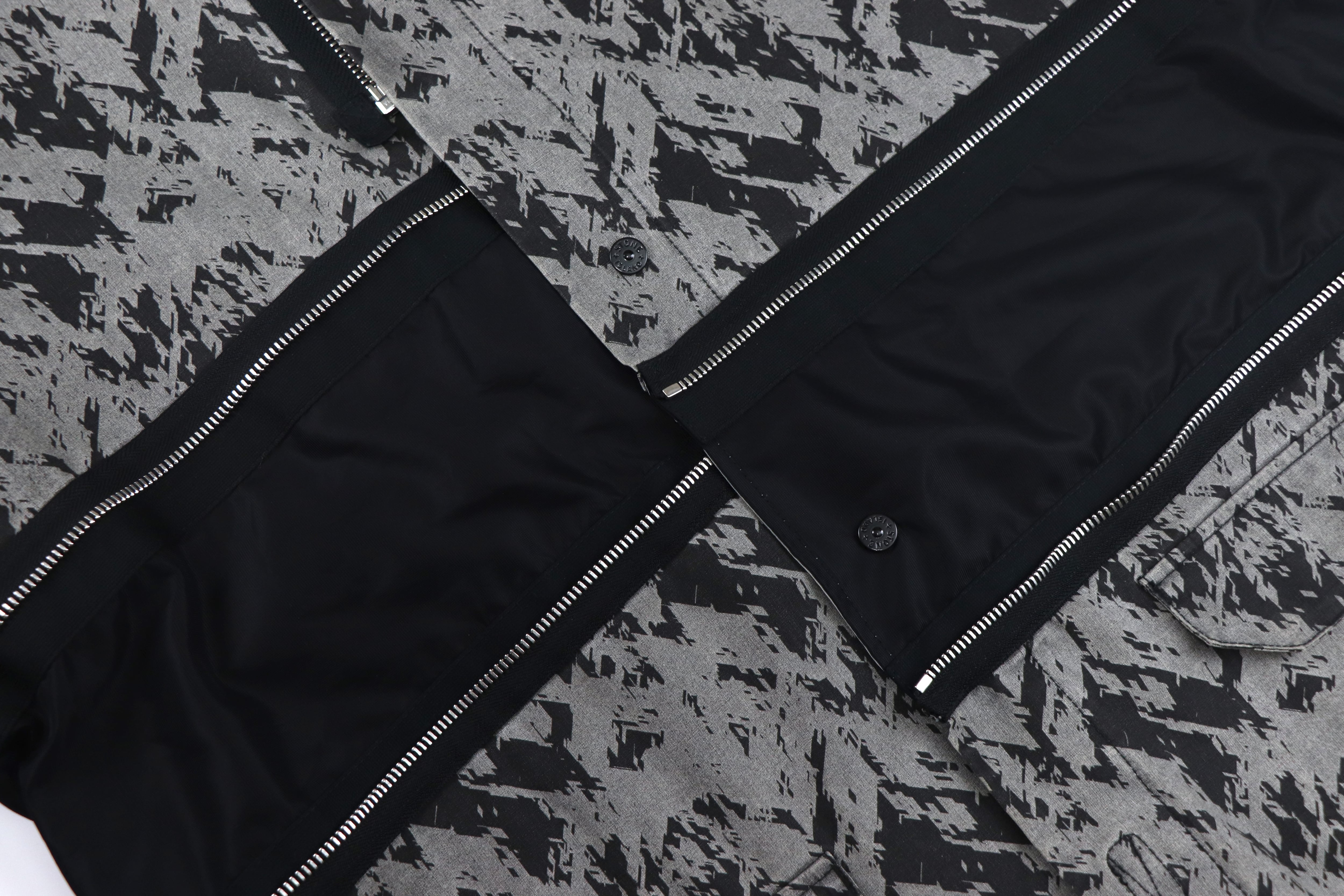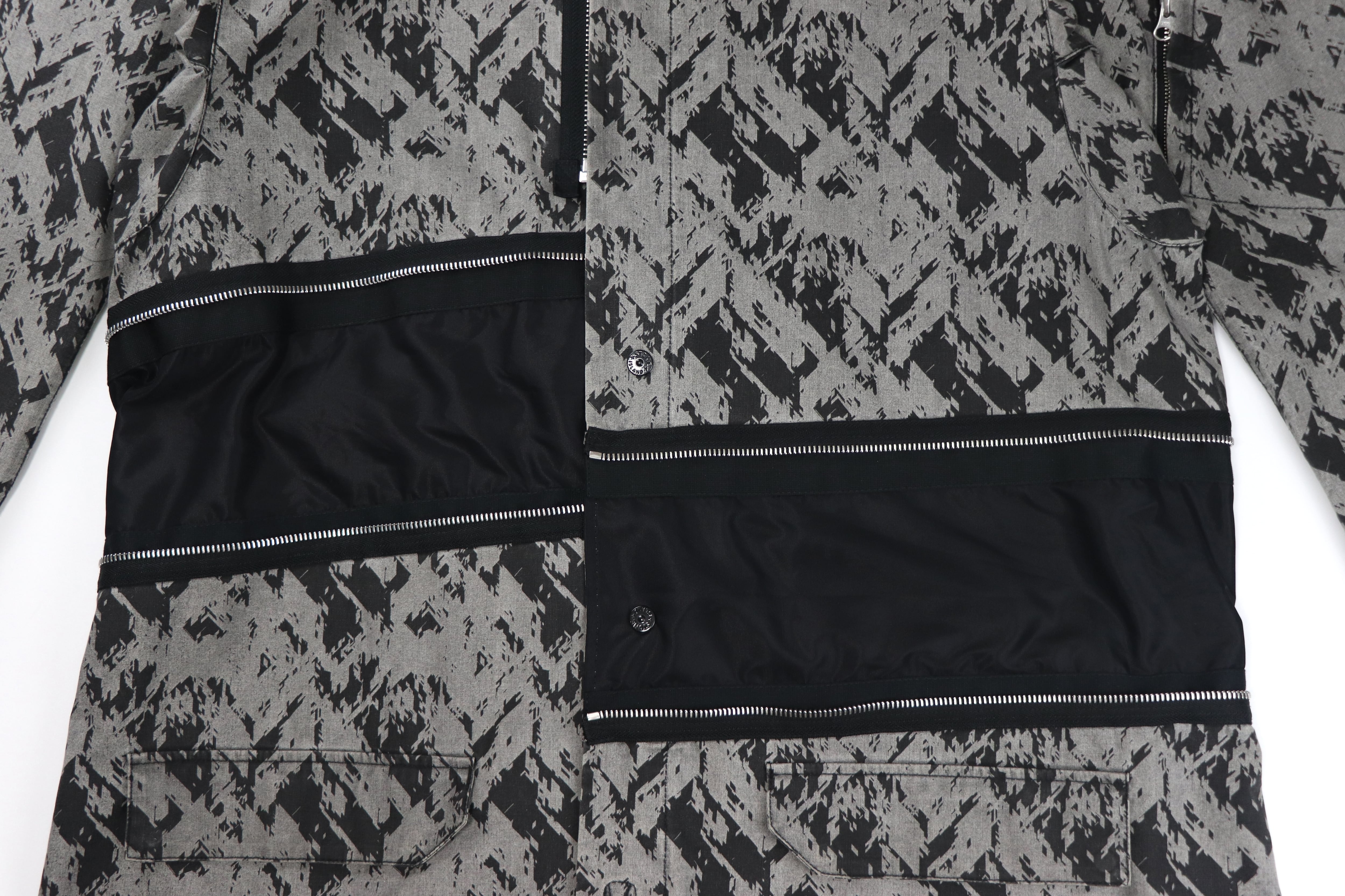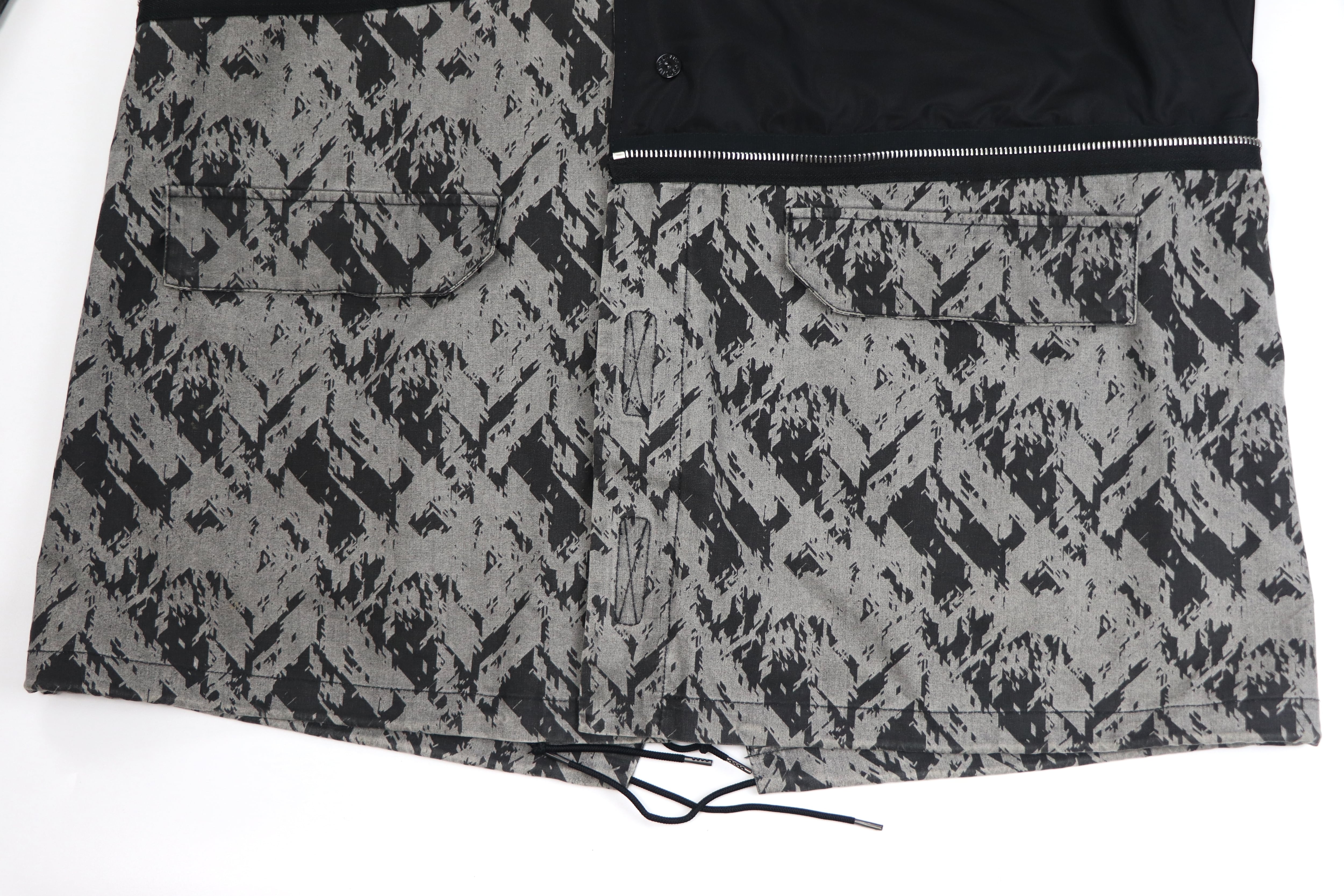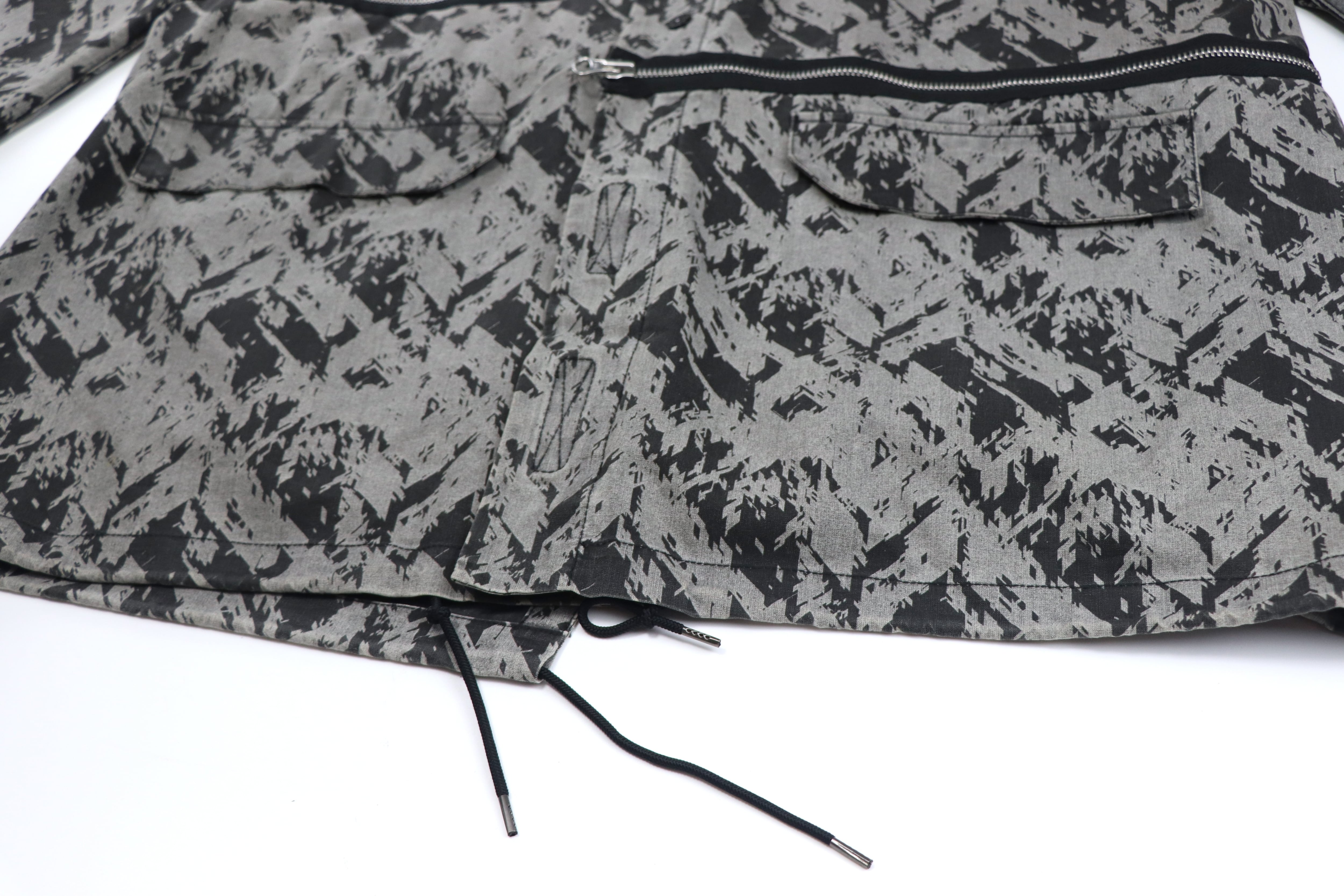 本モデルは、グラフィカルな総柄ファブリックとブラックパネルを組み合わせたコントラストの効いた配色が印象的な一着。ミリタリーやテックウェアを思わせるSHADOW PROJECTらしい雰囲気を持っています。