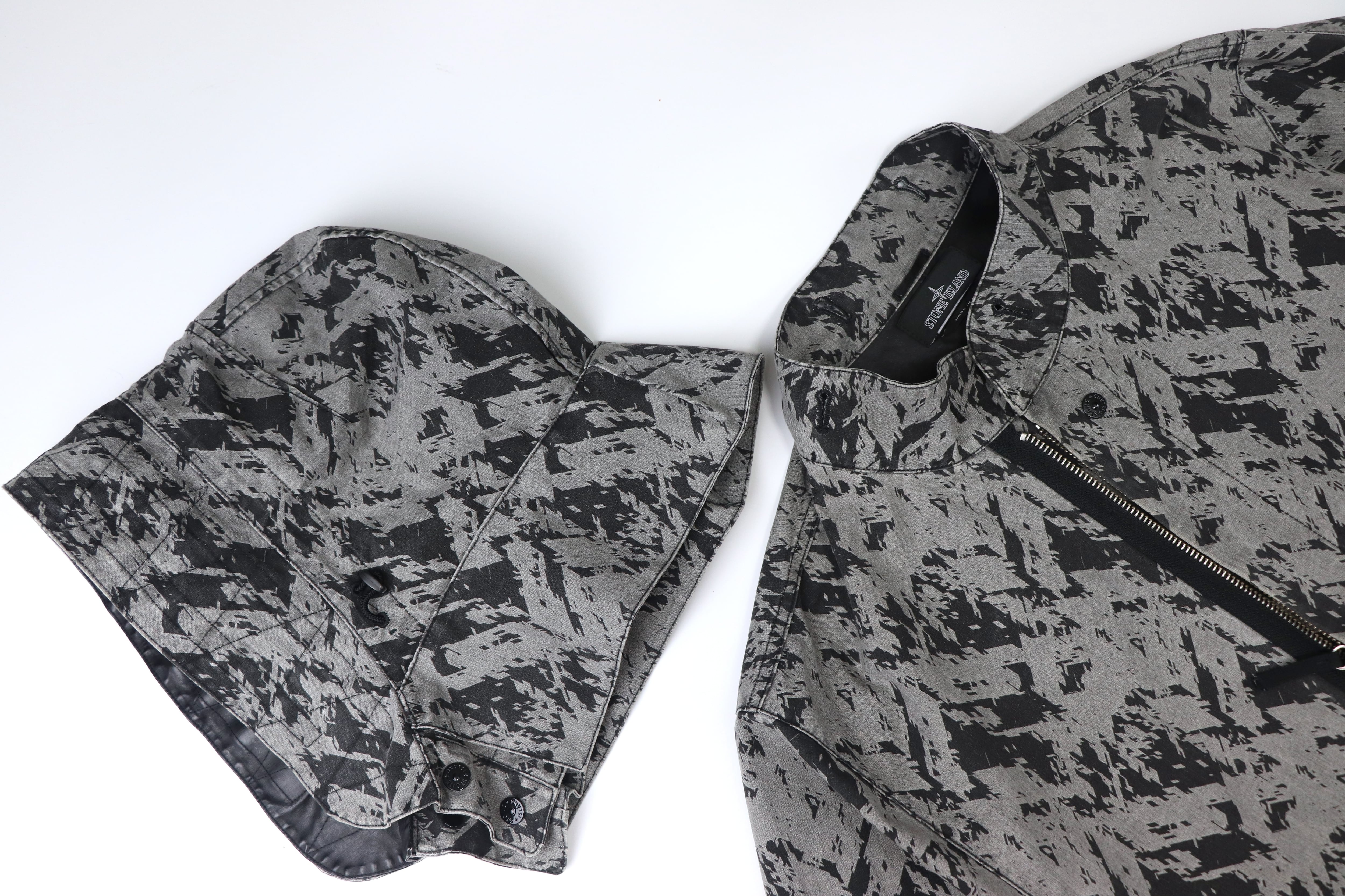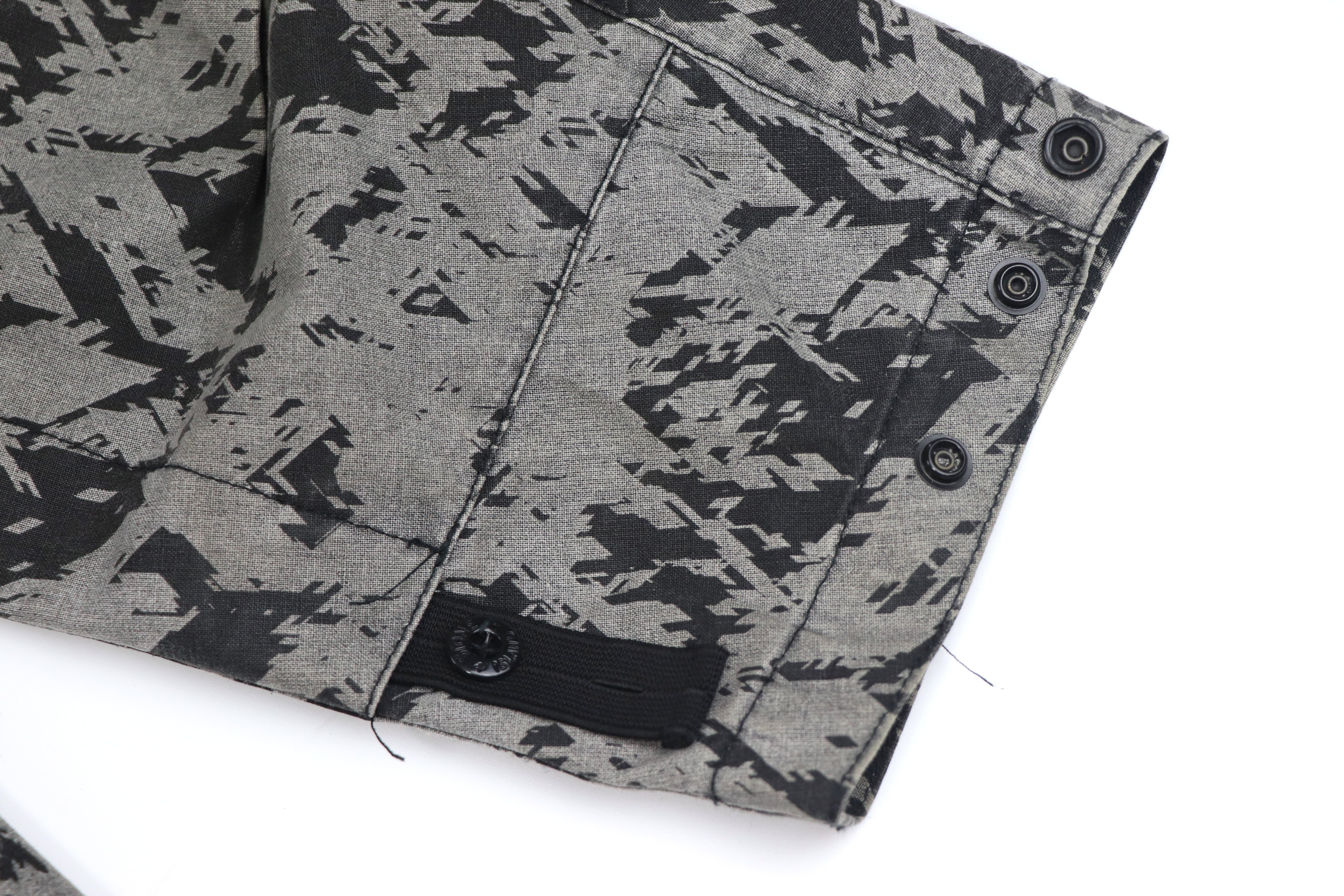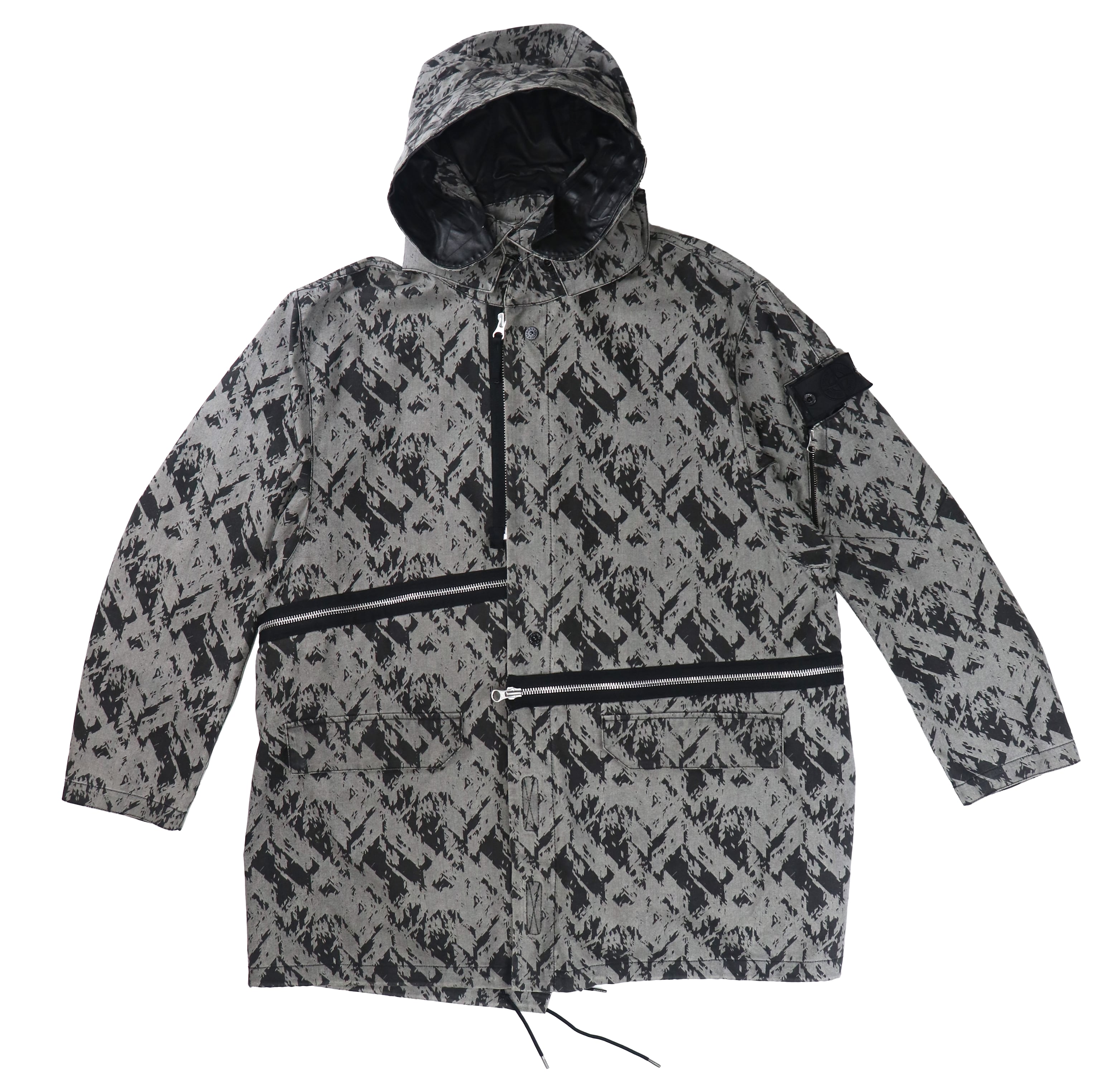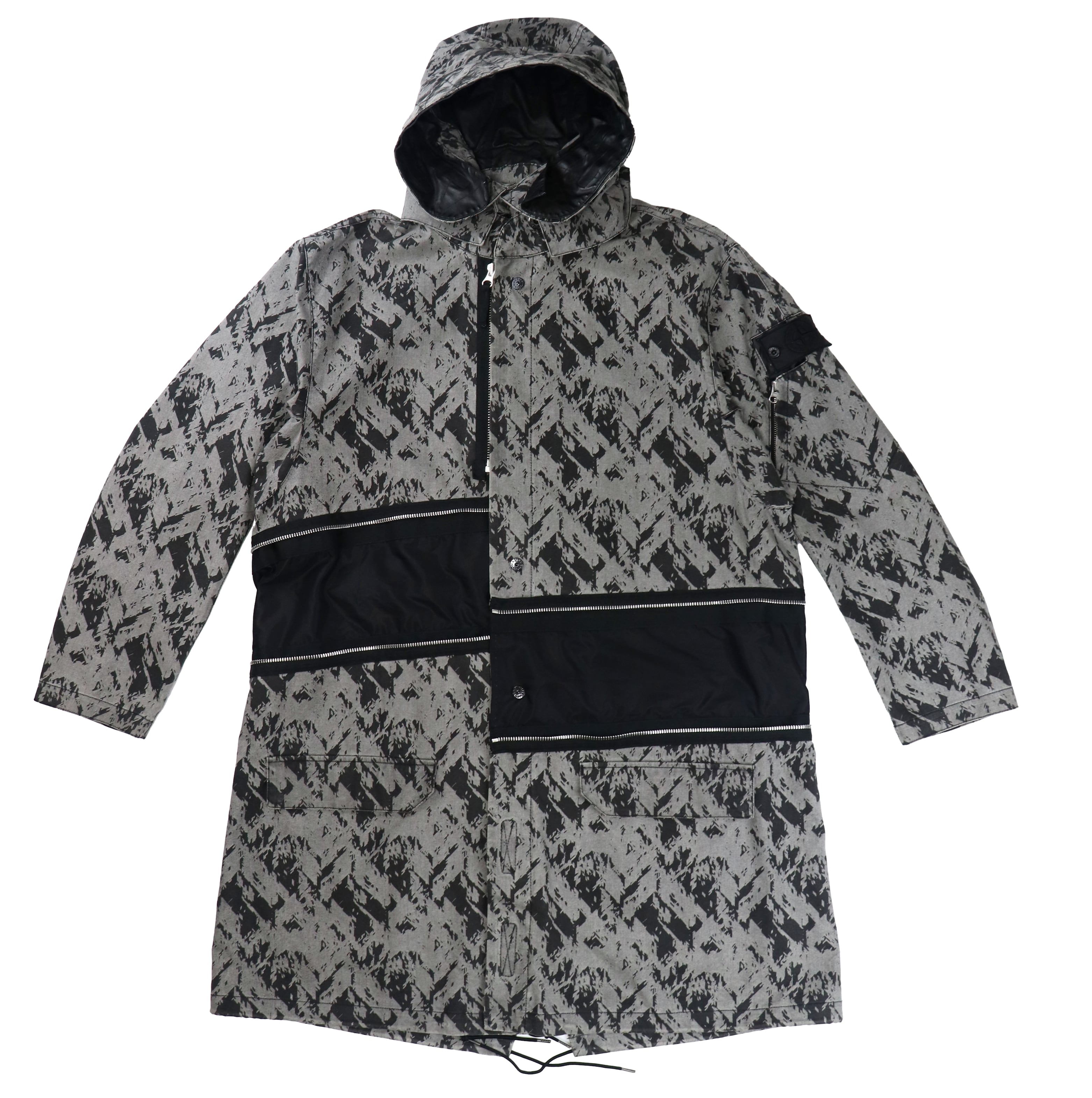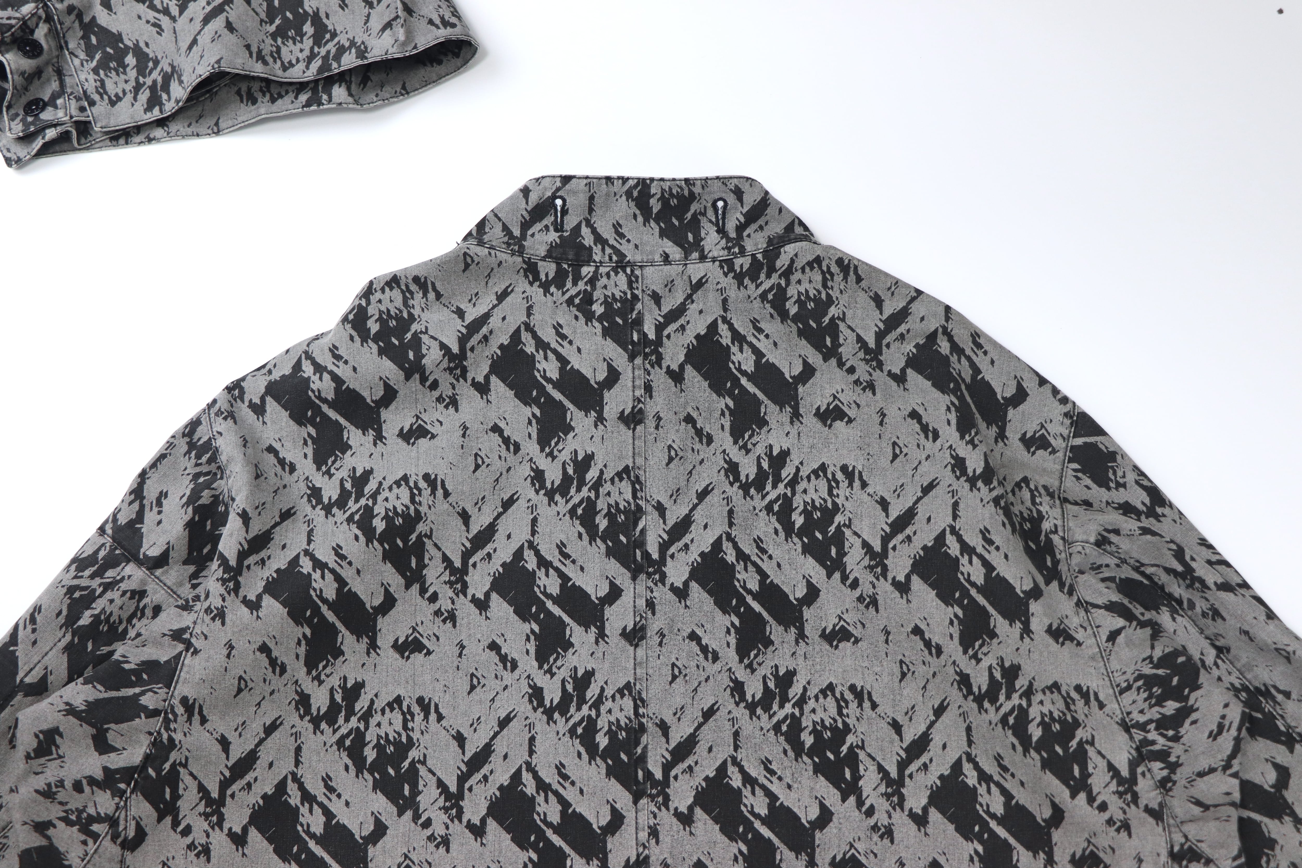 本モデルは、グラフィカルな総柄ファブリックとブラックパネルを組み合わせたコントラストの効いた配色が印象的な一着。ミリタリーやテックウェアを思わせるSHADOW PROJECTらしい雰囲気を持っています。