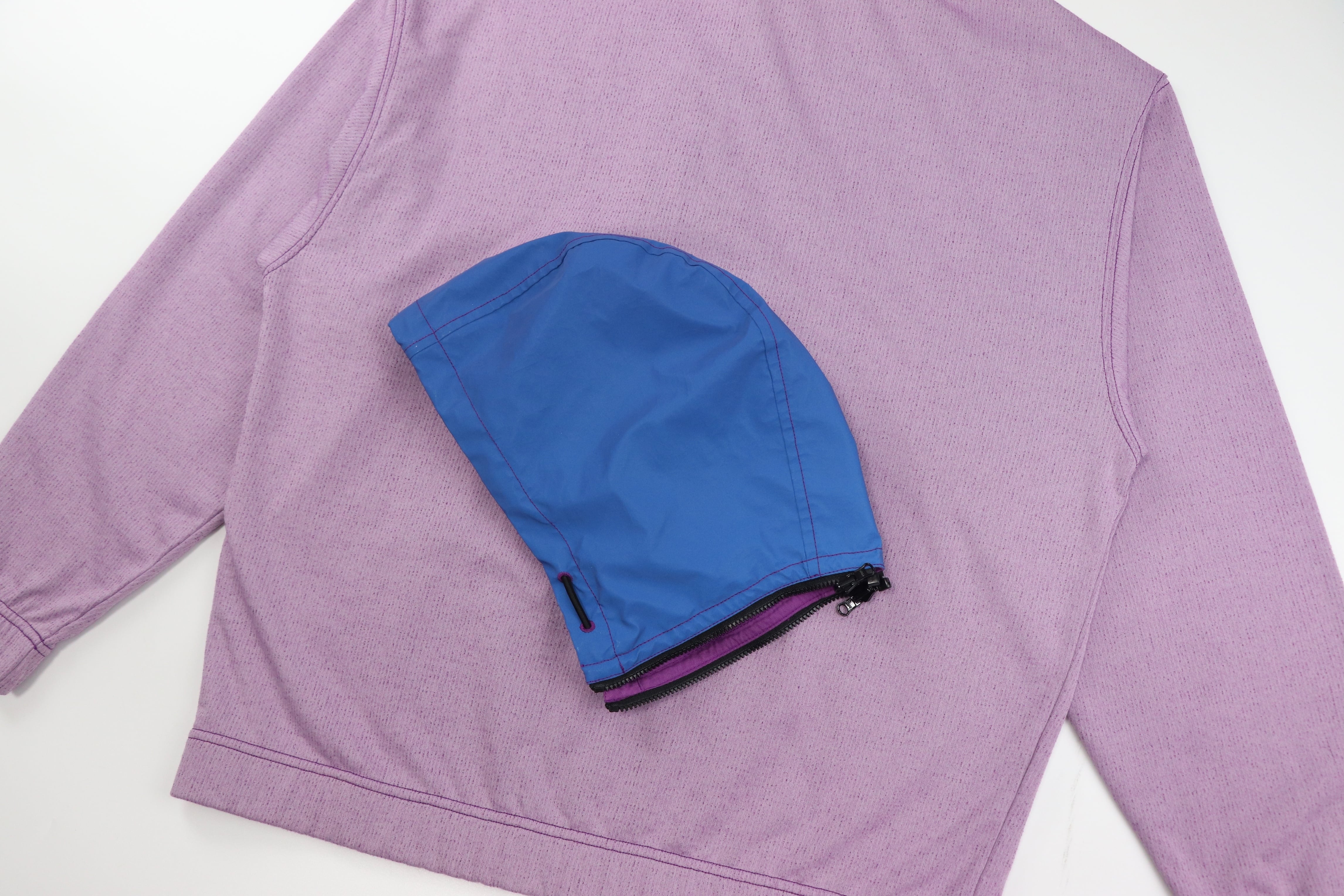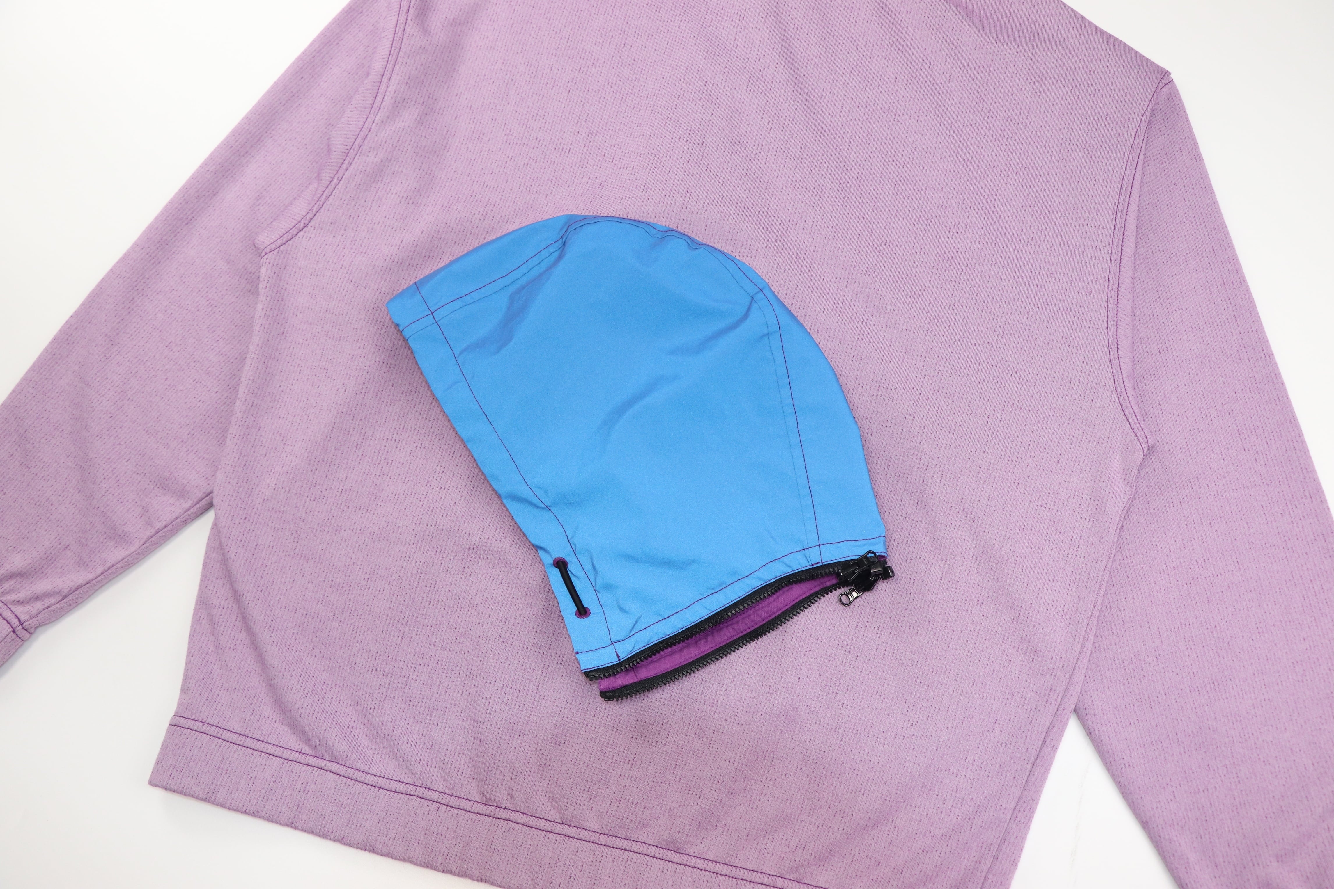 フードはジップによって取り外し可能な仕様。フード付きのスポーティーなスタイルから、襟付きスウェットのようなミニマルなスタイルまで、着こなしに応じて印象を変えることができます。
