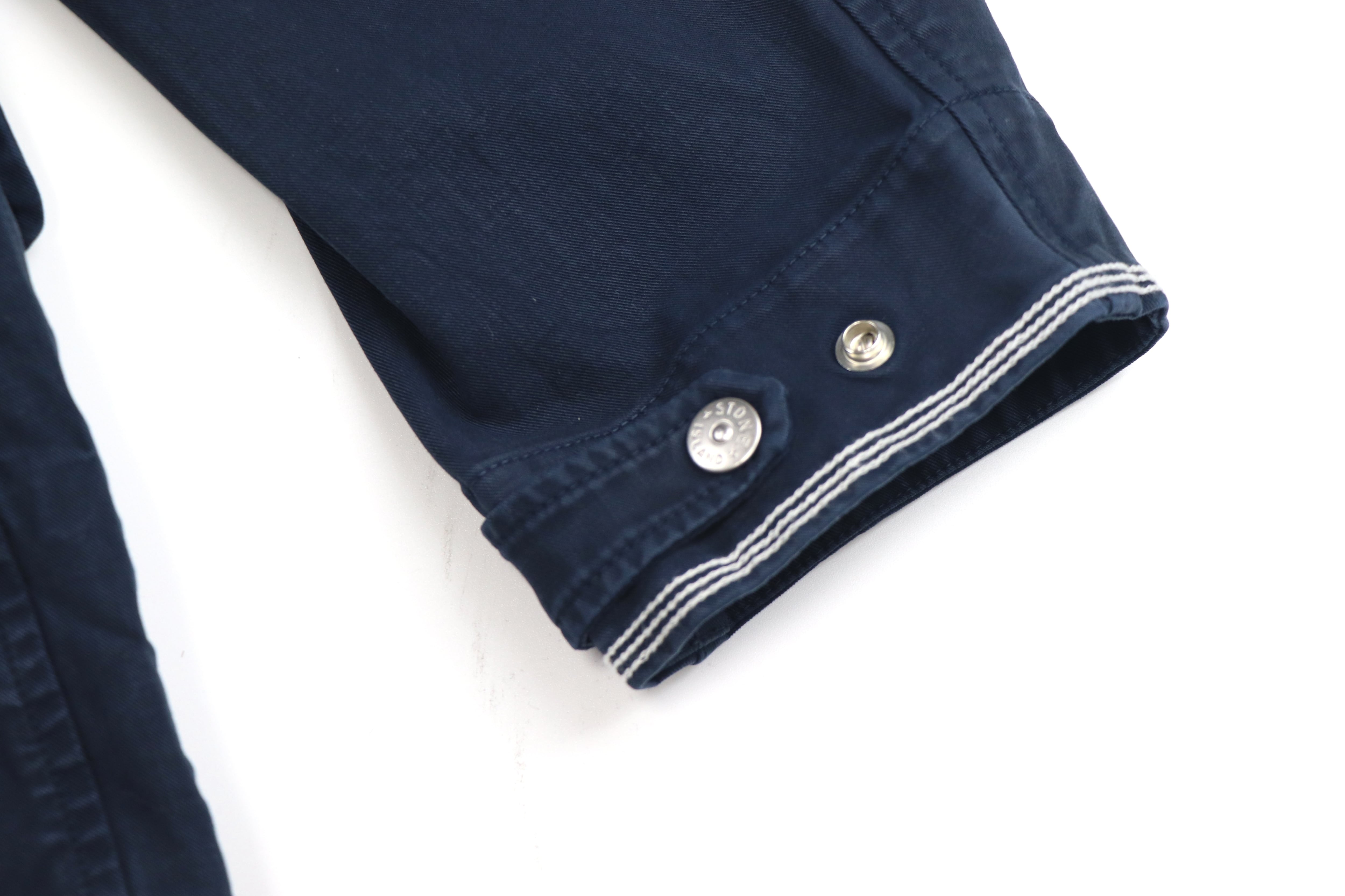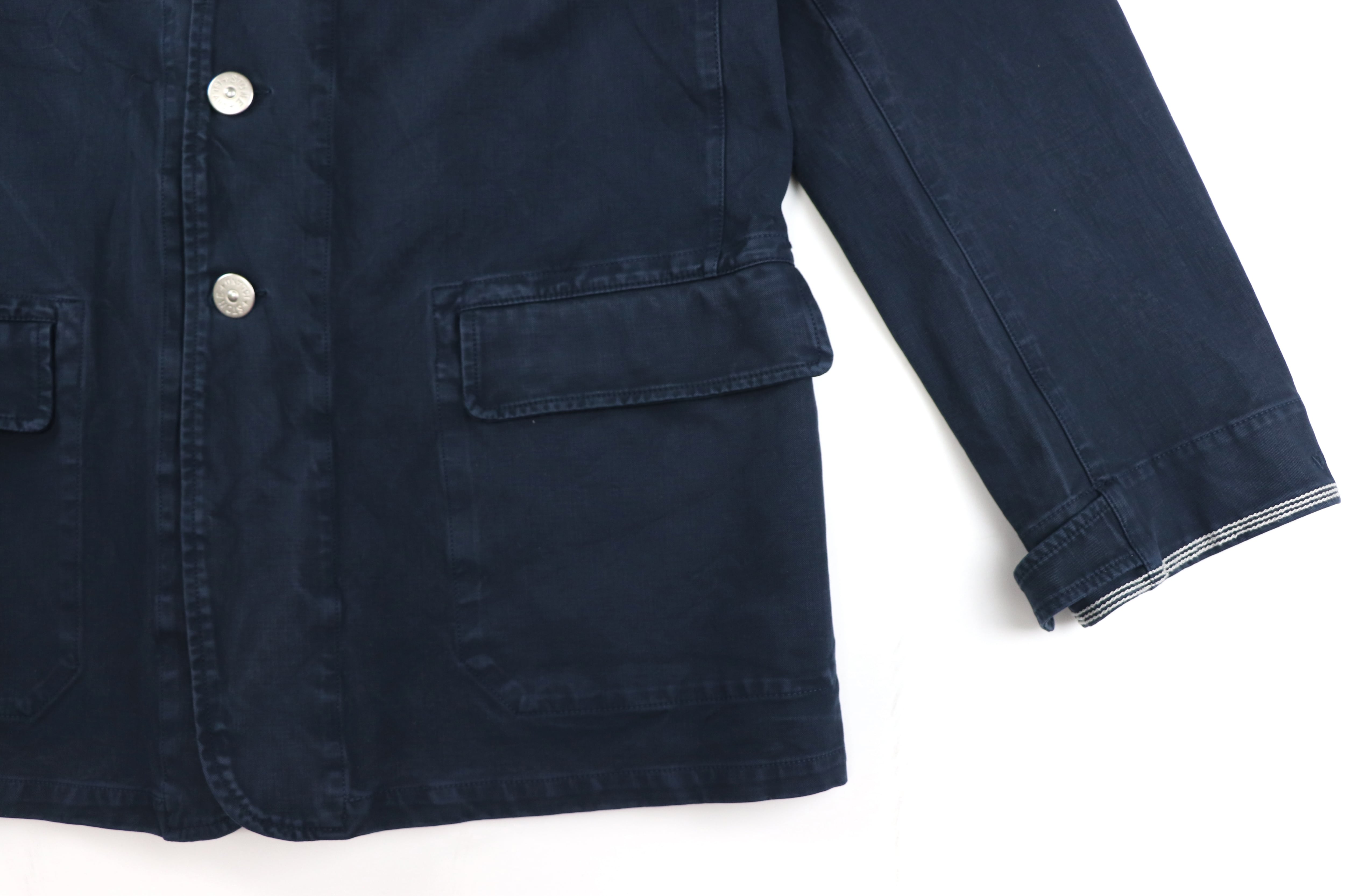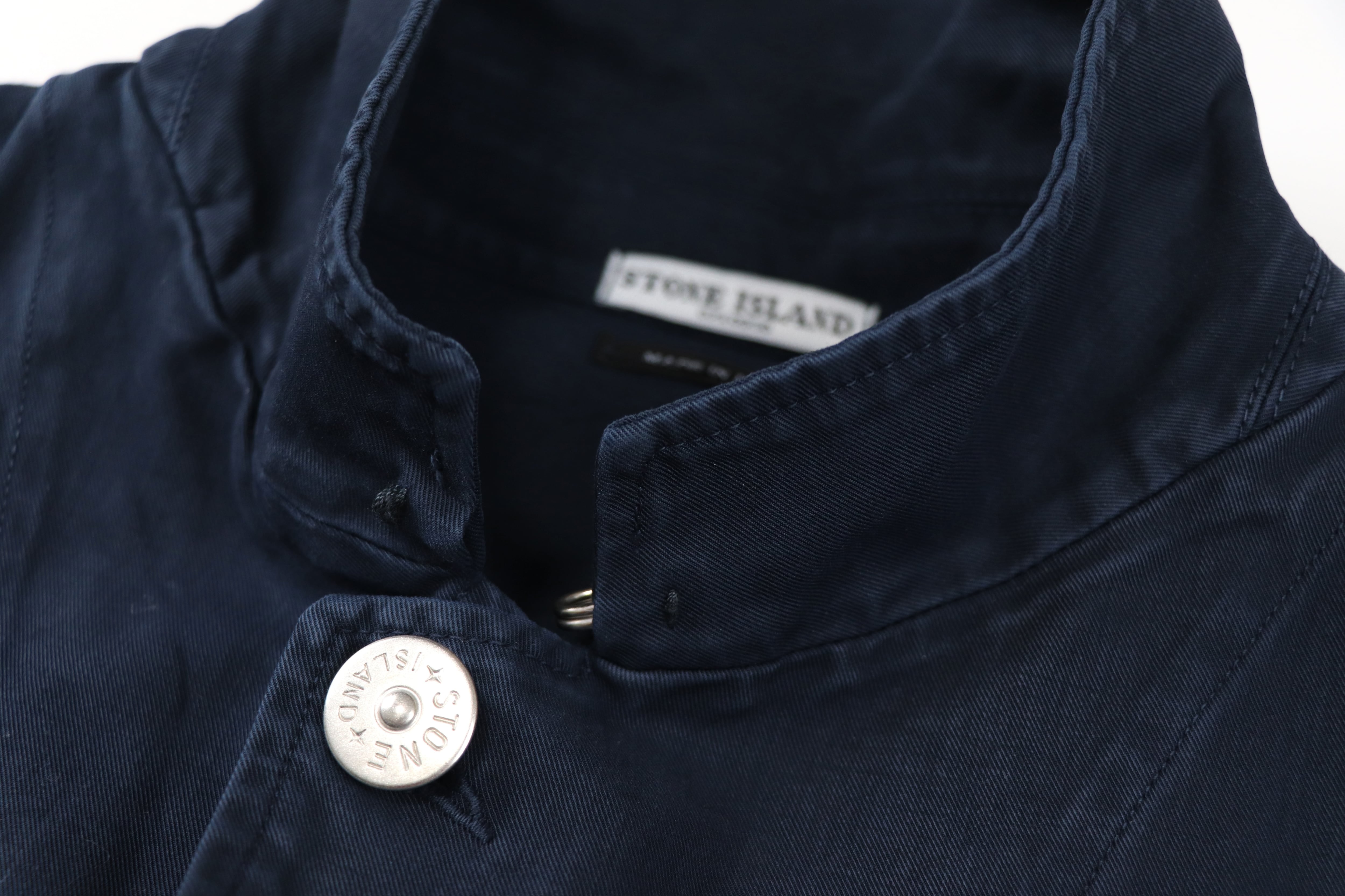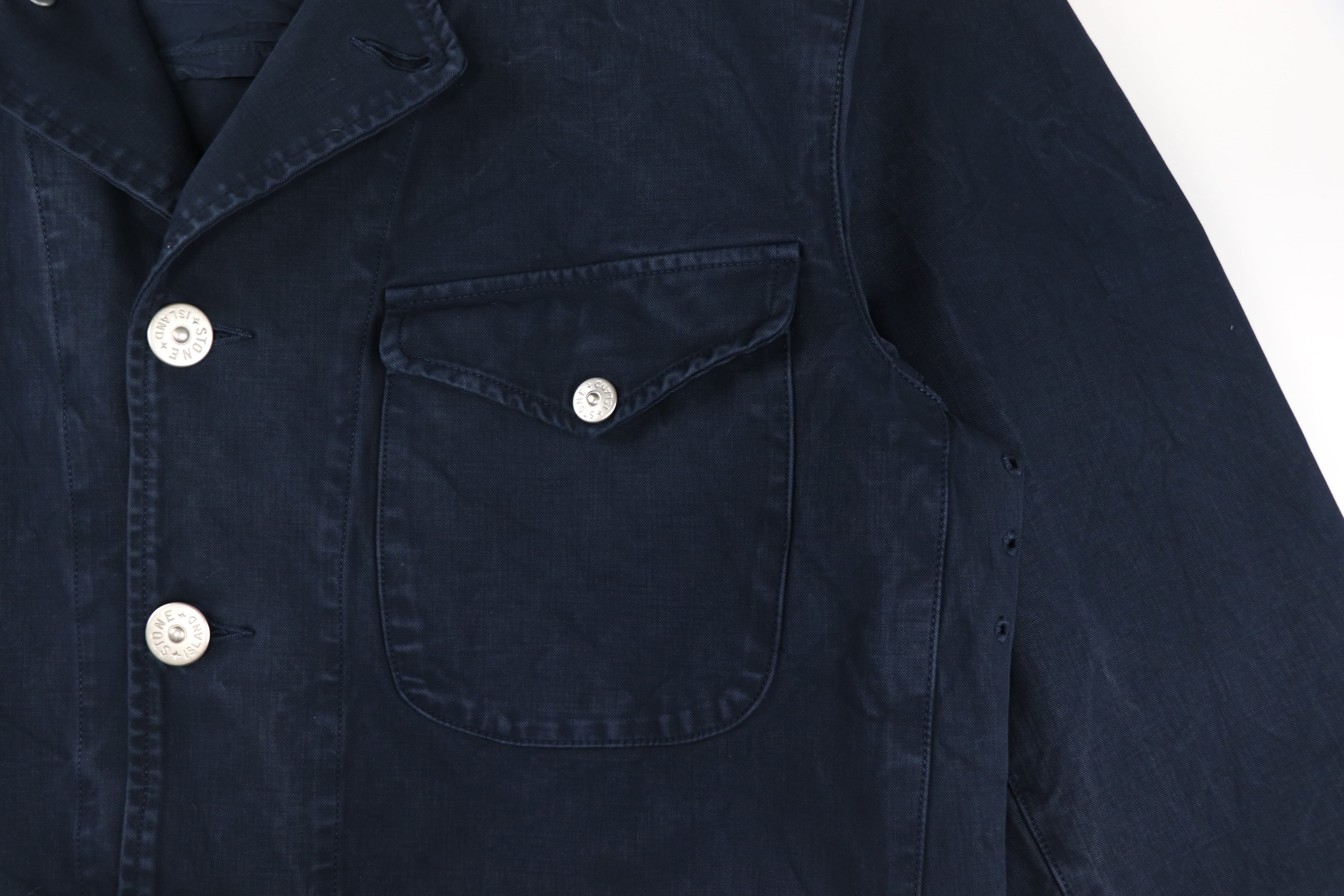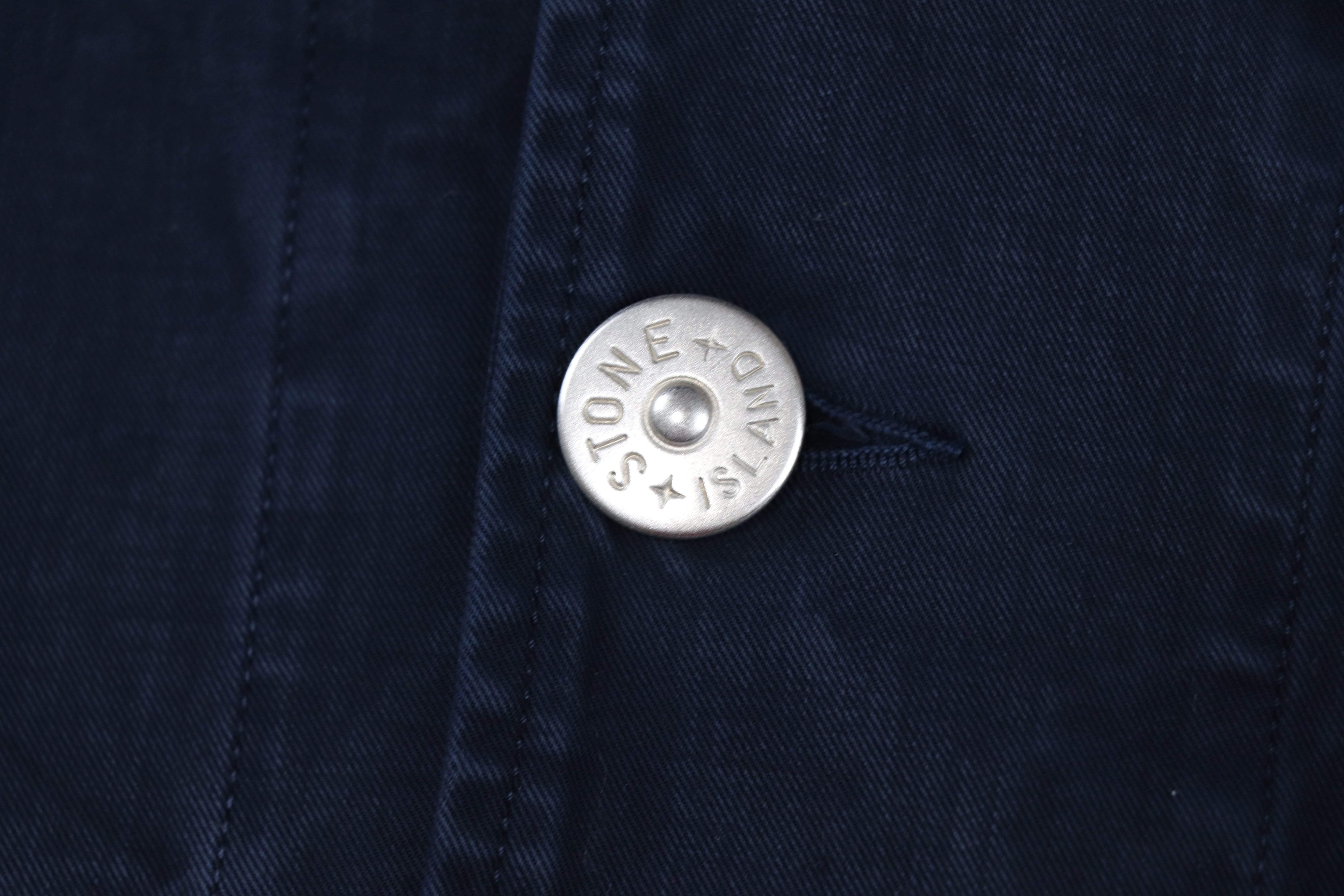 フロントにはStone Island刻印入りのボタンを採用。シルバーカラーの品のある光沢が、ワークジャケットの無骨な印象の中にさりげない上質さを加えています。