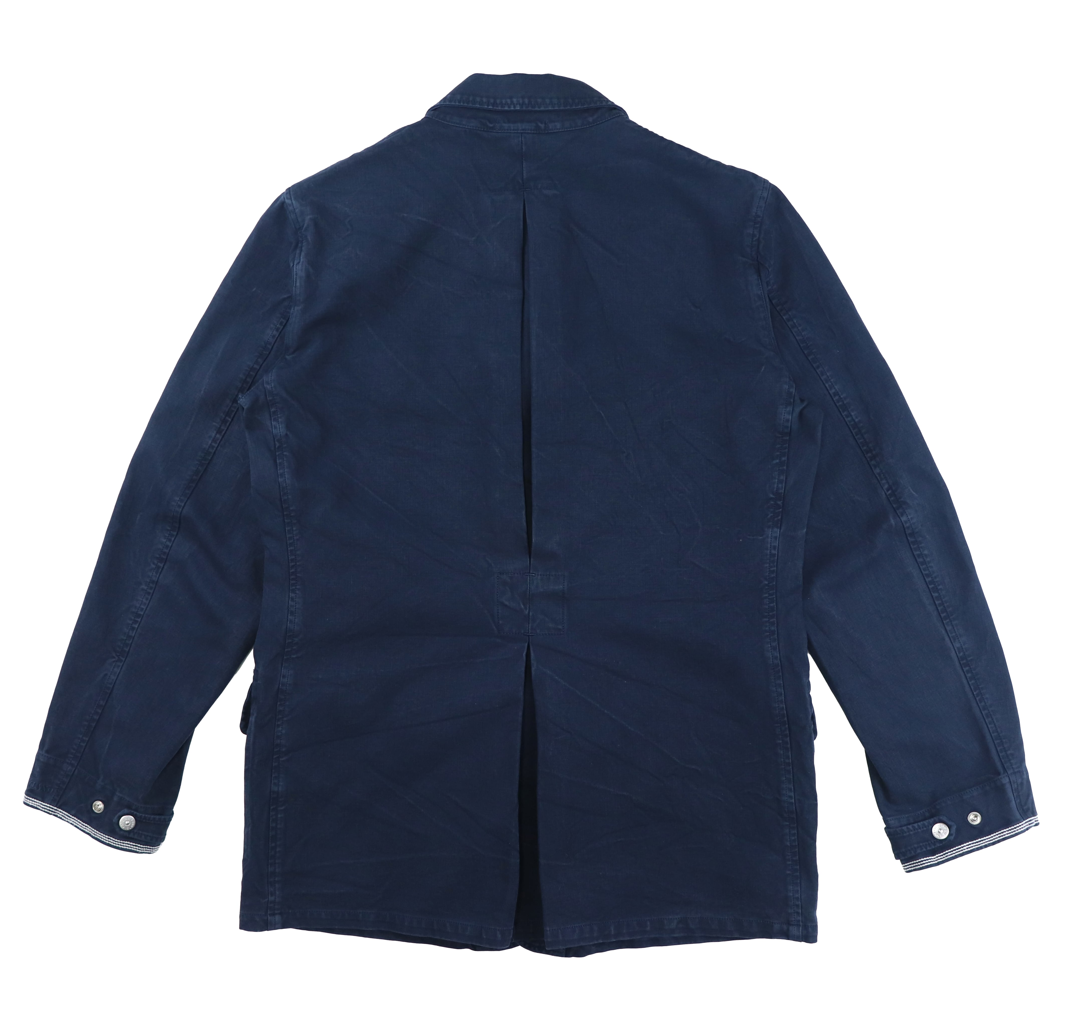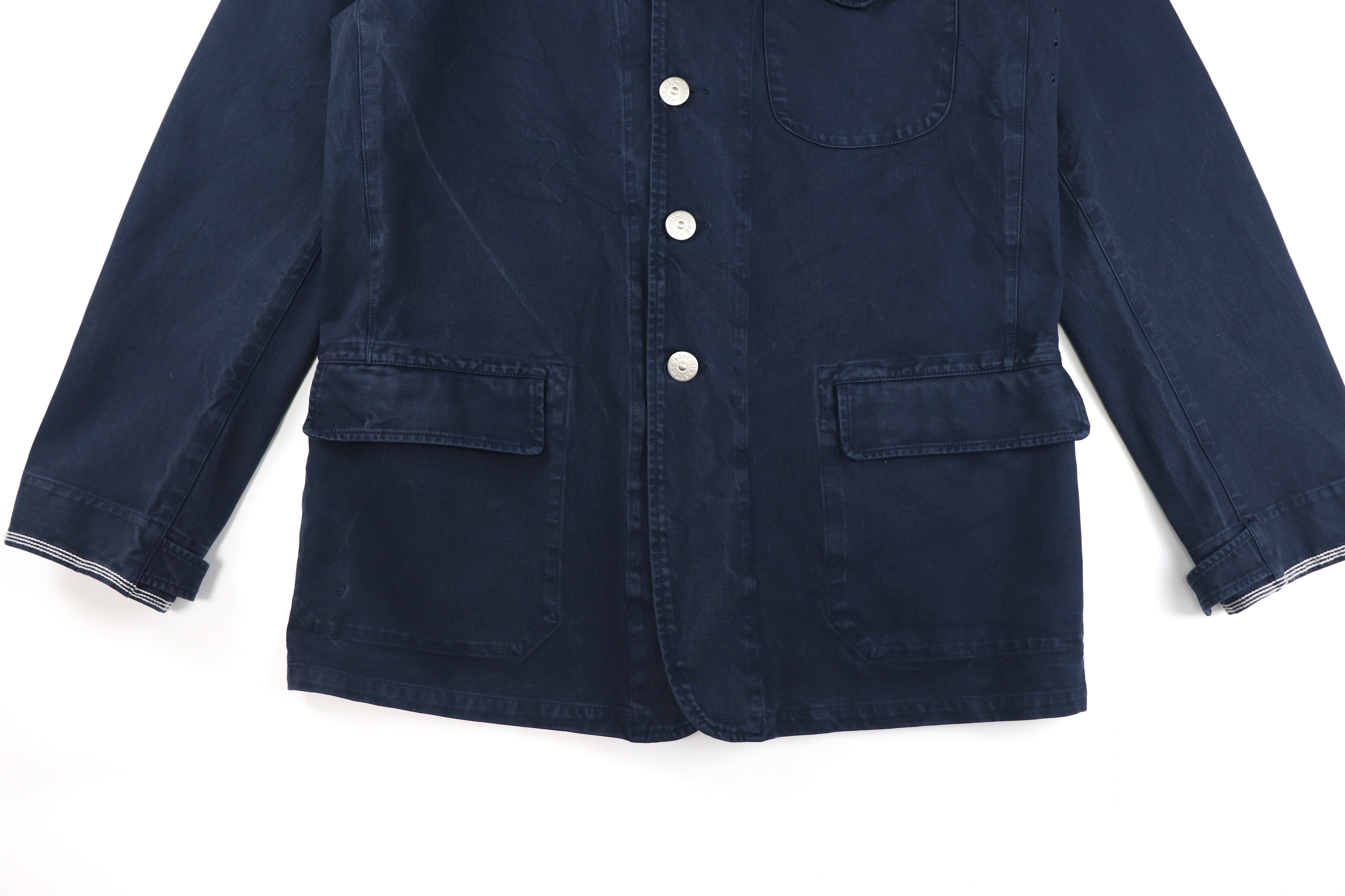 しっかりとしたデニム生地を使用したタフなワークジャケットで、日常的にラフに着込める一着。可動域の出る部分には自然なアタリが生まれており、長年着込まれたワークウェアのような雰囲気を感じさせます。着用を重ねることでさらに表情が増していく、デニムならではのエイジングも魅力です。