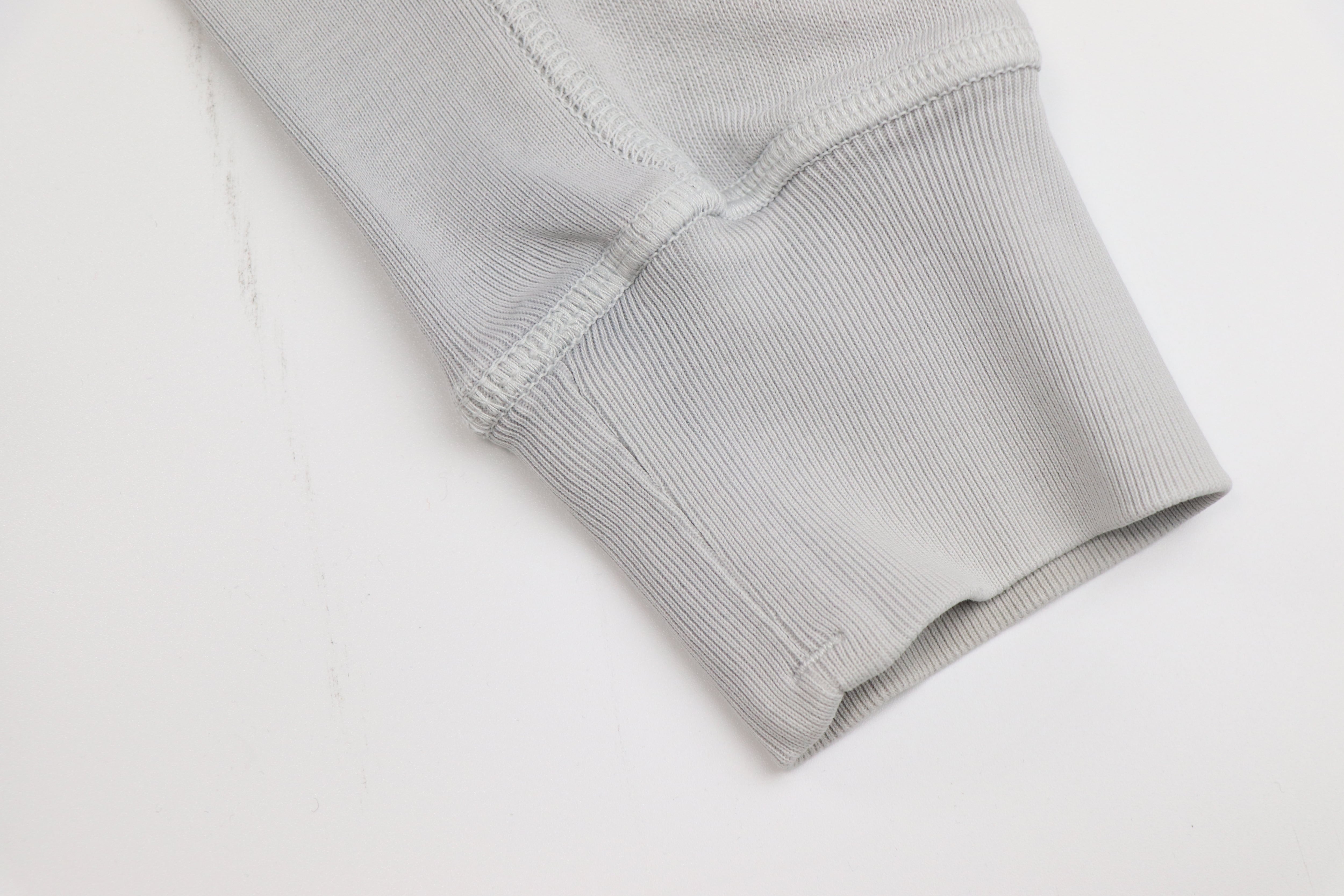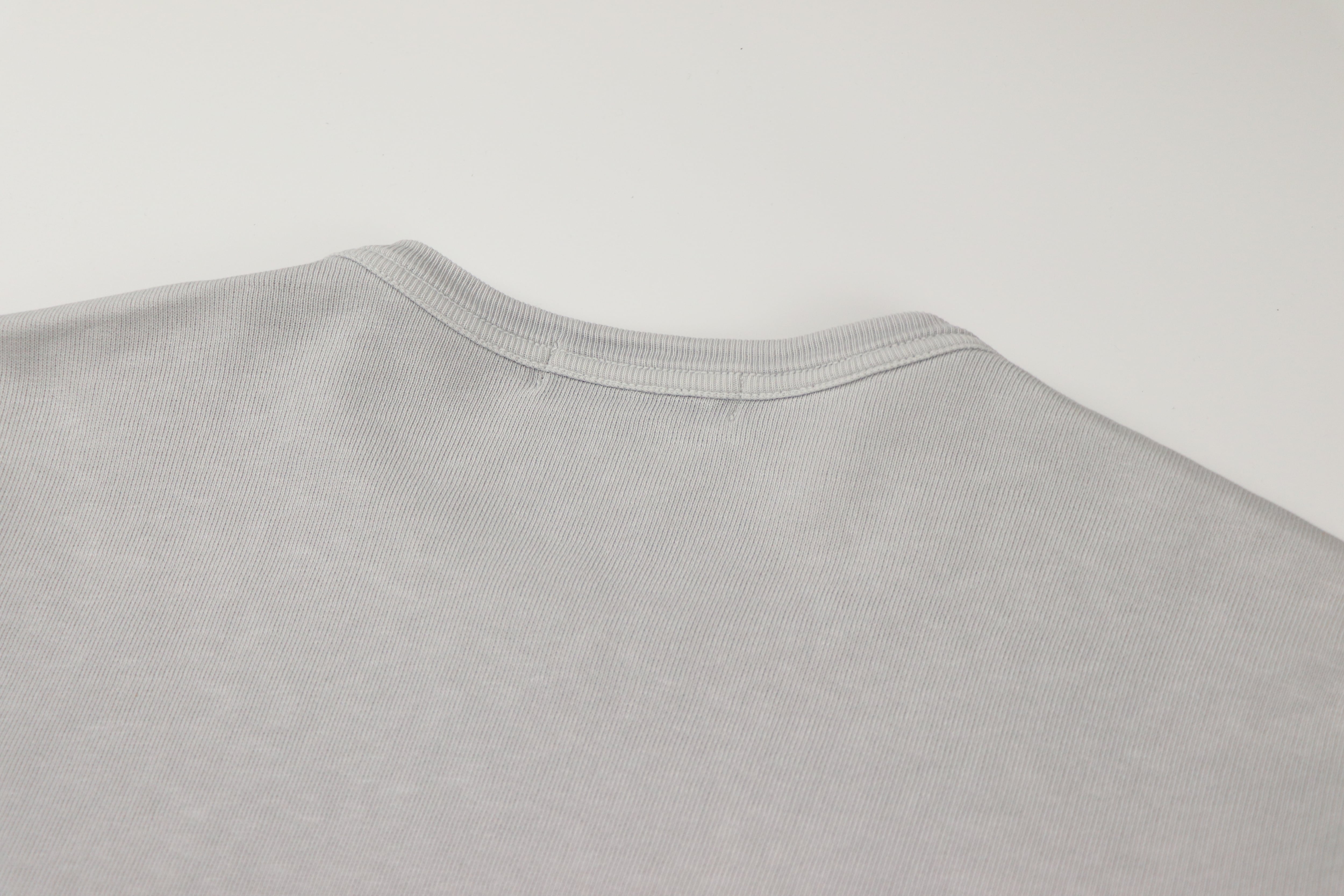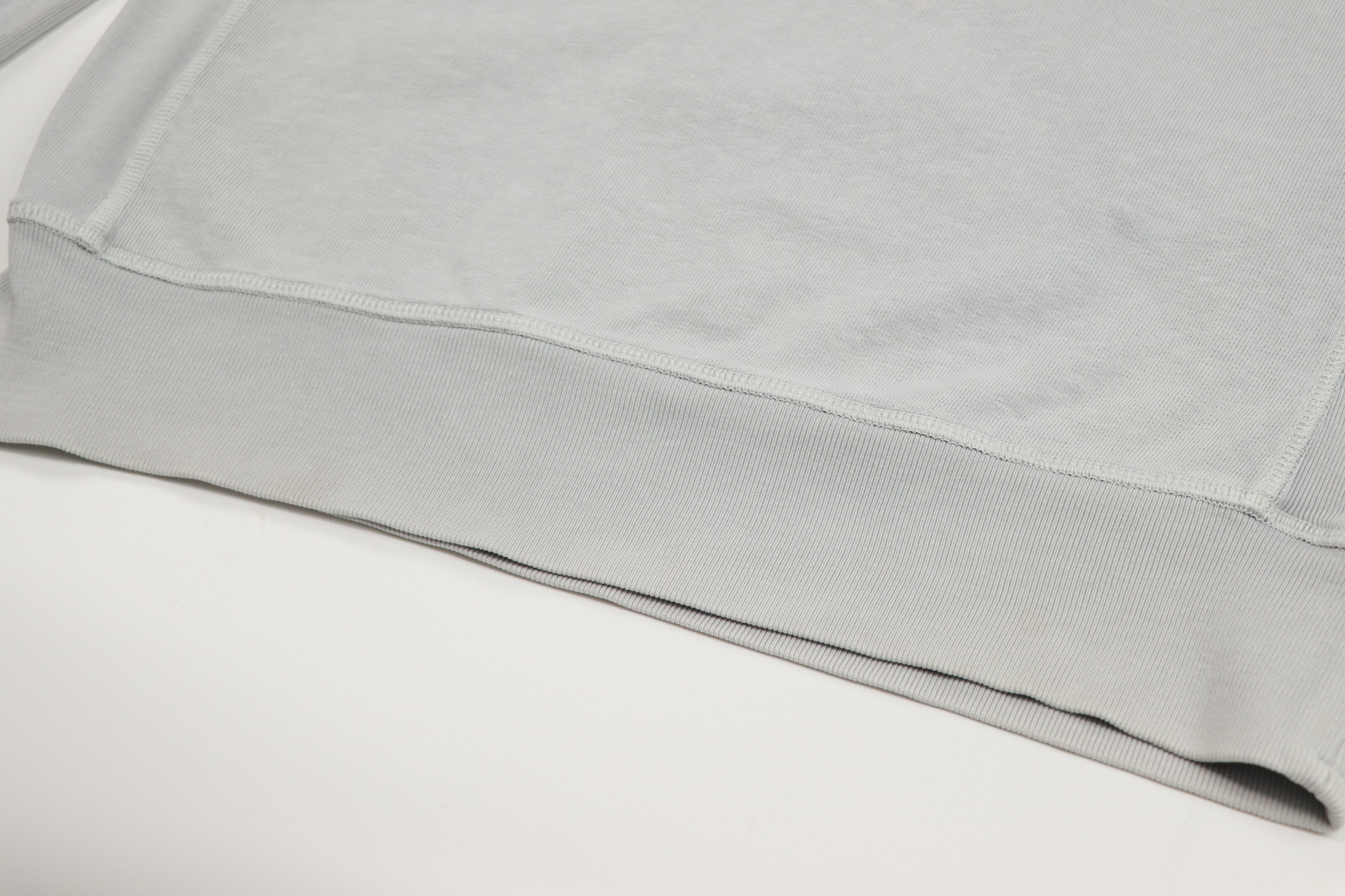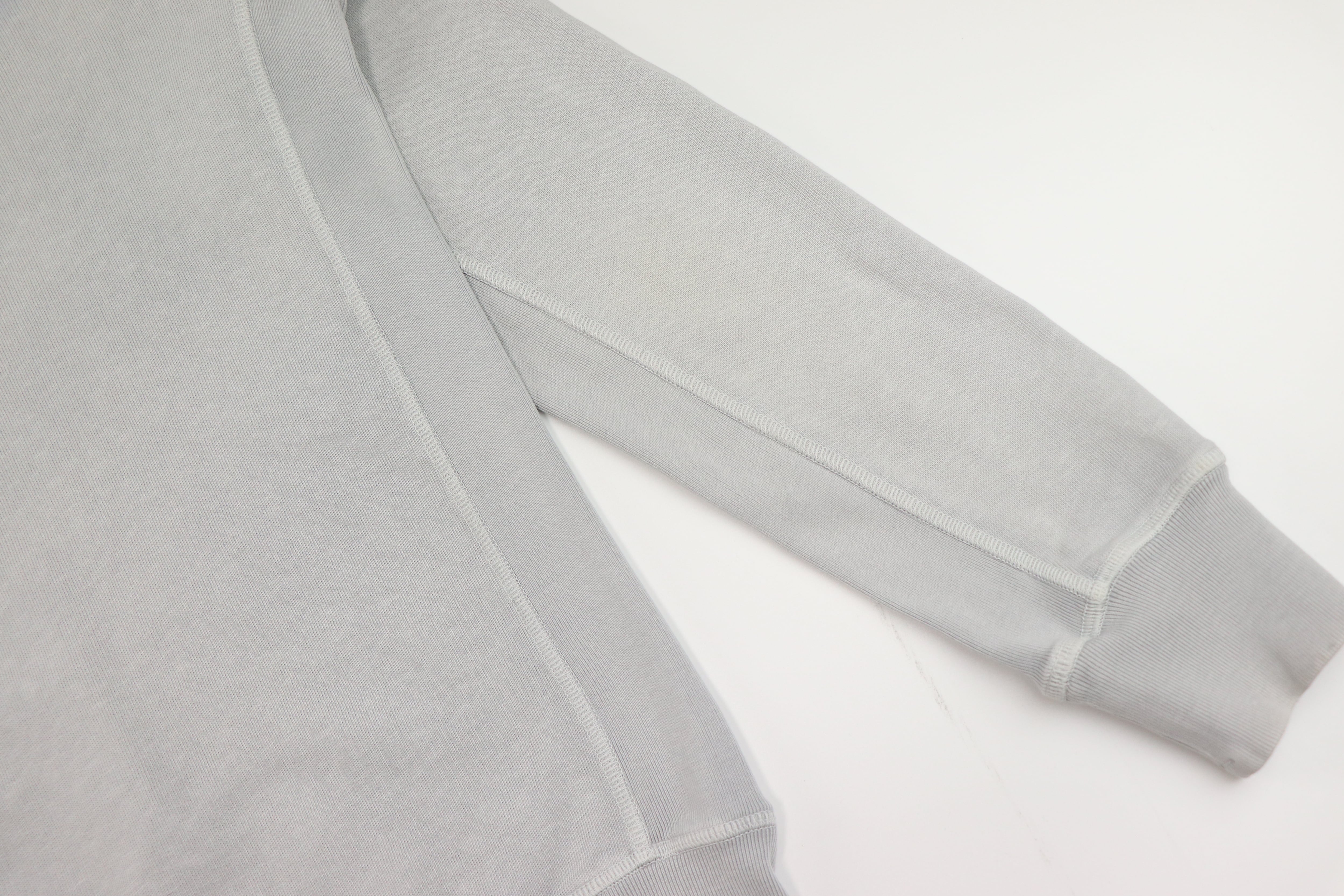 ガーメントダイによって仕上げられたアイスグレーのカラーが特徴。淡く落ち着いたグレーの中に独特のムラ感が生まれ、シンプルながらも奥行きのある表情を持つ一着です。着用と洗いを重ねることで生地のアタリや色の変化が現れ、経年変化を楽しみながら長く愛用できるのも魅力です。
