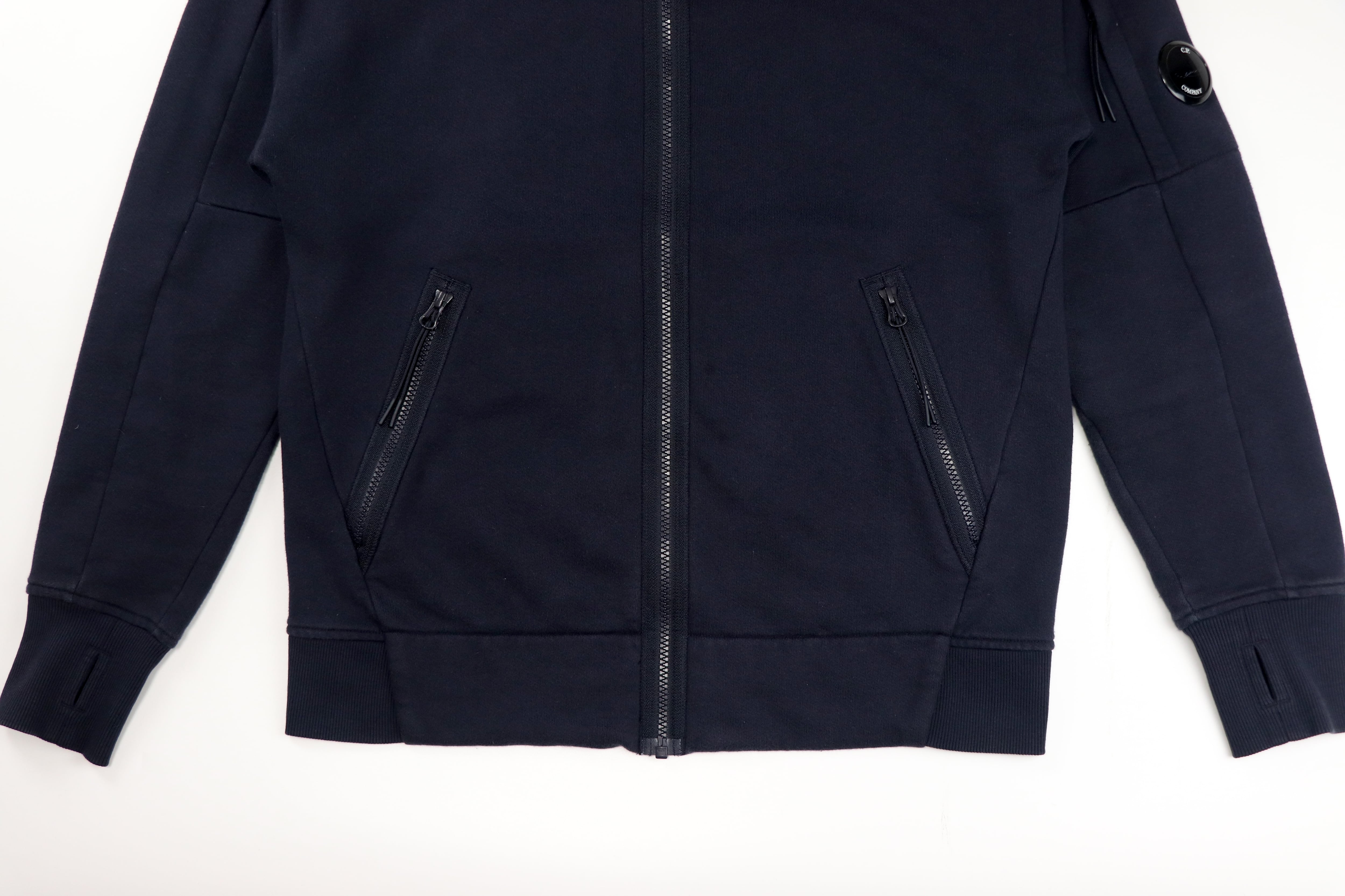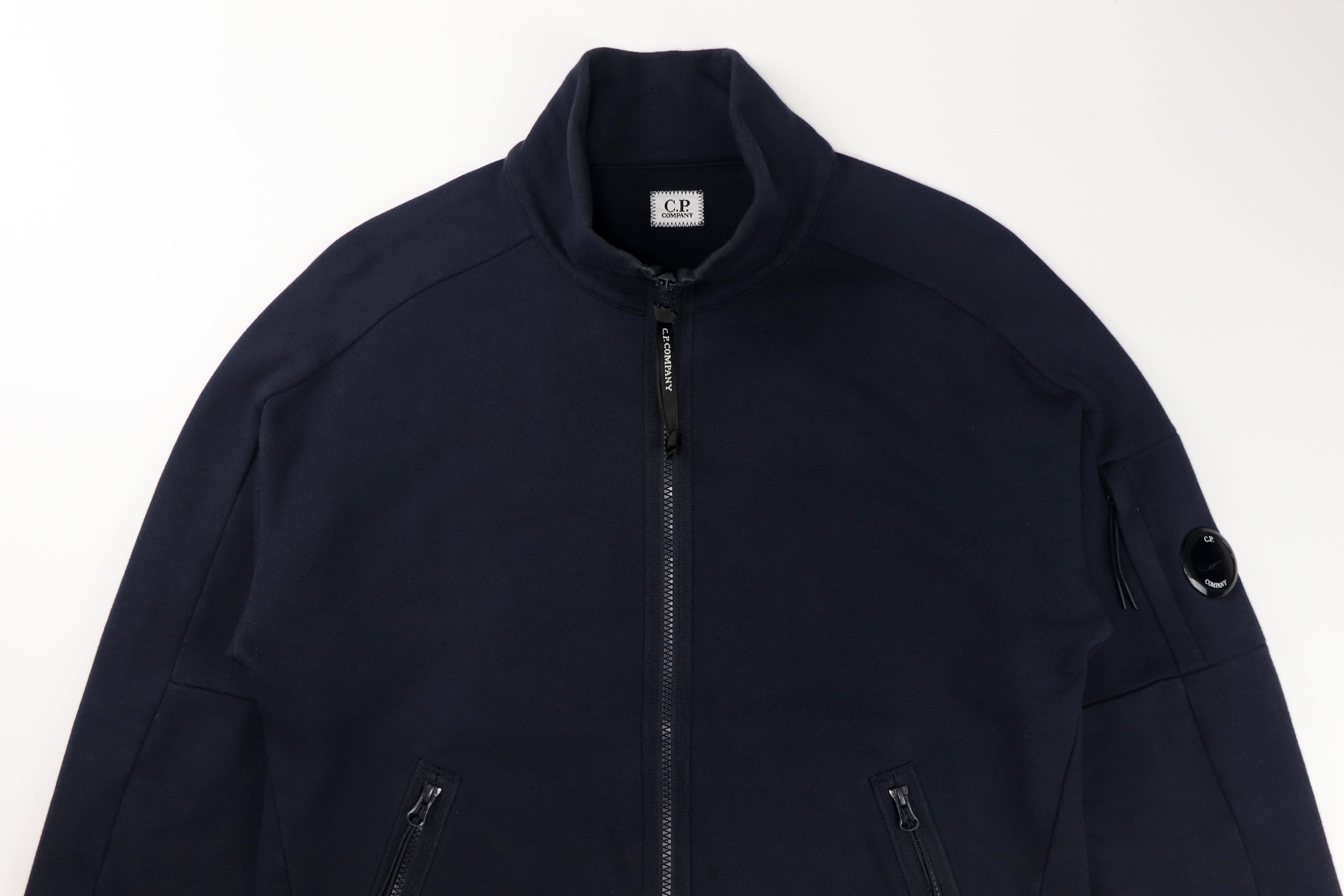 フロントは着脱しやすいフルジップ仕様。シンプルで使いやすいシルエットのため、アウターとしてもインナーとしても活躍する汎用性の高い一着です。無駄のないデザインながら、袖に配されたC.P. Companyのアイコンでもあるレンズディテールがさりげないアクセントになっています。