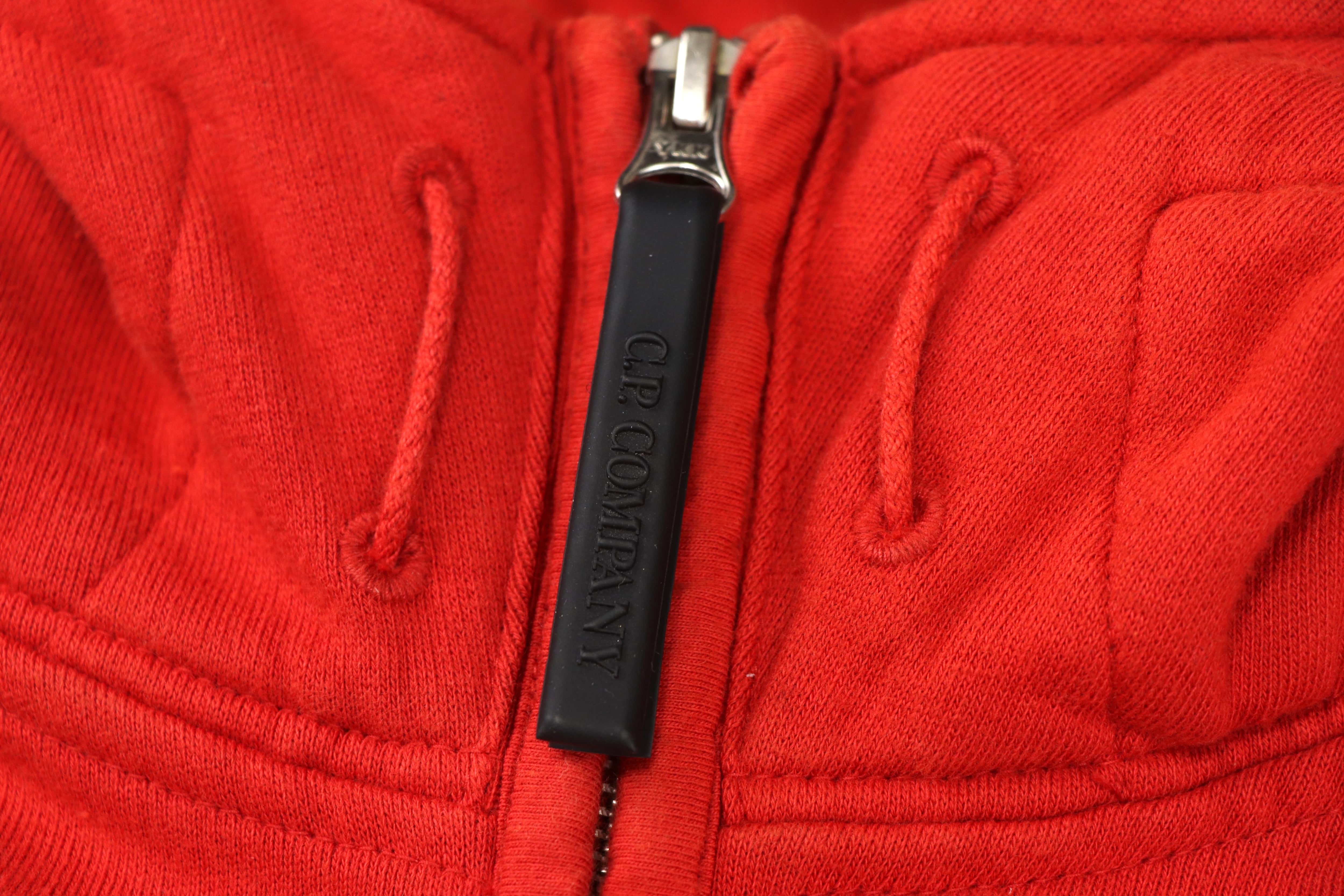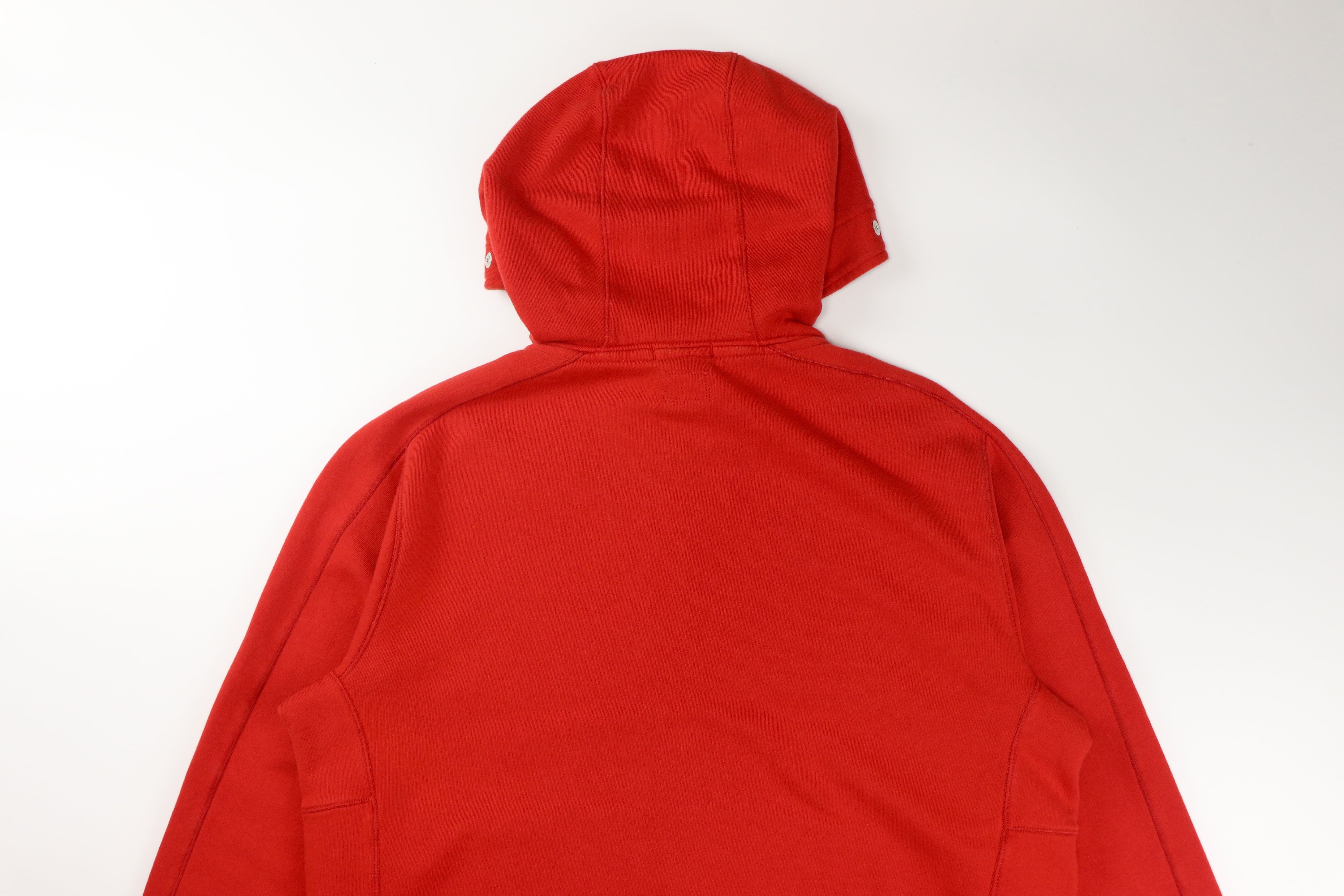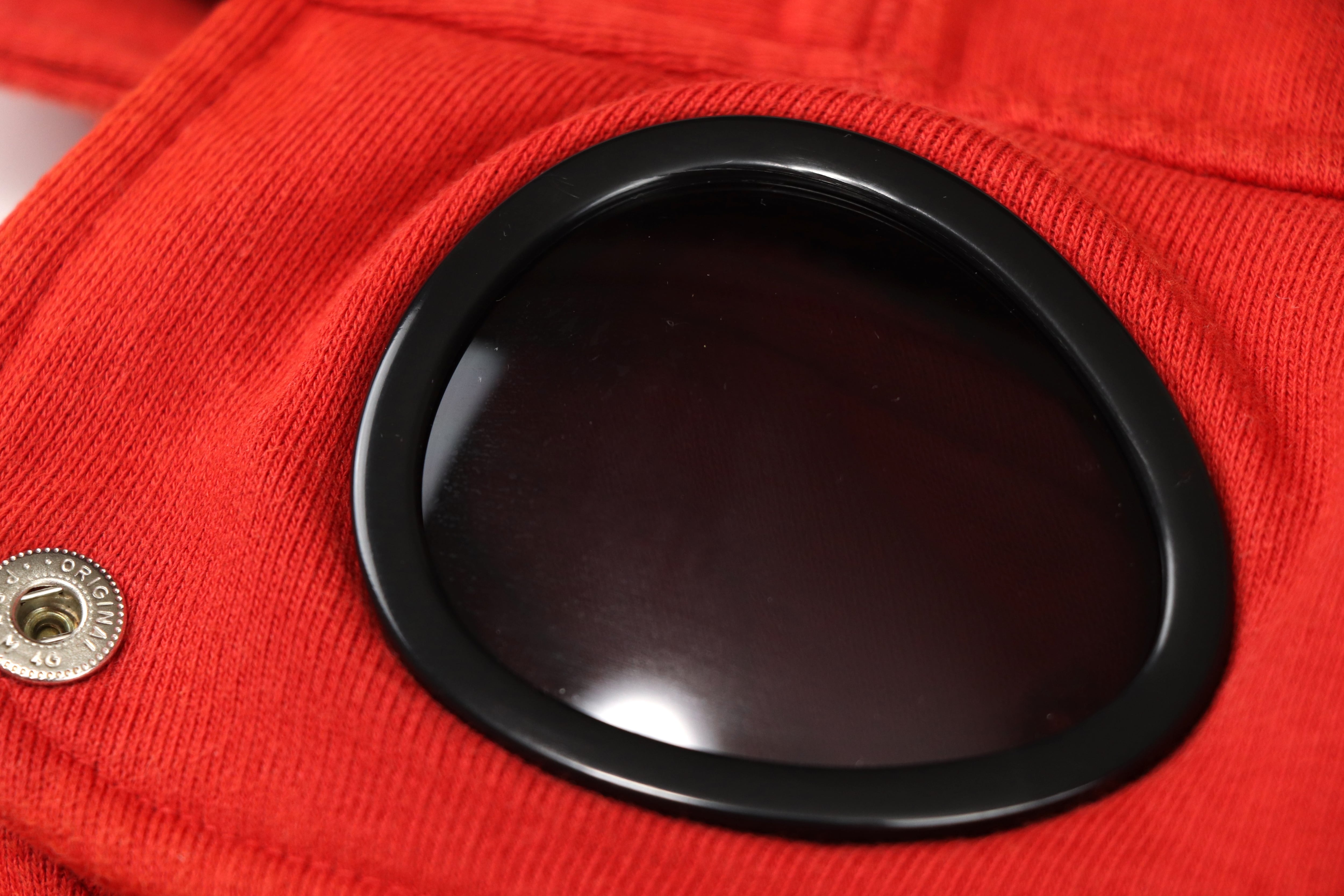 フードにはブランドのアイコンとも言えるゴーグルディテールを配置。ミリタリーウェアや機能服から着想を得たC.P. Companyらしいデザインで、フードを被った際に独特の存在感を放ちます。カラーは鮮やかな赤とオレンジの中間のようなトーン。発色の良いカラーリングが特徴で、スタイリングの主役として存在感を発揮します。