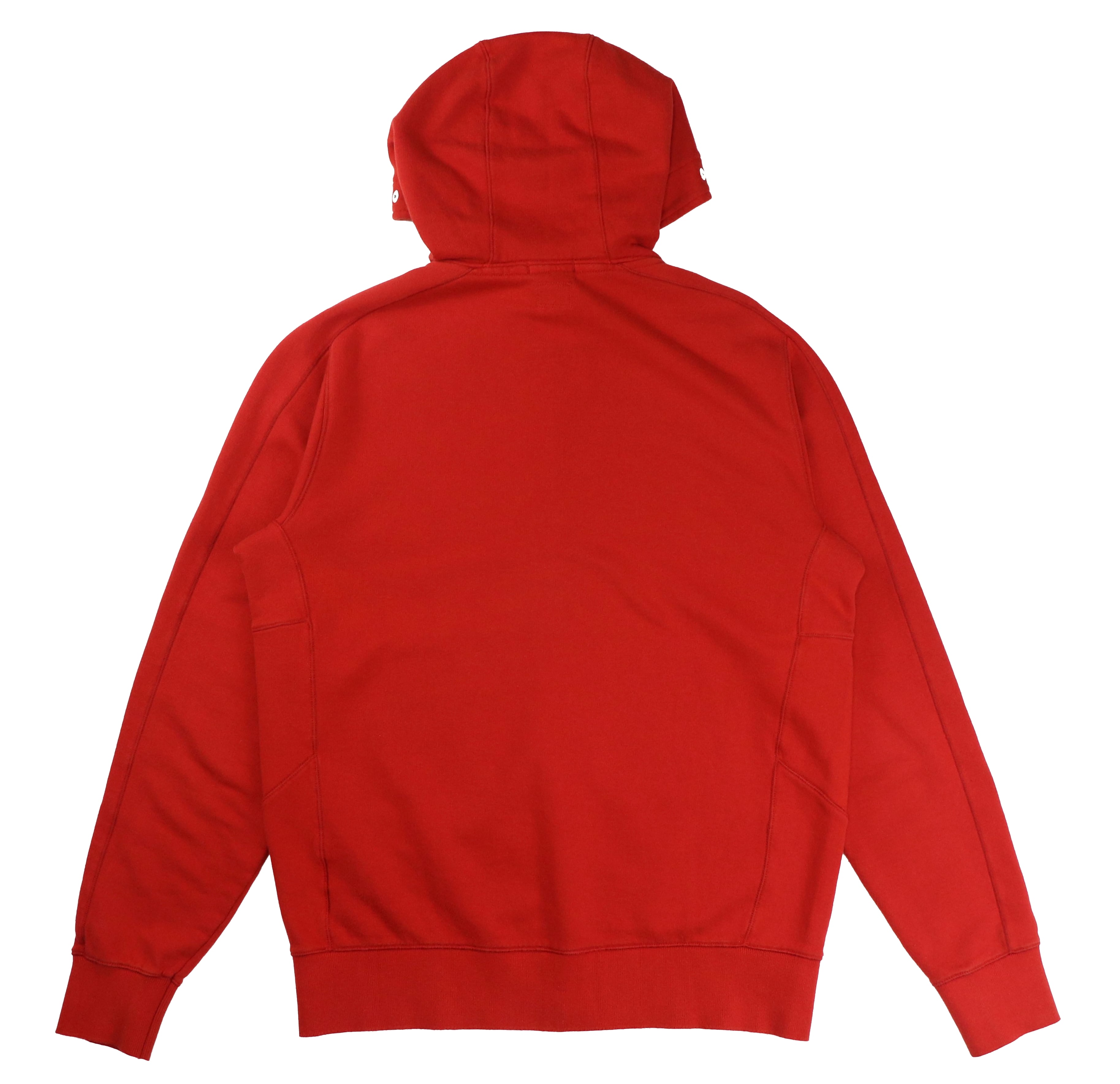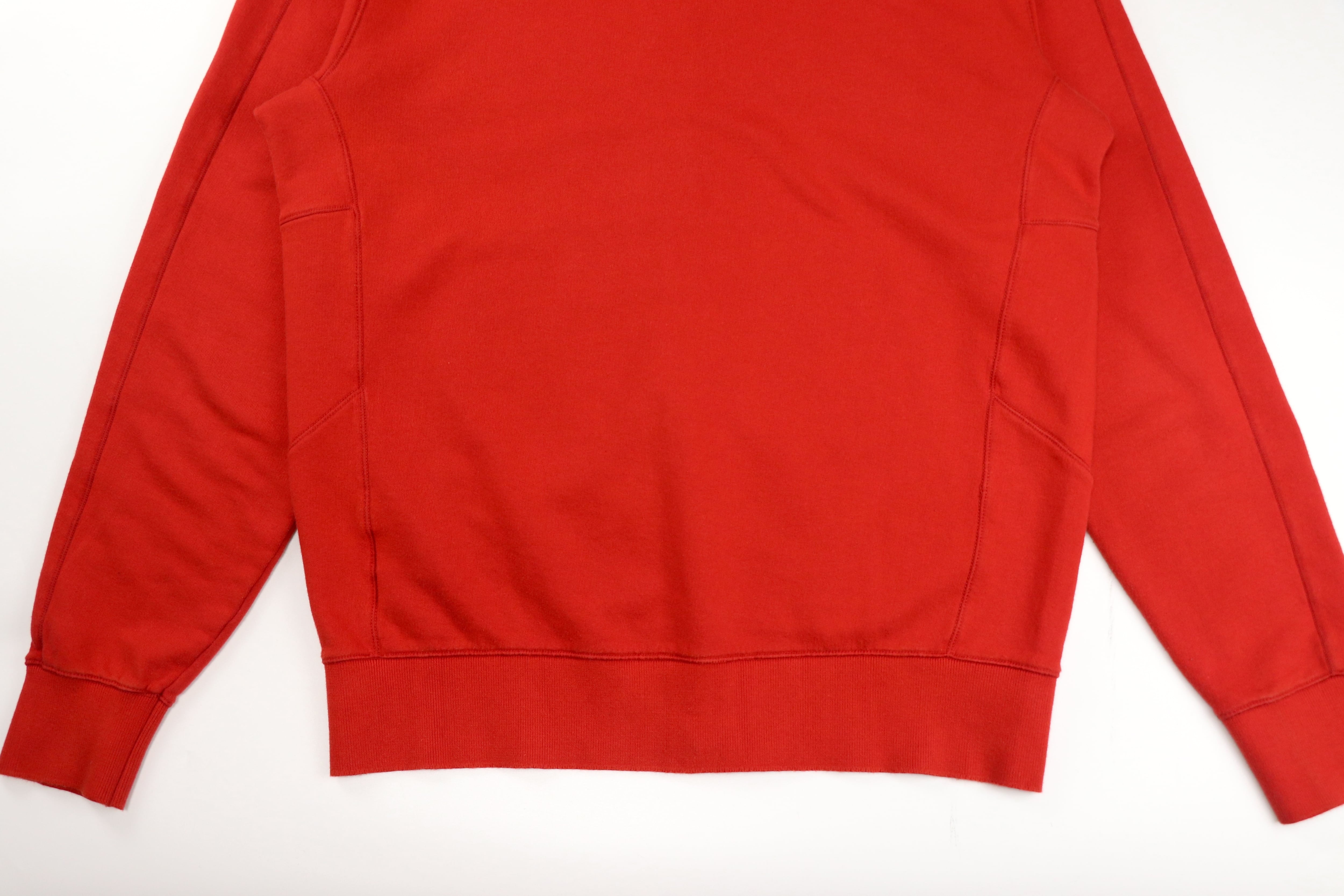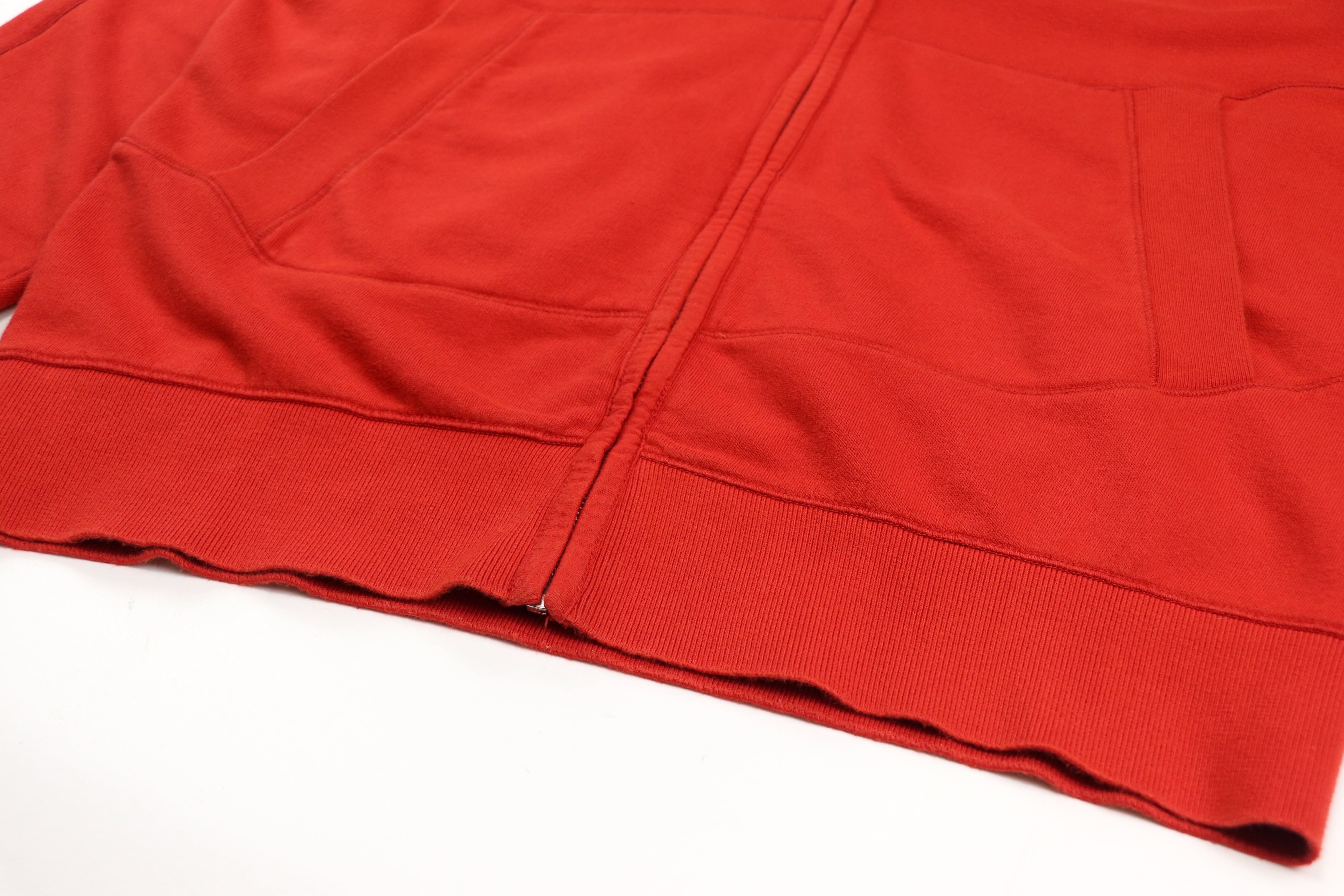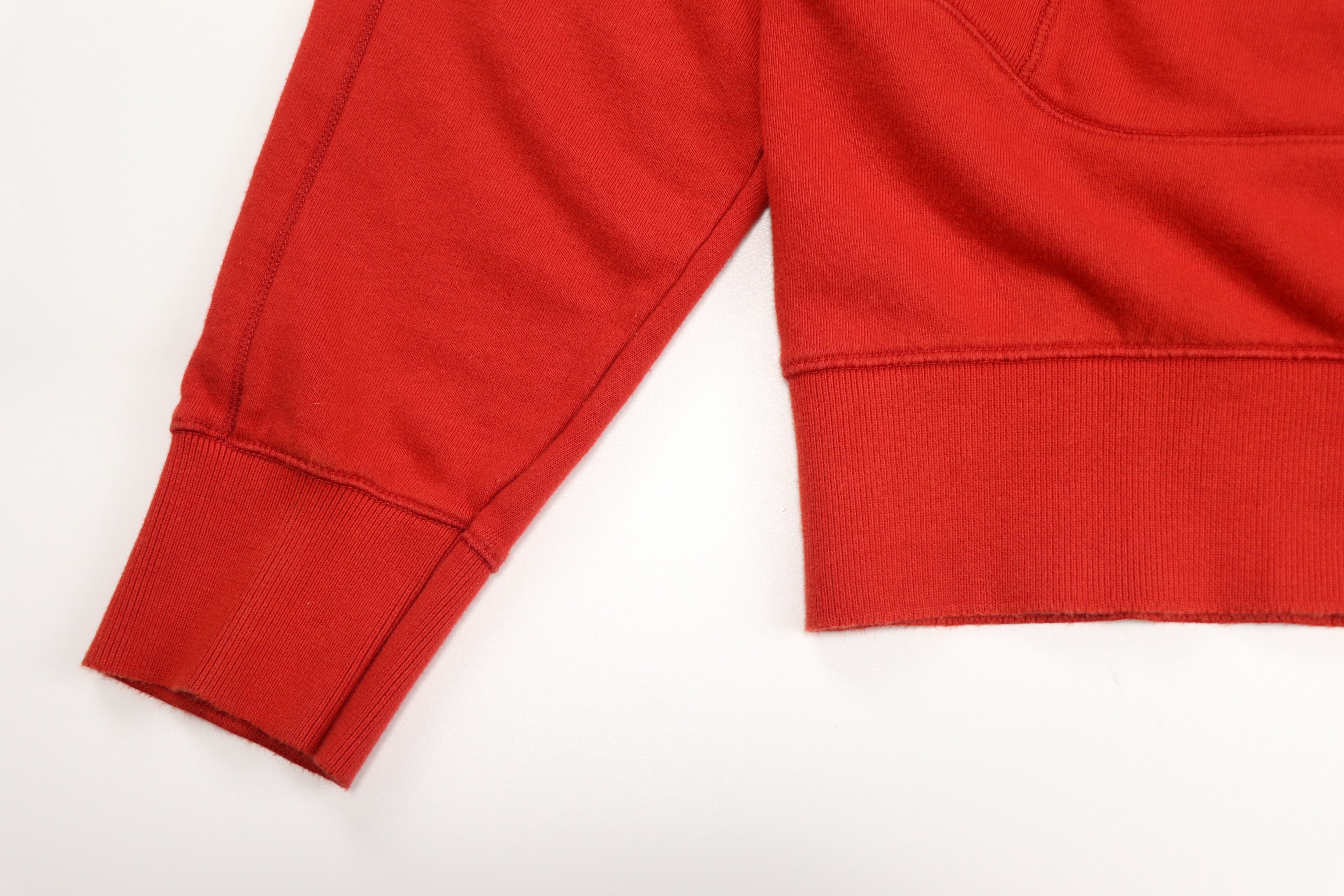 フードにはブランドのアイコンとも言えるゴーグルディテールを配置。ミリタリーウェアや機能服から着想を得たC.P. Companyらしいデザインで、フードを被った際に独特の存在感を放ちます。カラーは鮮やかな赤とオレンジの中間のようなトーン。発色の良いカラーリングが特徴で、スタイリングの主役として存在感を発揮します。