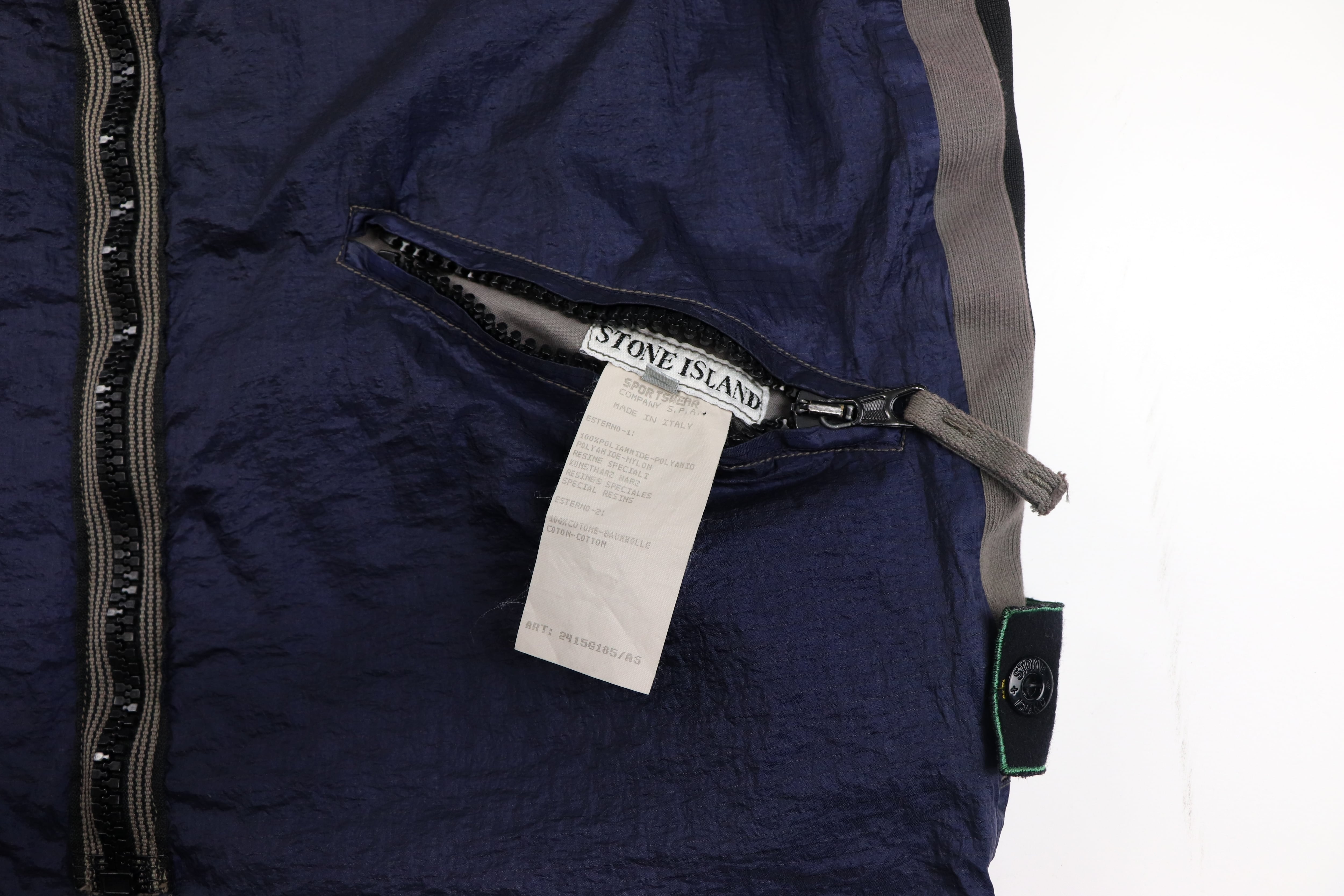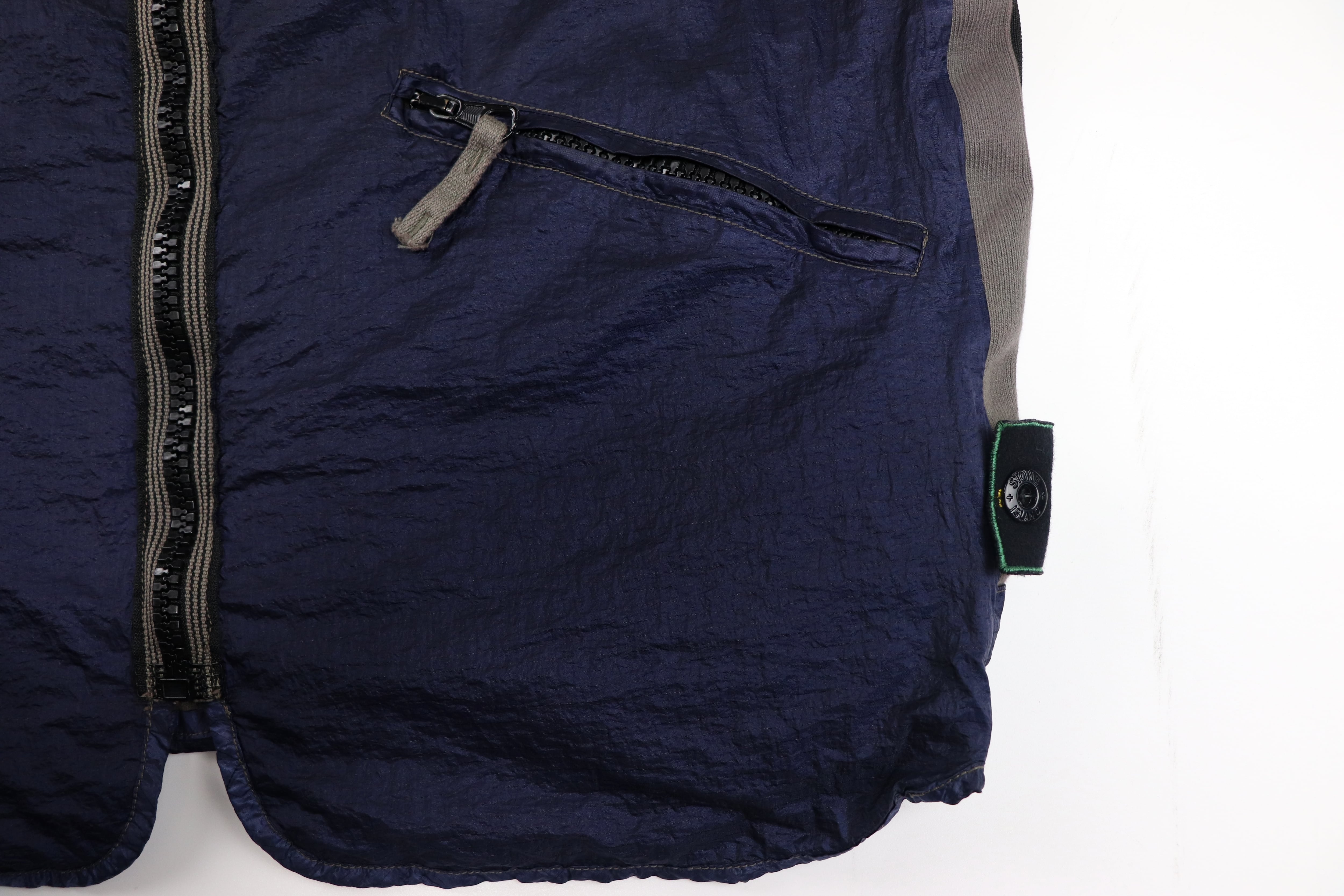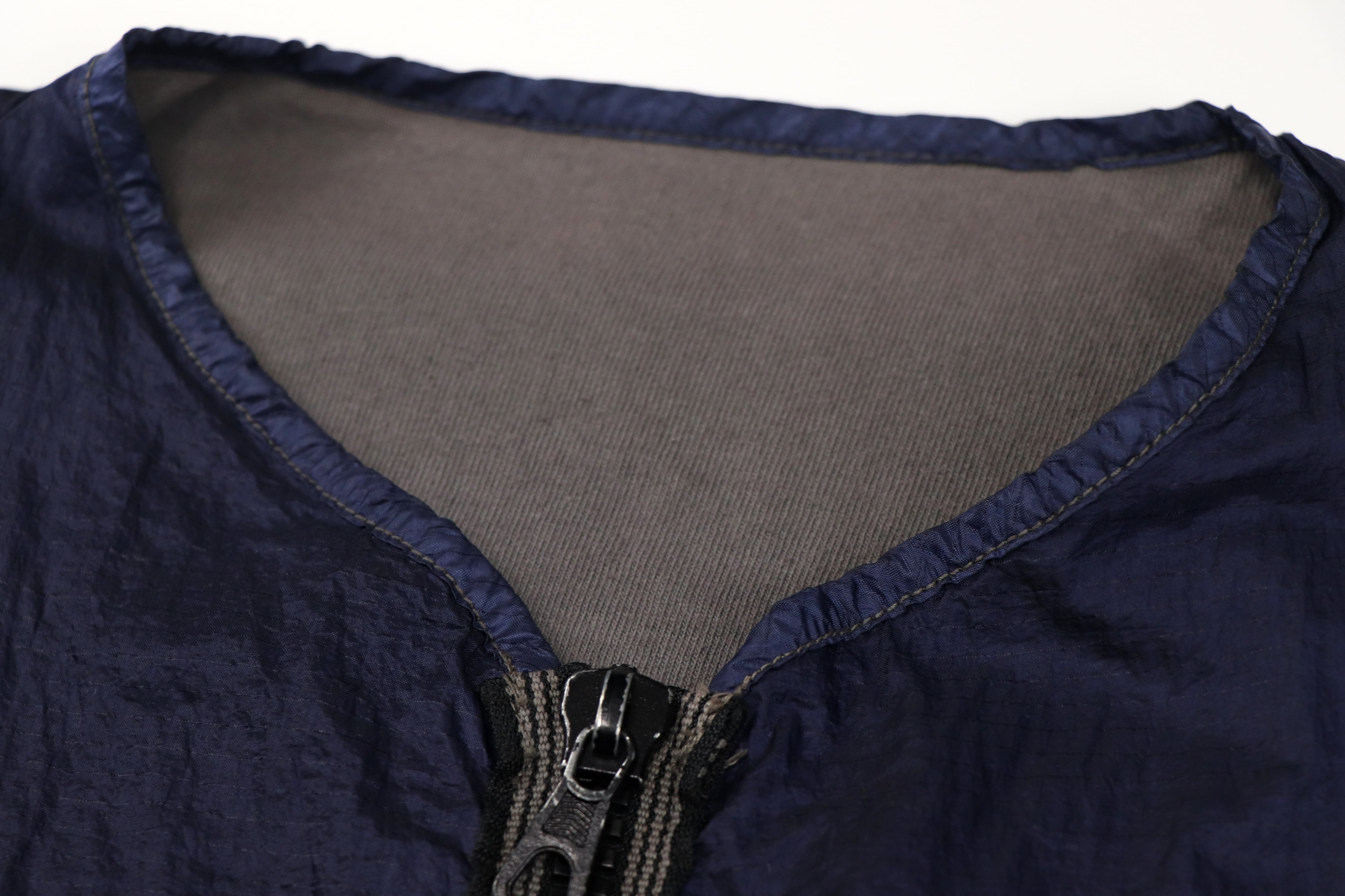 表面には光沢感のあるナイロンファブリックを使用。独特のシワ感と深みのあるネイビーカラーが特徴で、90年代Stone Islandらしいテクニカルな雰囲気を強く感じさせる一着です。軽量ながら存在感のある素材感で、シンプルなスタイリングにもアクセントを加えてくれます。