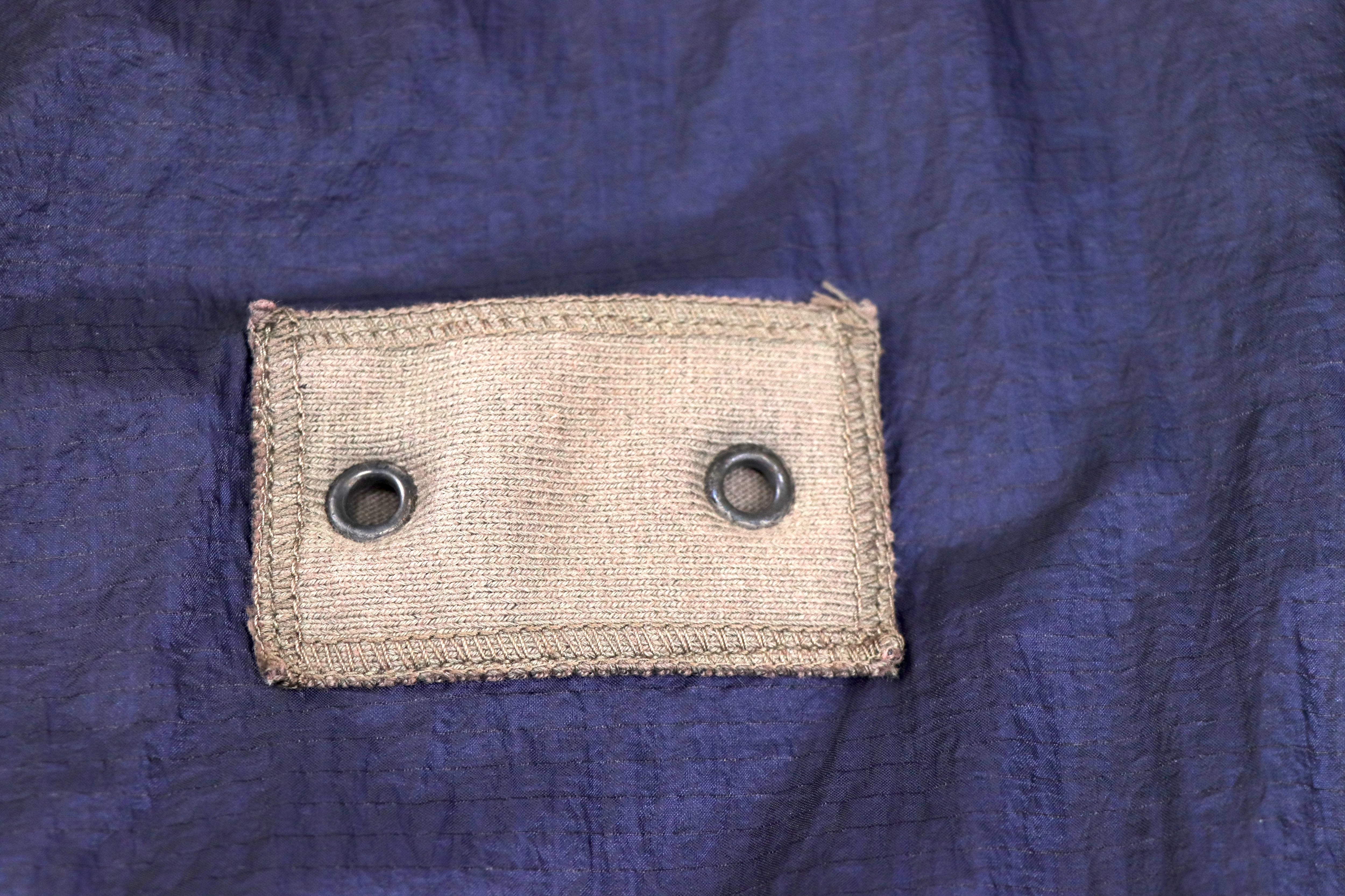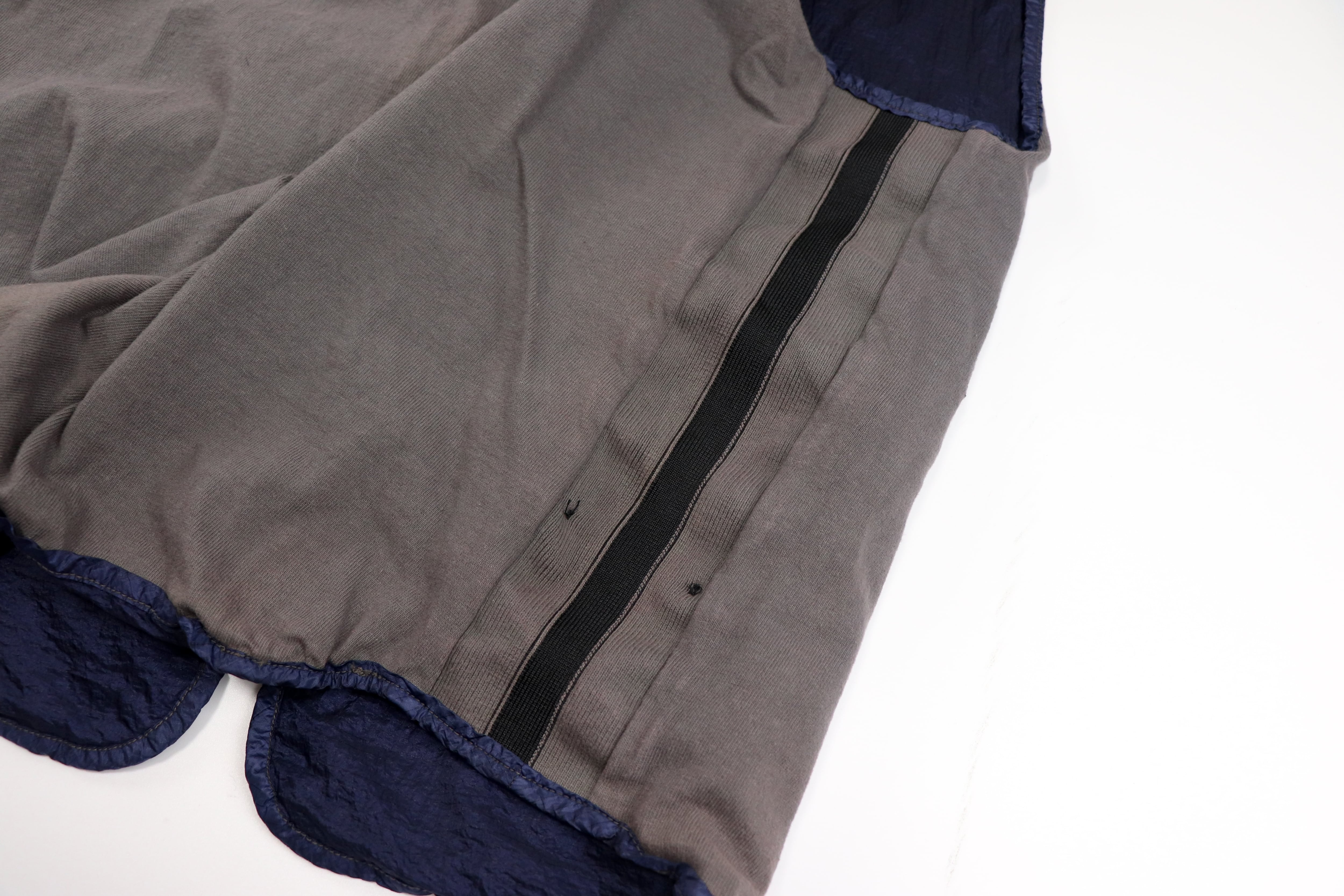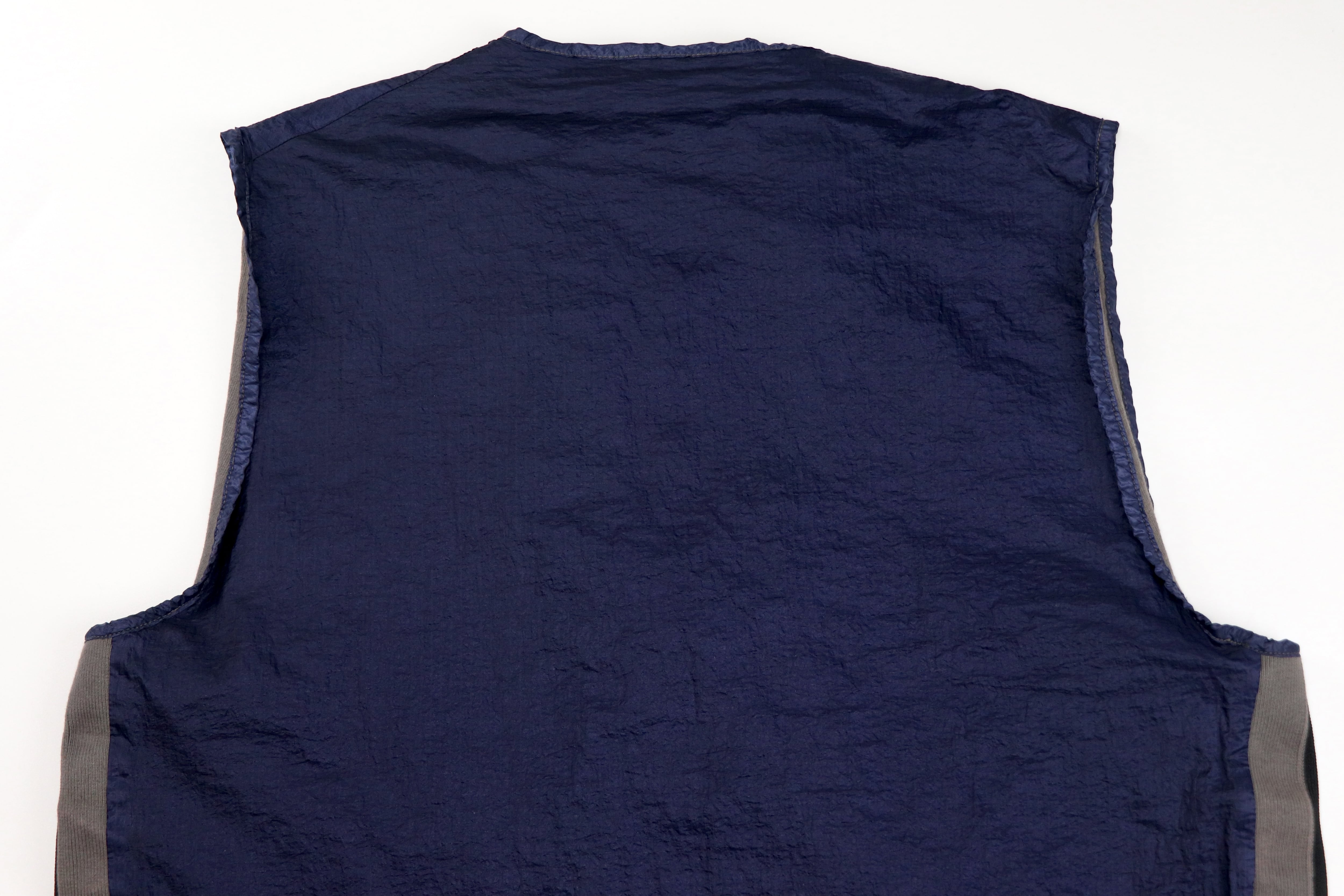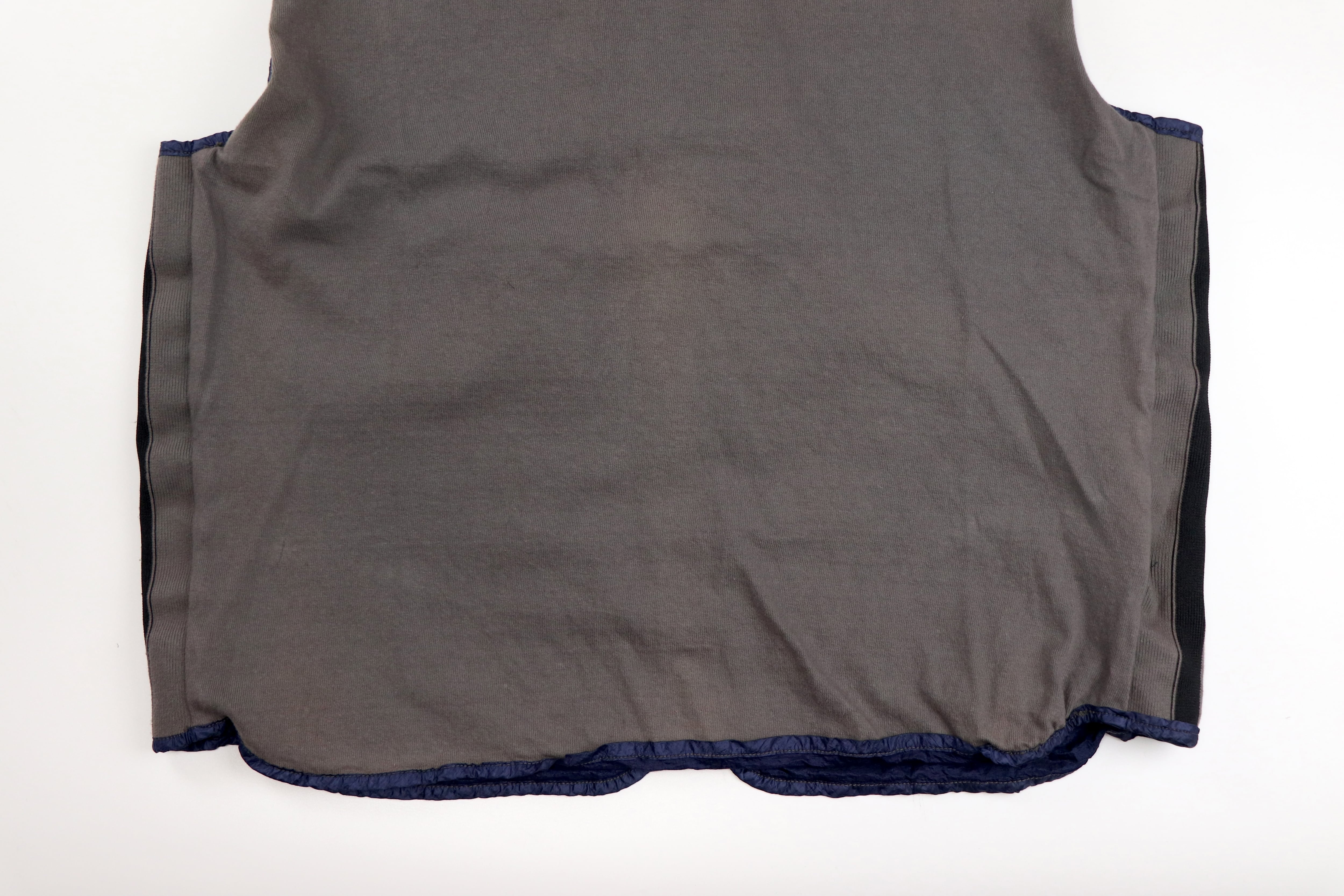 表面には光沢感のあるナイロンファブリックを使用。独特のシワ感と深みのあるネイビーカラーが特徴で、90年代Stone Islandらしいテクニカルな雰囲気を強く感じさせる一着です。軽量ながら存在感のある素材感で、シンプルなスタイリングにもアクセントを加えてくれます。