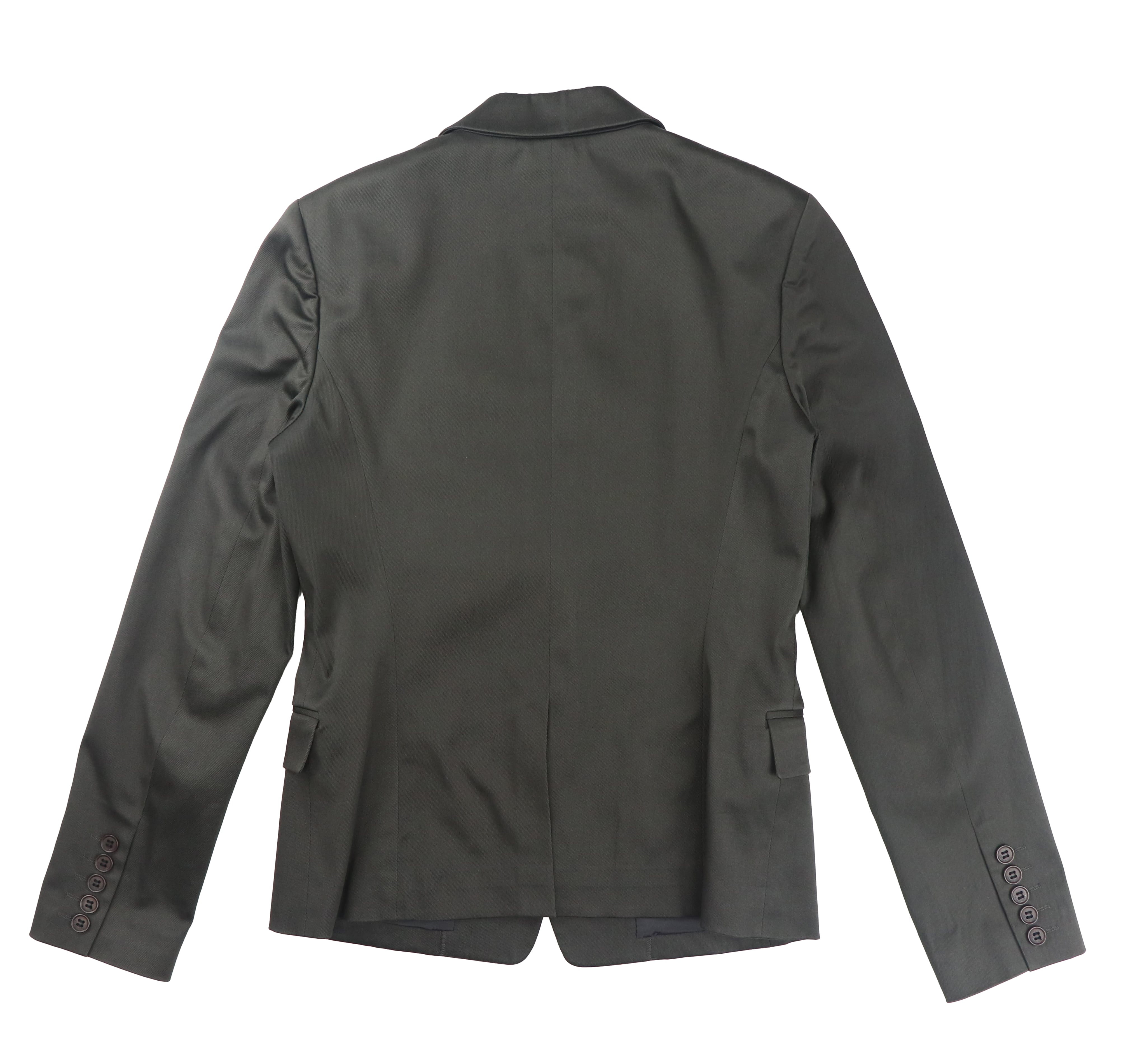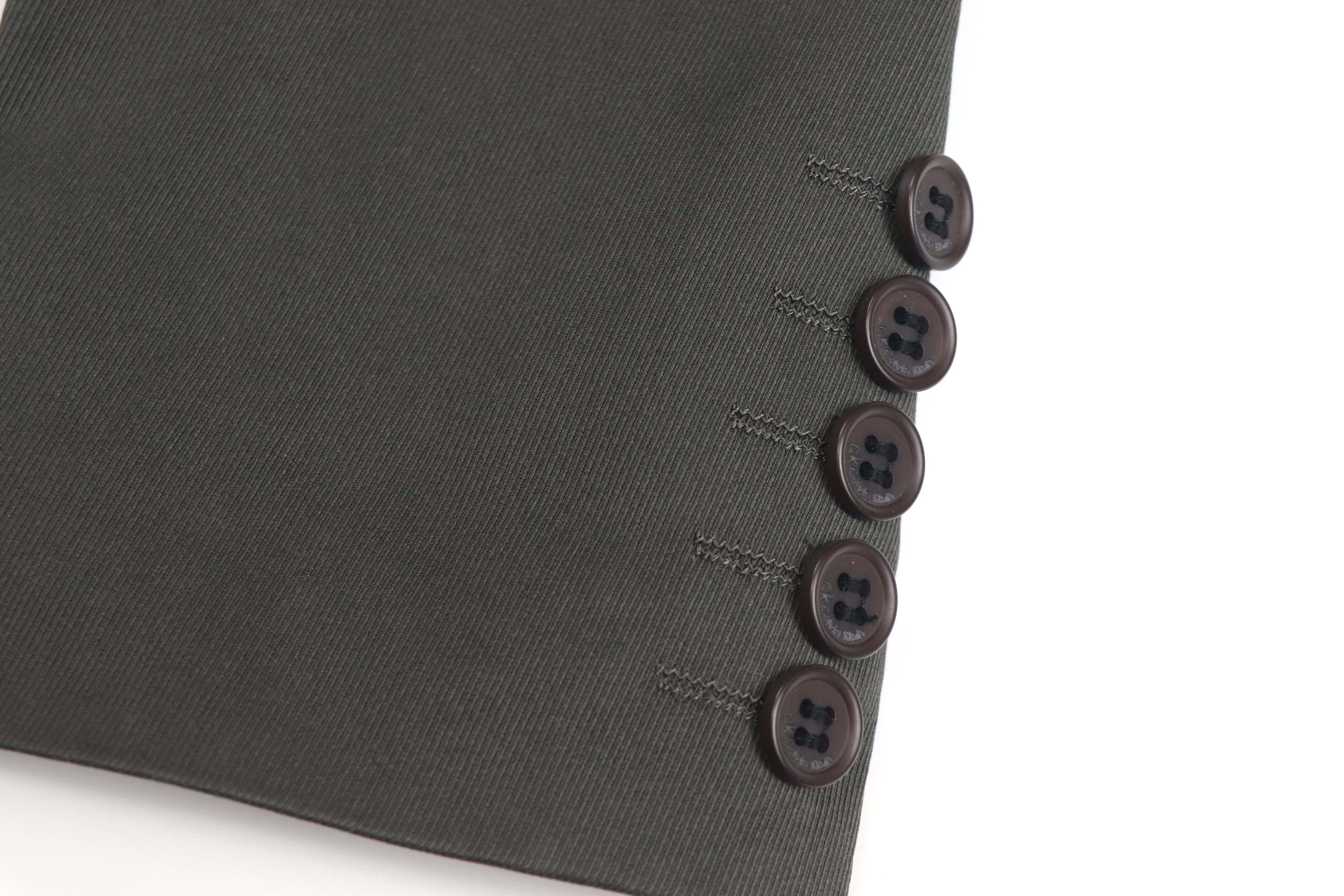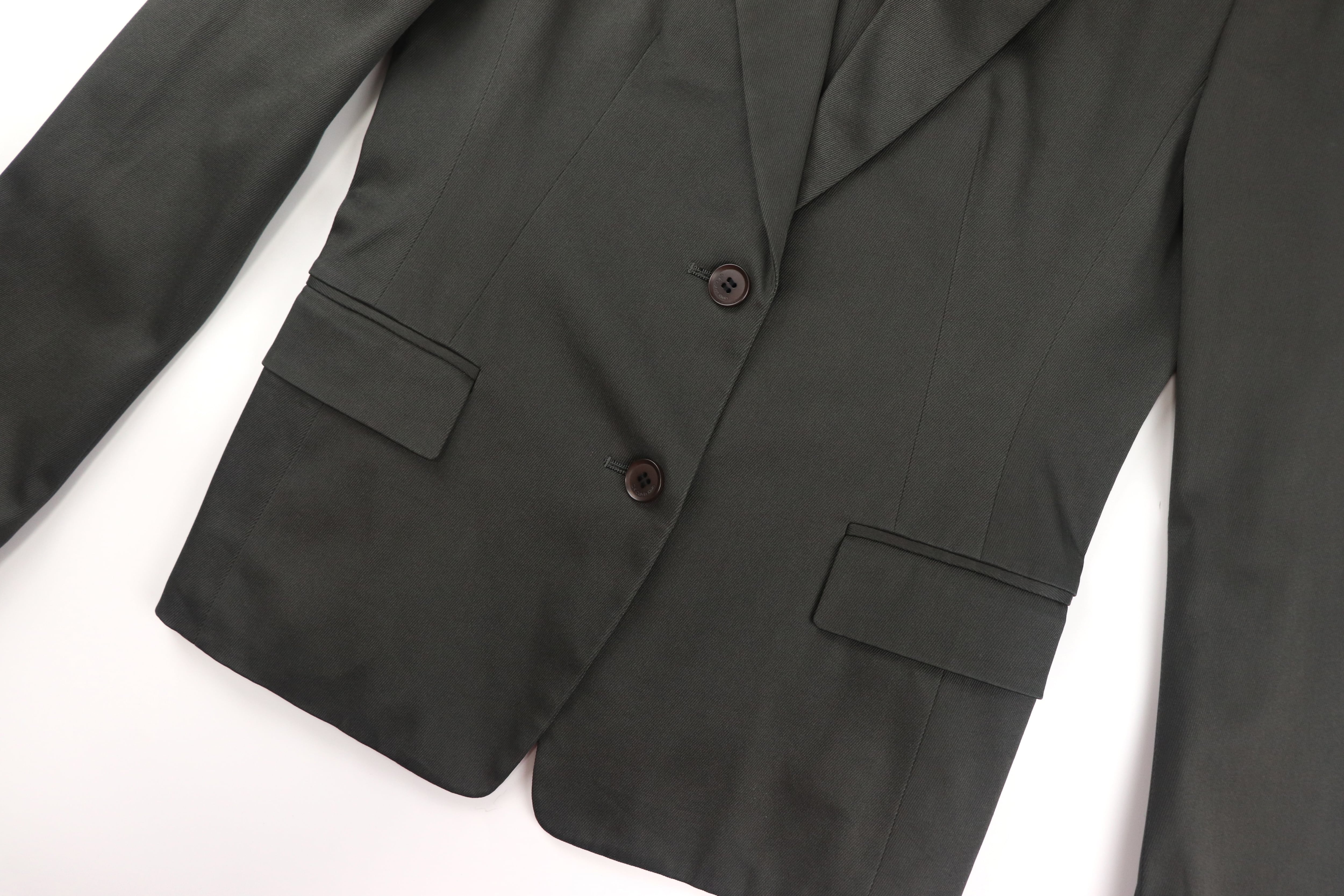 フロントはシングルの2ボタン仕様、ウエストにかけて自然にシェイプされた美しいシルエット。ラペルはやや広めで、クラシックとモダンのバランスが取れたデザインです。