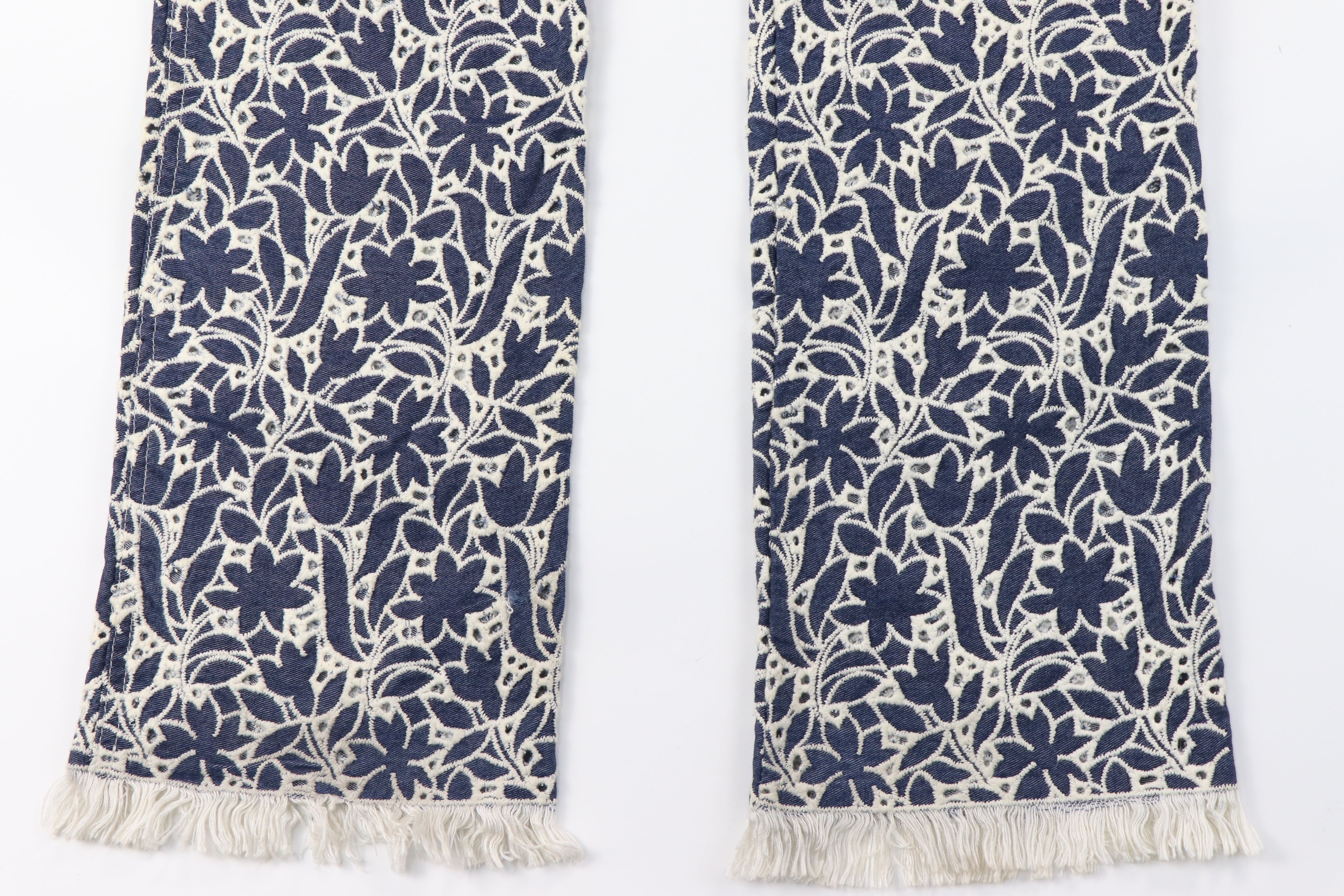裾にかけて広がるフラワーパターンの刺繍が印象的で、デニムの無骨さと繊細な装飾が共存するデザインです。